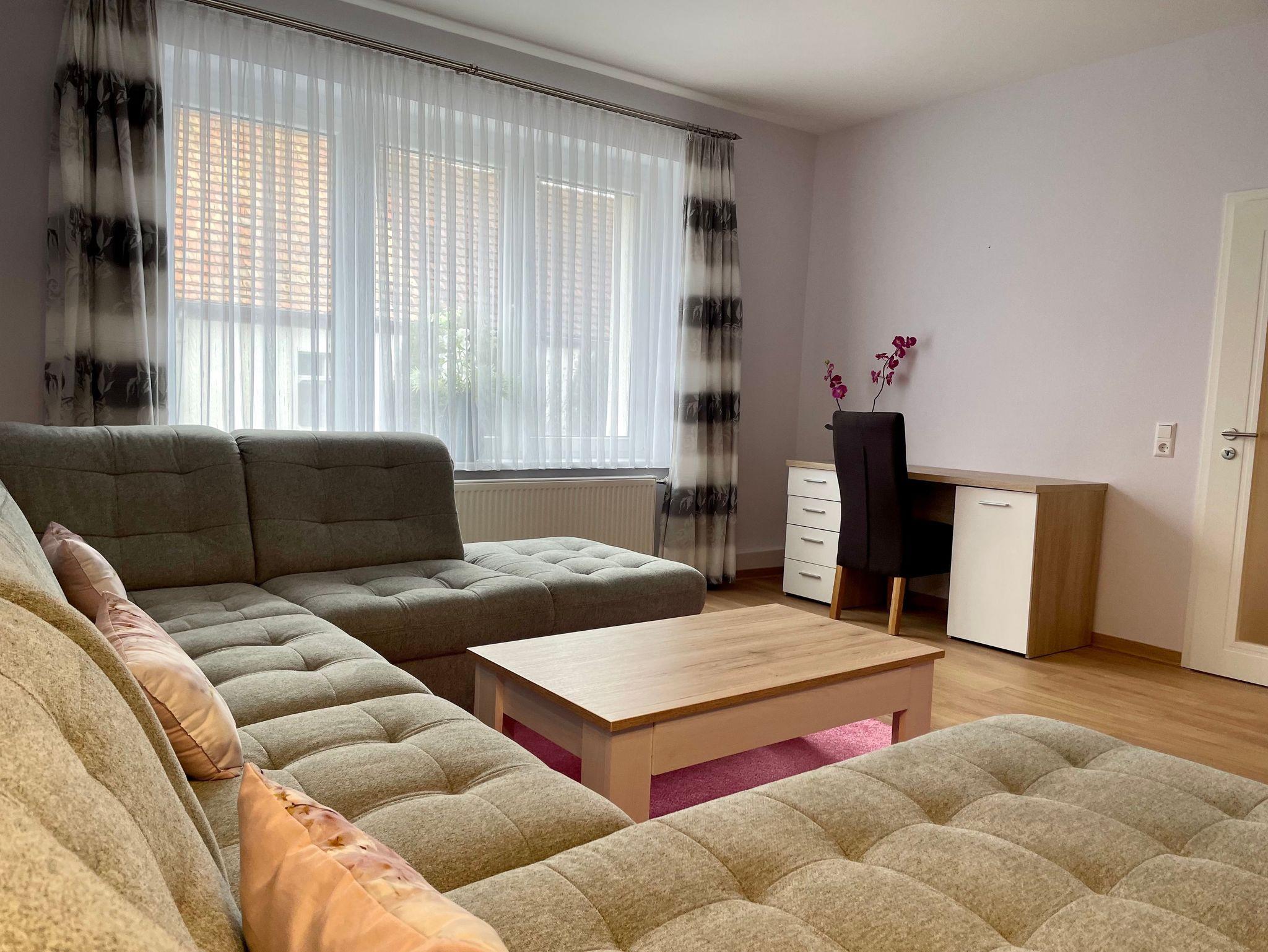 Das große Wohnzimmer ist mit einer komfortablen großen Wohnlandschaft ausgestattet und dient bei Bedarf als Aufbettung für zwei Personen. Im Wohnbereich befindet sich ein Sideboard mit einem großen Flachbildschirm sowie ein Schreibtisch. Der Schreibtisch steht am Fenster und ist für eine Workation optimal nutzbar.