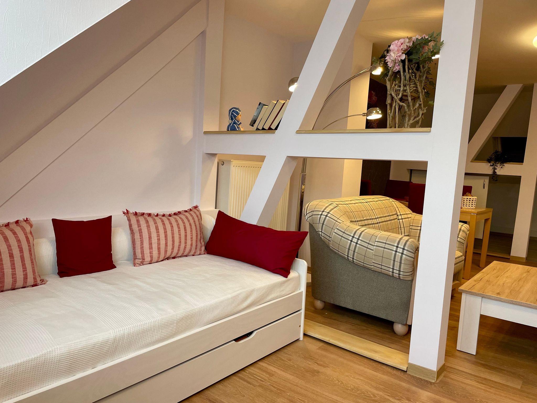 Eine Aufbettung mit einer Schlafcouch steht in einer separaten und ruhigen Ecke sowie ein gemütlicher Ohrensessel.