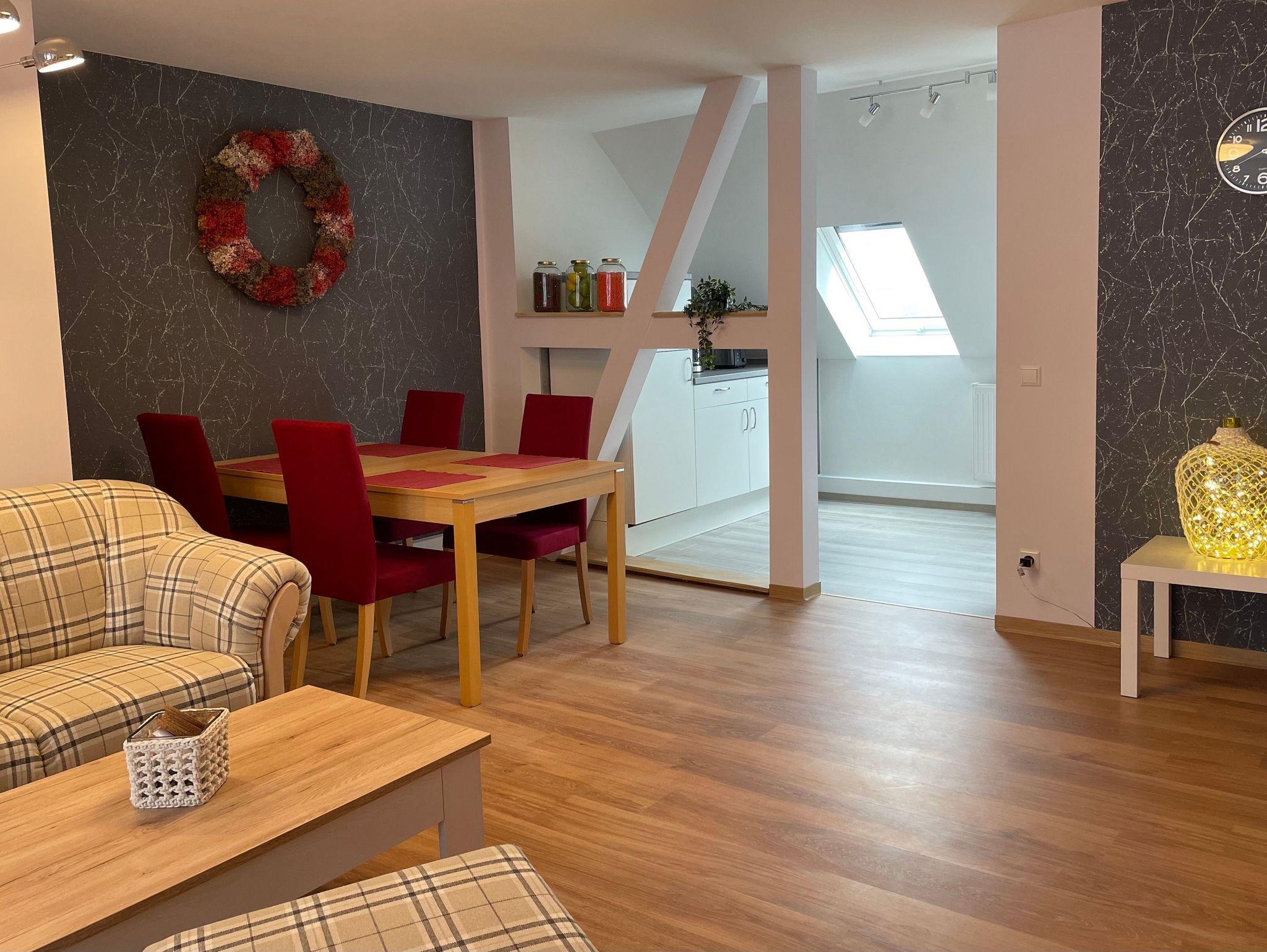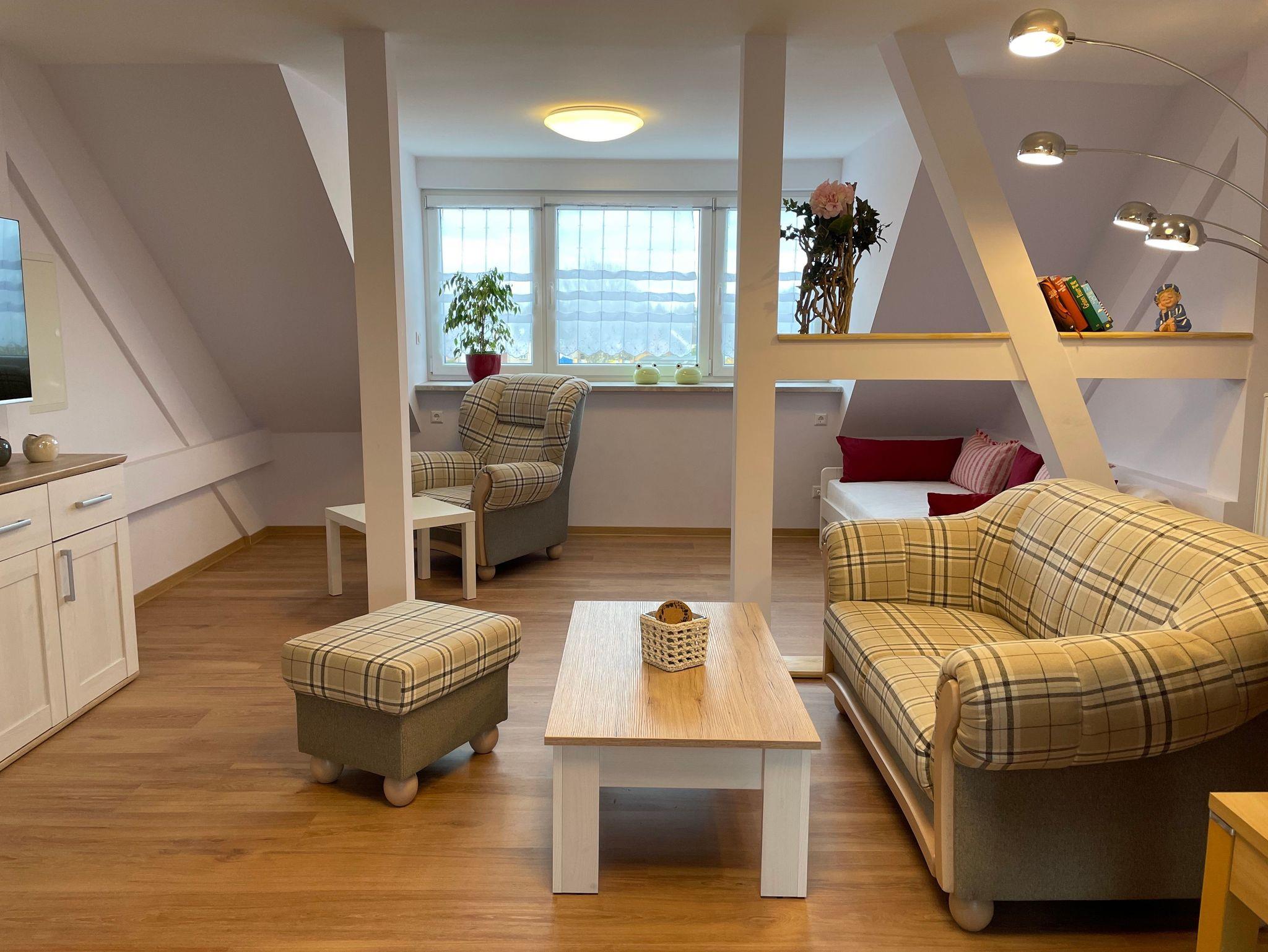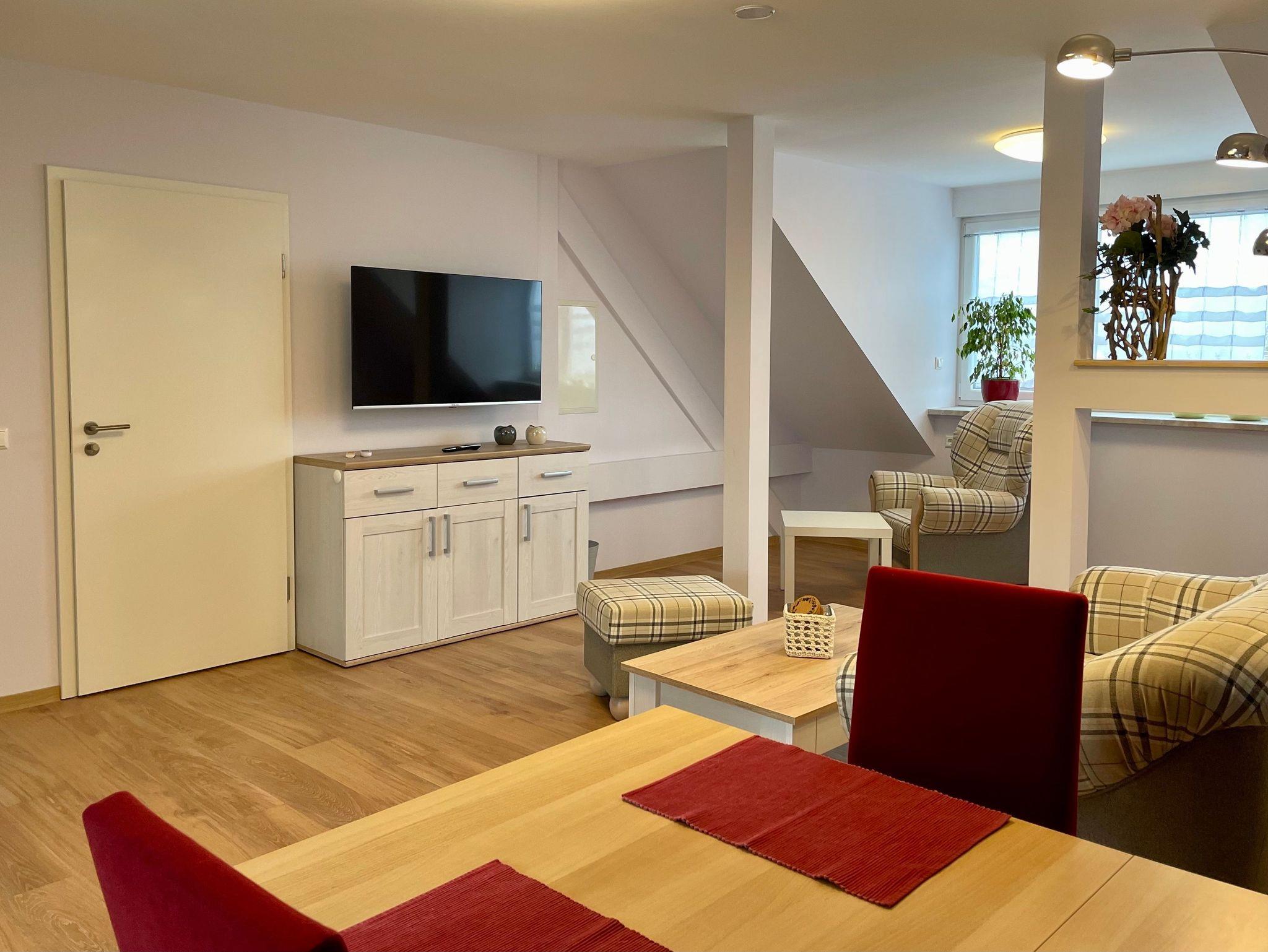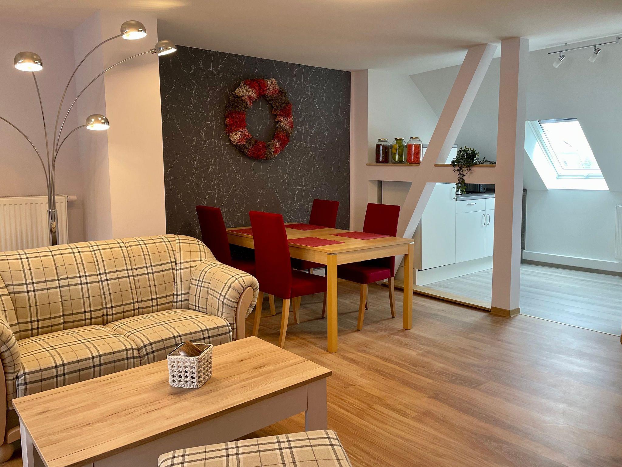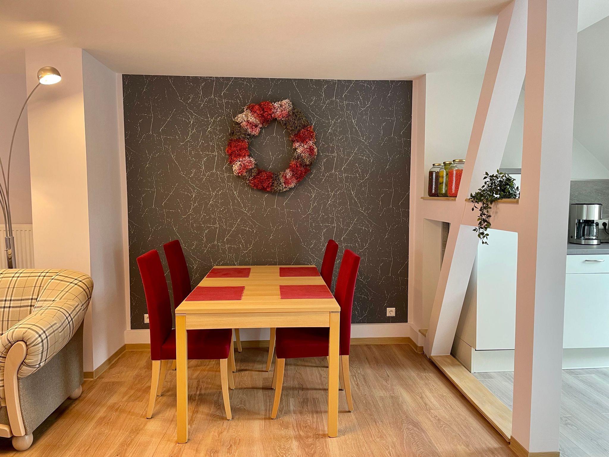 Die großzügige Ferienwohnung Nr. 4 liegt in der ersten Etage vom Haus Kusche und ist modern und hell eingerichtet. Über eine Holztreppe erreichen Sie die Wohnung für vier Personen auf der linken Seite.