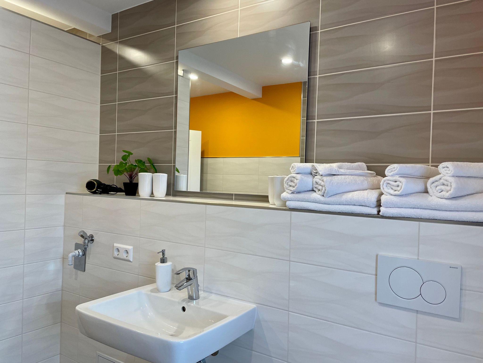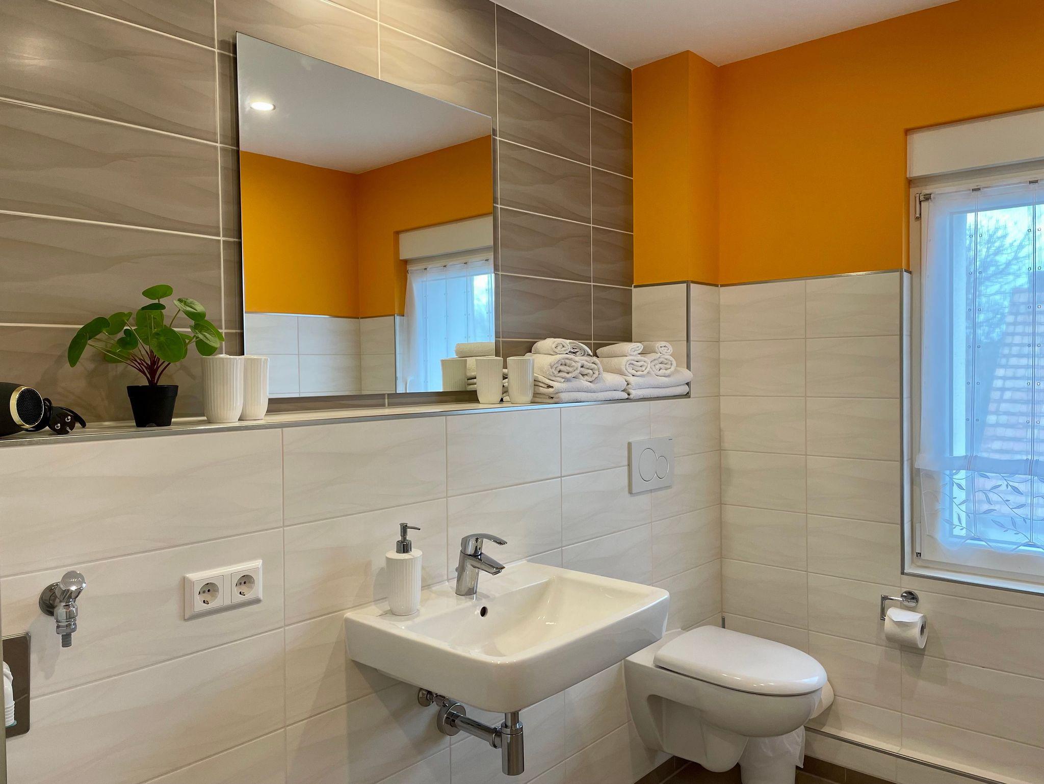 Das separate Bad mit Dusche/ WC hat eine ebenerdige große Dusche. Das helle Badezimmer hält Handtücher, Gästehandtücher, einen Föhn und Seife für Sie bereit. Es hat ein Fenster und ist verdunkelbar.