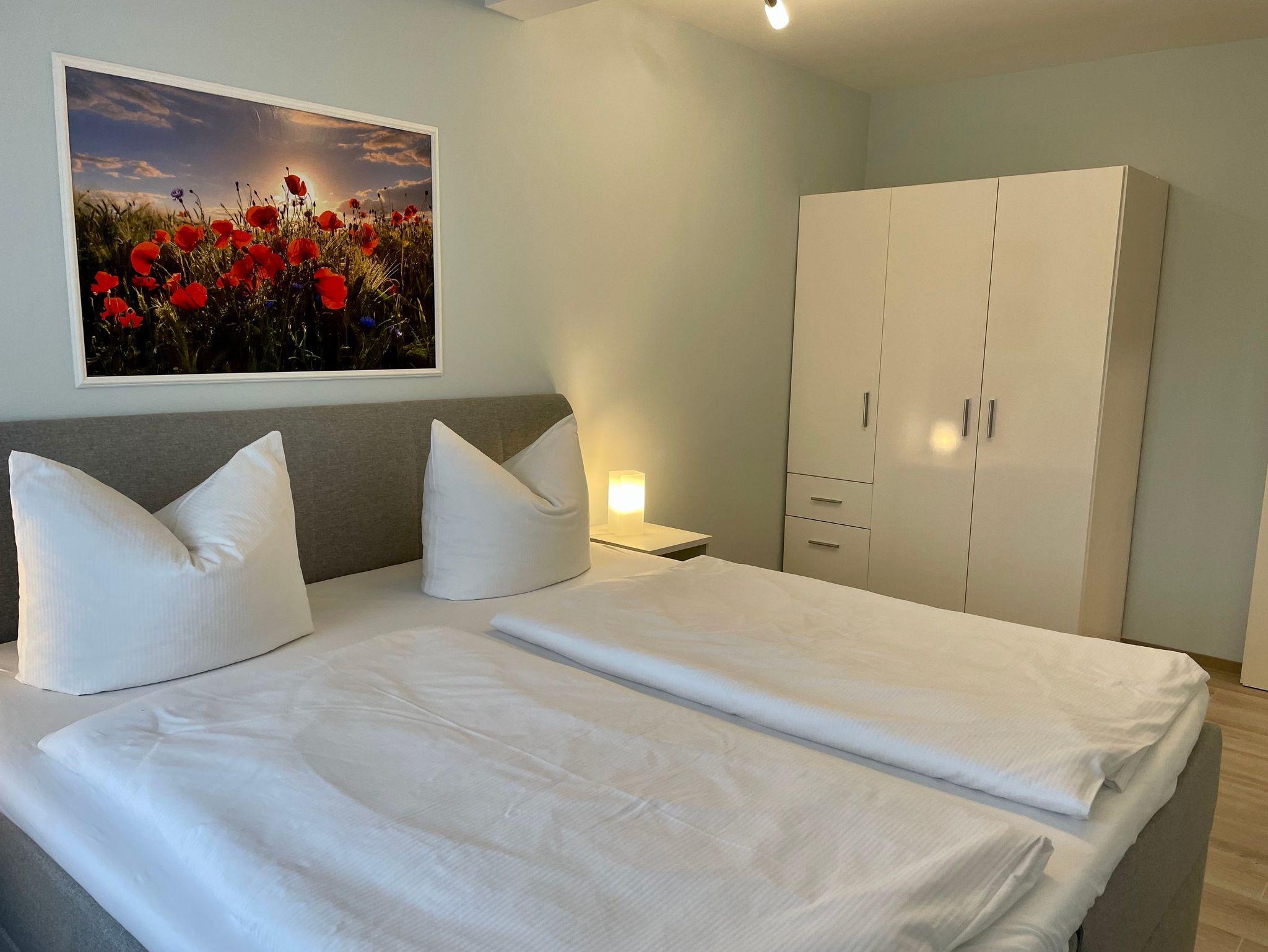 Das separate Schlafzimmer hat einen Blick zur ruhigen Straßenseite. Das Zimmer ist ausgestattet mit einem hochwertigen großen Boxspringbett, Kissen und kuscheligen Decken. Das Schlafzimmer ist vollständig verdunkelbar mit einer elektrischen Fensterjalousie. Der Kleiderschrank mit ausreichendem Stauraum sorgt für Ordung im Schlafbereich.