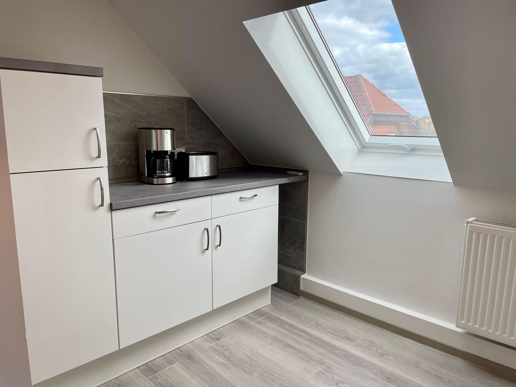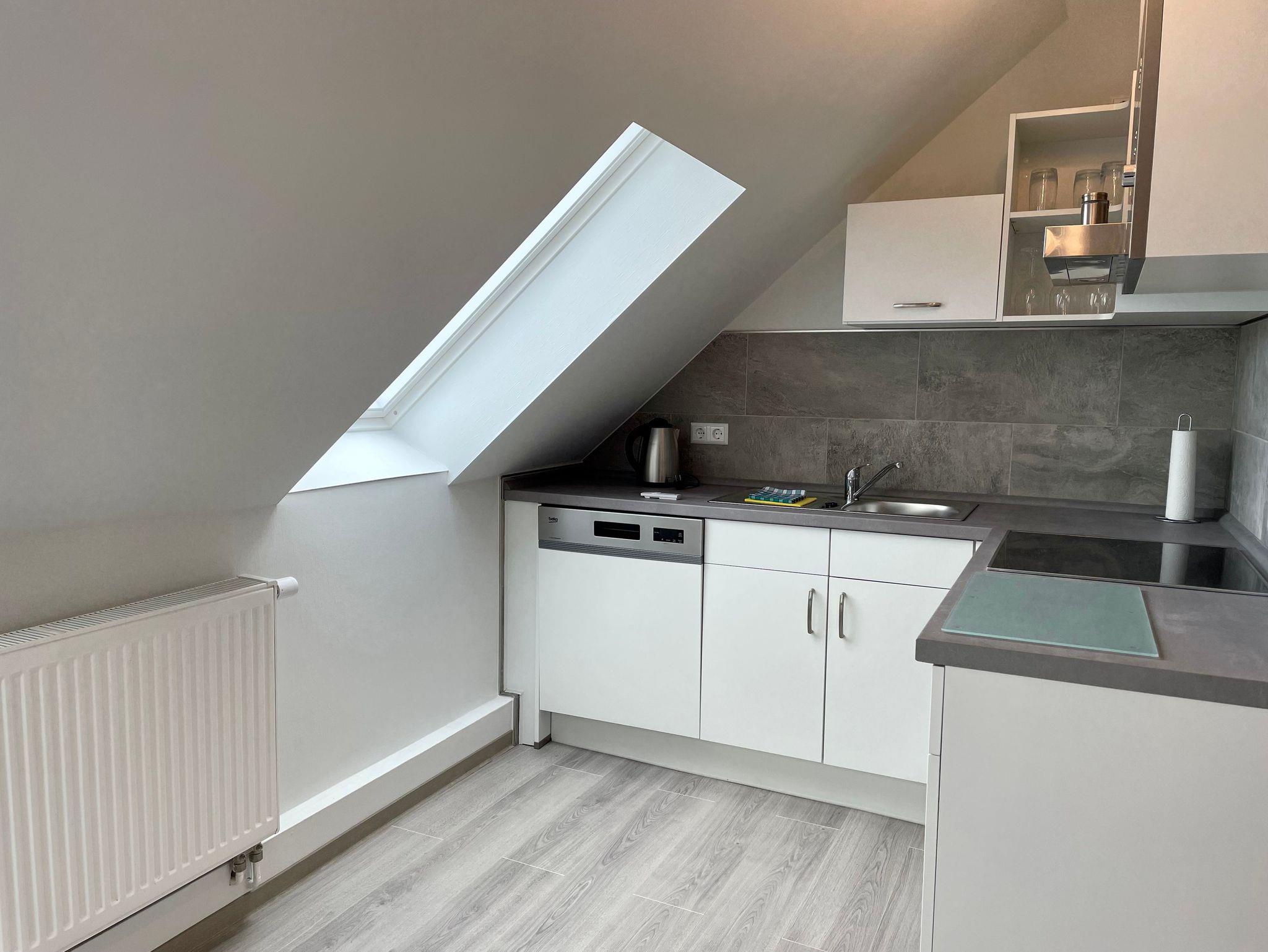 Die helle und moderne Küche verfügt über eine Kaffeemaschine, ein Toaster, einer Mikrowelle und einem Koch/- und Backofen. Ein moderner Geschirrspüler ist als Küchenhelfer dienlich.