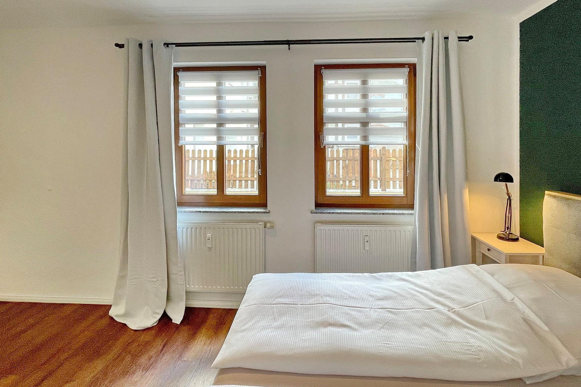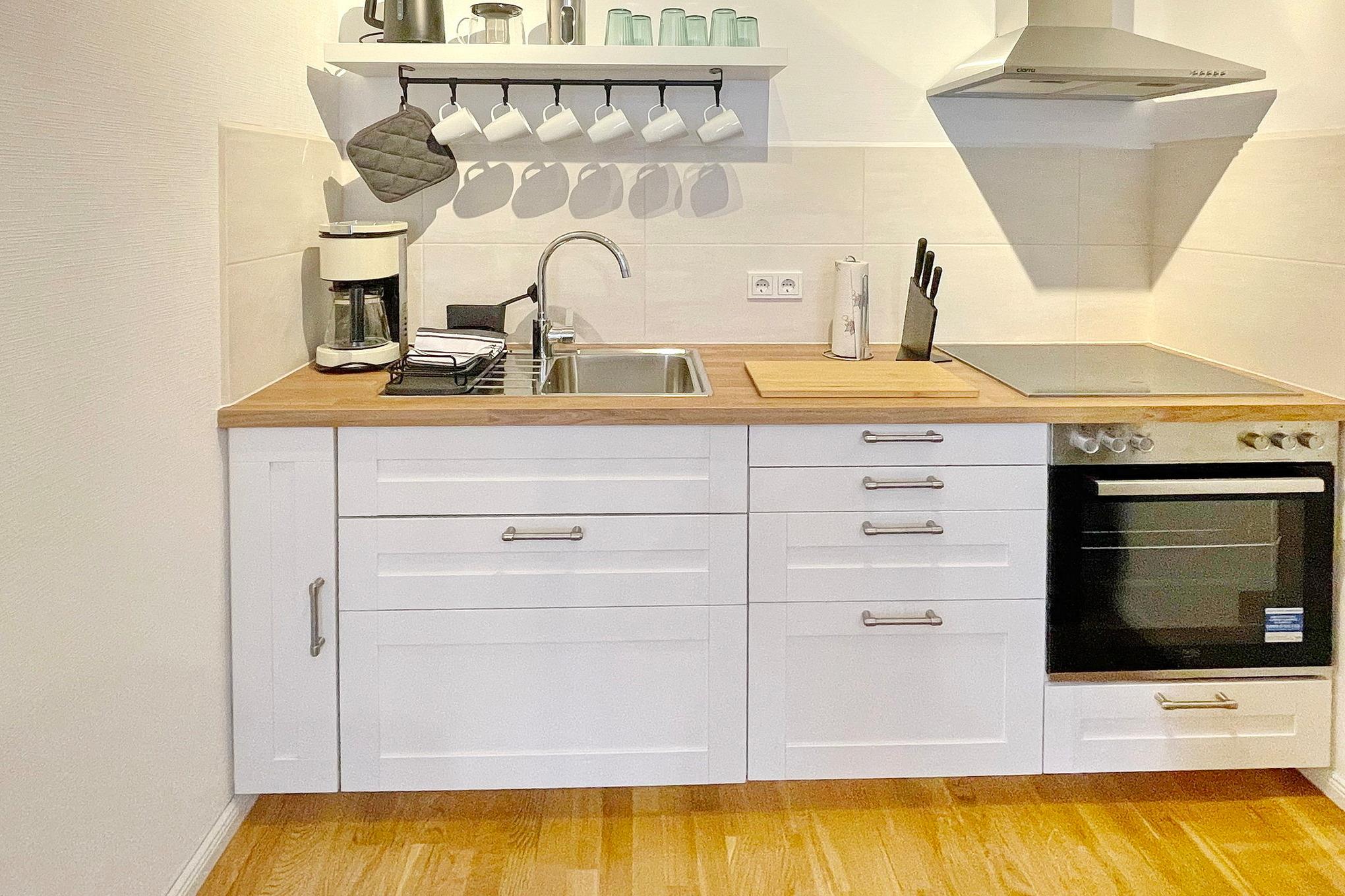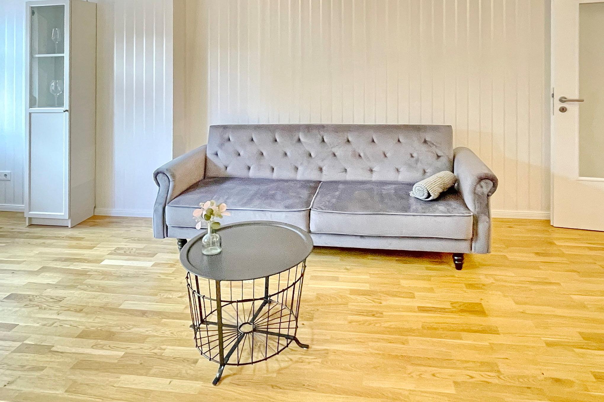 Diese freundlich eingerichtete Ferienwohnung im modernen Landhausstil bietet Ihnen ein großes Wohnzimmer mit Esstisch, Flachbild-TV, sowie eine gemütliche Schlafcouch. Die Küchenzeile ist in der Wohnzimmernische integriert. Sie ist voll ausgestattet, mit einem Backofen, einem Standkühlschrank und Gefriermöglichkeit. Vom Flur aus gehen Sie links ins geräumige Schlafzimmer mit einem Doppelbett. Das Zimmer befindet sich auf der Hinterseite der Wohnung und liegt somit zur Gartenseite, sehr ruhig. Das Bad ist mit einer Badewanne ausgestattet. Dies können Sie auch als Dusche mit einer Glasklappwand umfunktionieren. WC und Waschbecken mit Unterschrank, Handtuchhalter und Regal stehen Ihnen ebenfalls im Bad zur Verfügung.