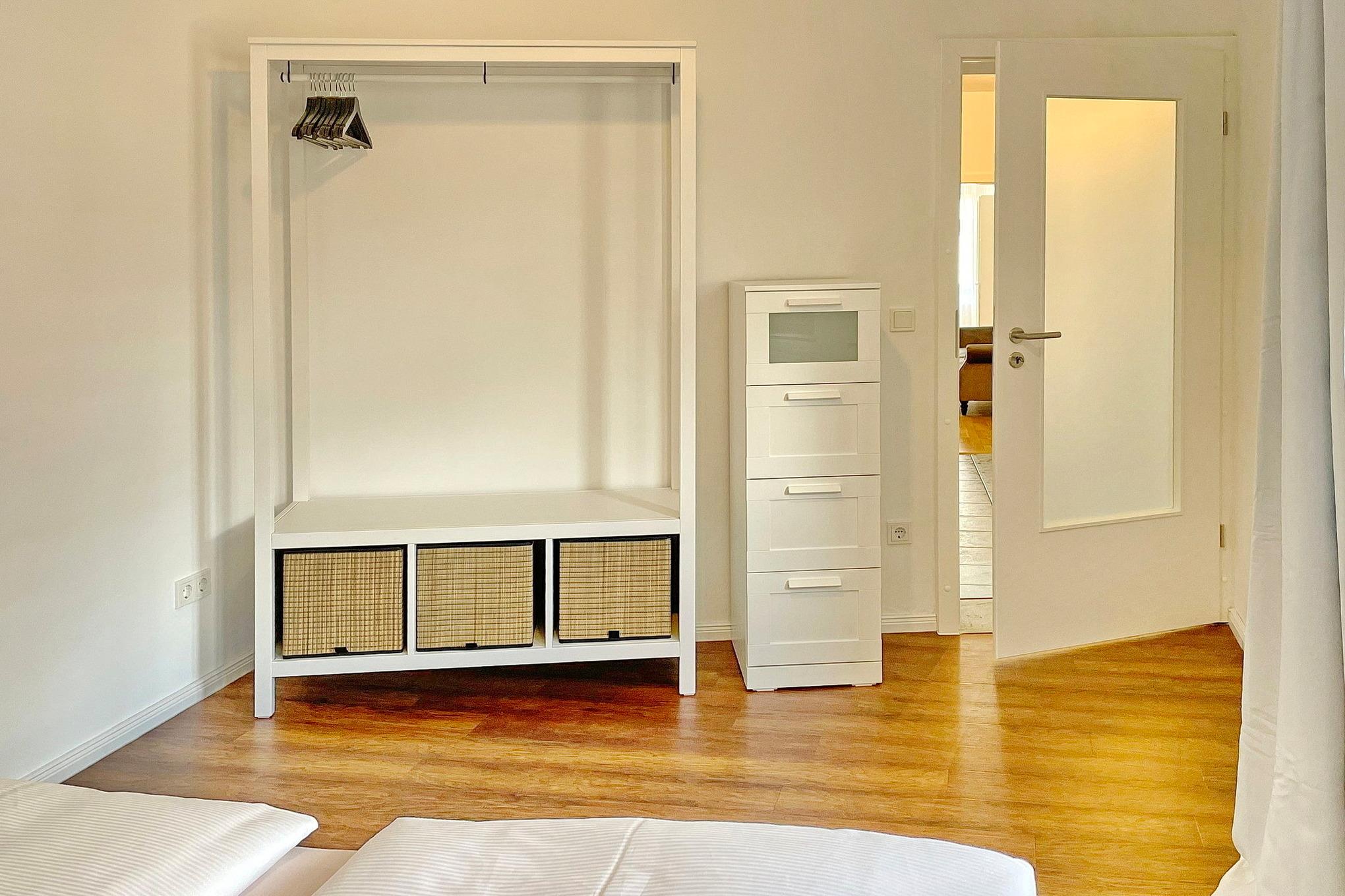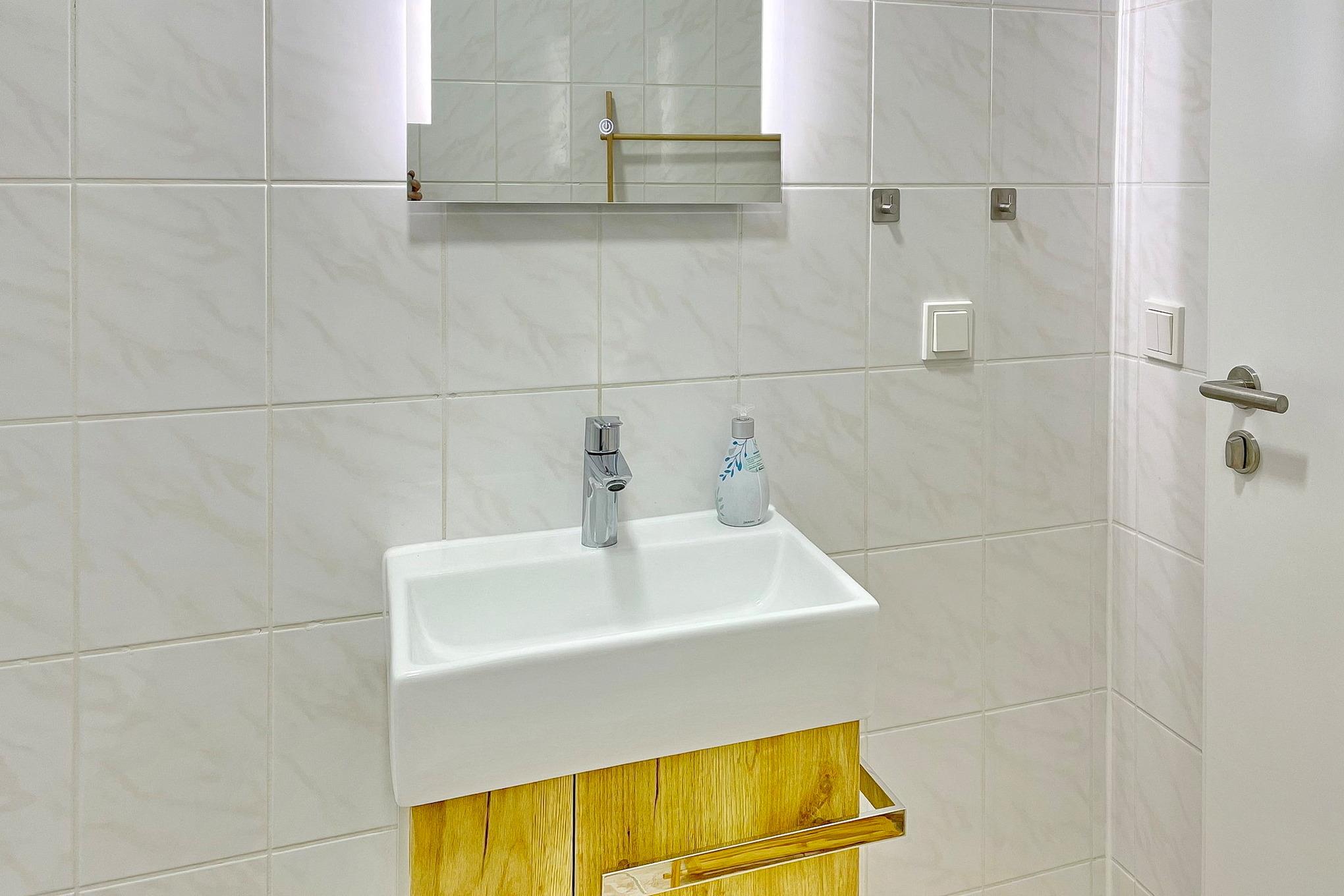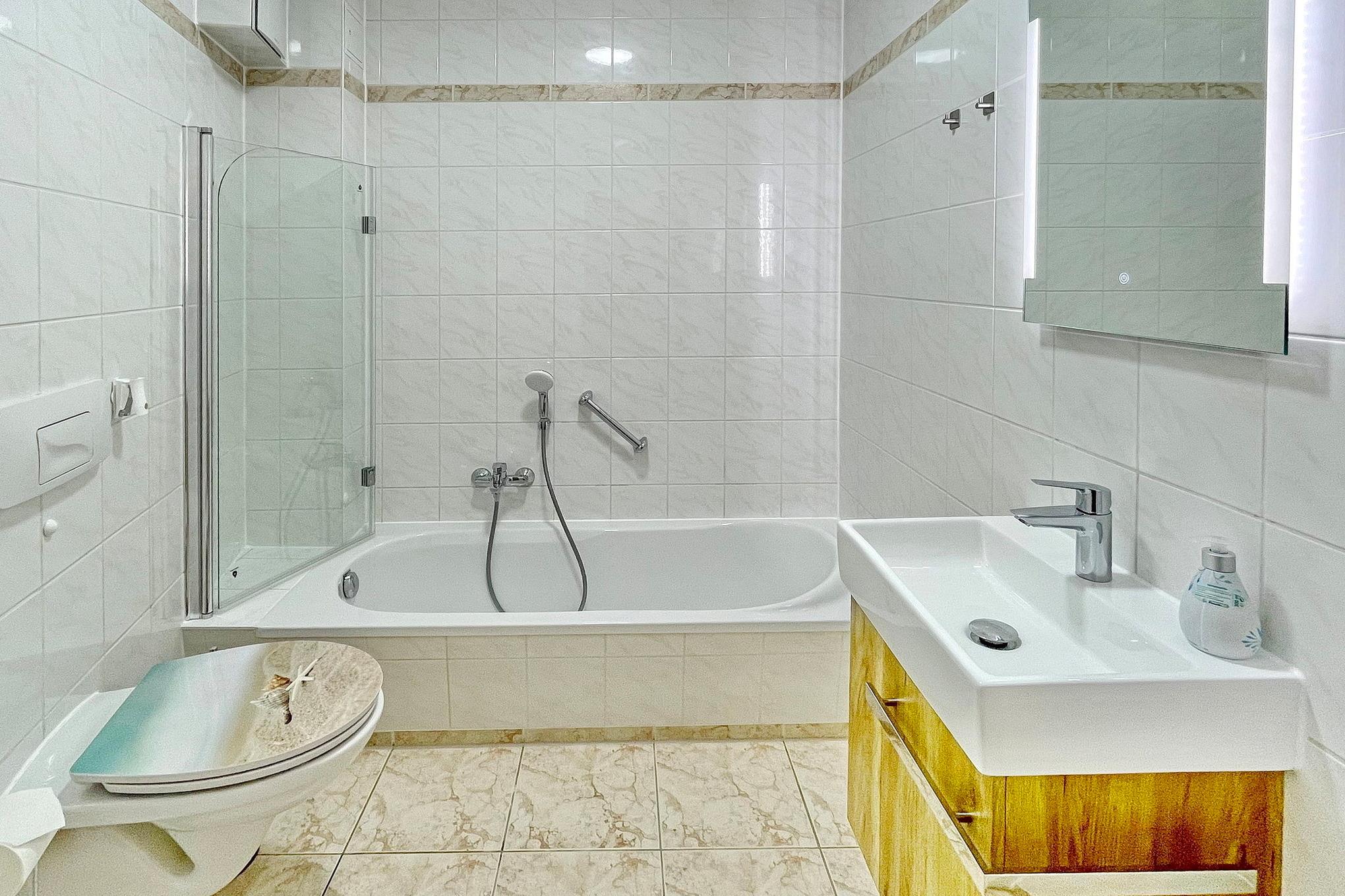 Diese freundlich eingerichtete Ferienwohnung im modernen Landhausstil bietet Ihnen ein großes Wohnzimmer mit Esstisch, Flachbild-TV, sowie eine gemütliche Schlafcouch. Die Küchenzeile ist in der Wohnzimmernische integriert. Sie ist voll ausgestattet, mit einem Backofen, einem Standkühlschrank und Gefriermöglichkeit. Vom Flur aus gehen Sie links ins geräumige Schlafzimmer mit einem Doppelbett. Das Zimmer befindet sich auf der Hinterseite der Wohnung und liegt somit zur Gartenseite, sehr ruhig. Das Bad ist mit einer Badewanne ausgestattet. Dies können Sie auch als Dusche mit einer Glasklappwand umfunktionieren. WC und Waschbecken mit Unterschrank, Handtuchhalter und Regal stehen Ihnen ebenfalls im Bad zur Verfügung.