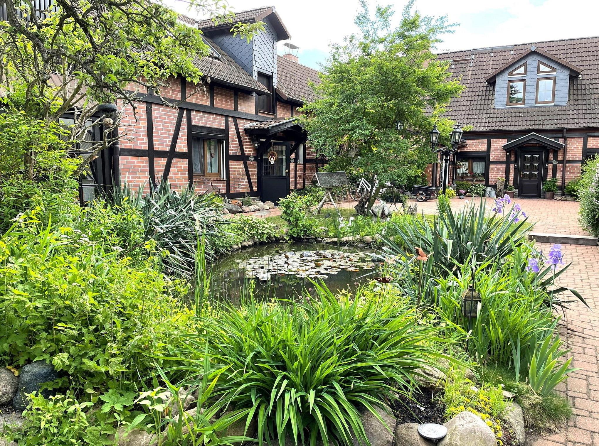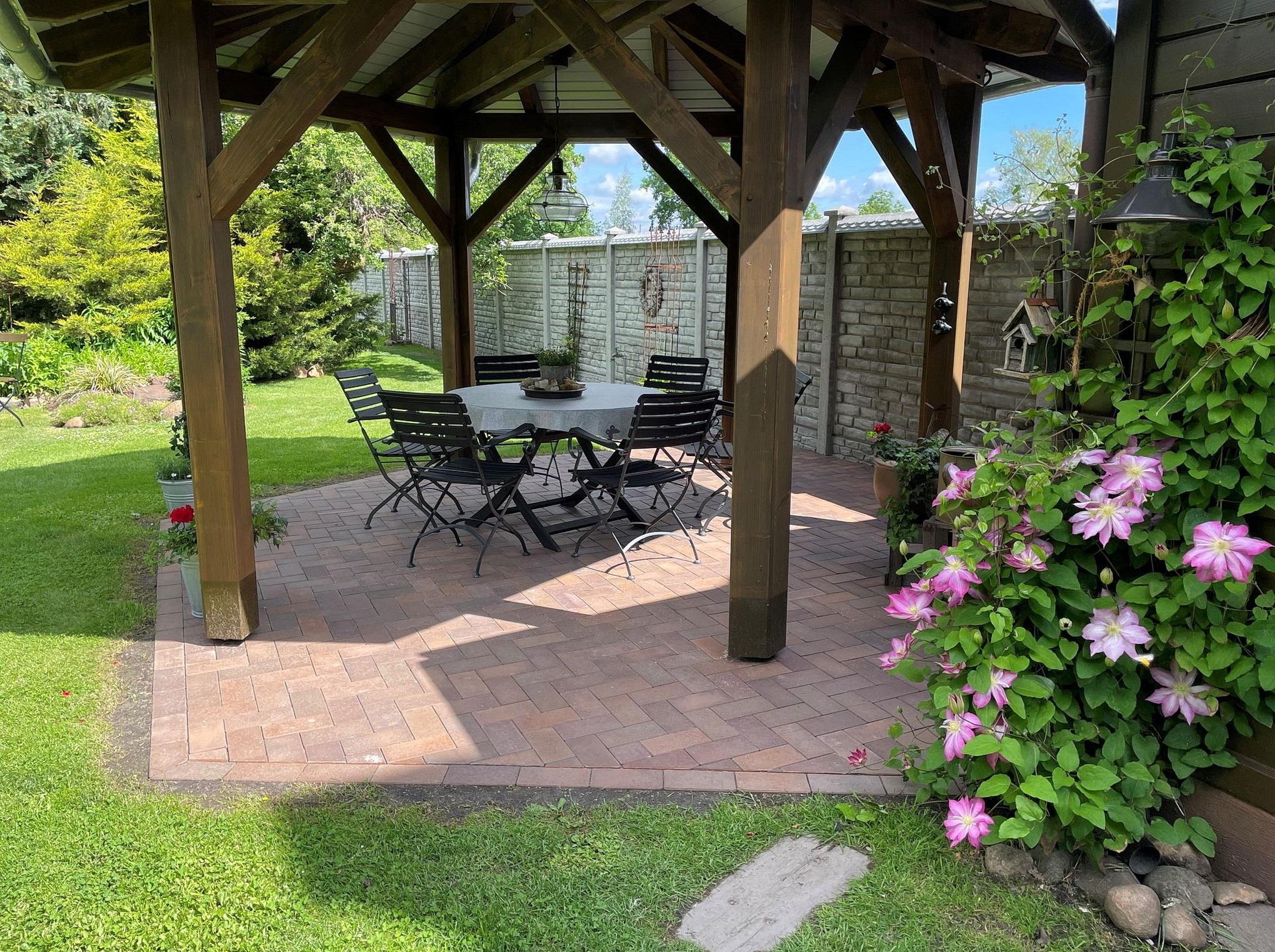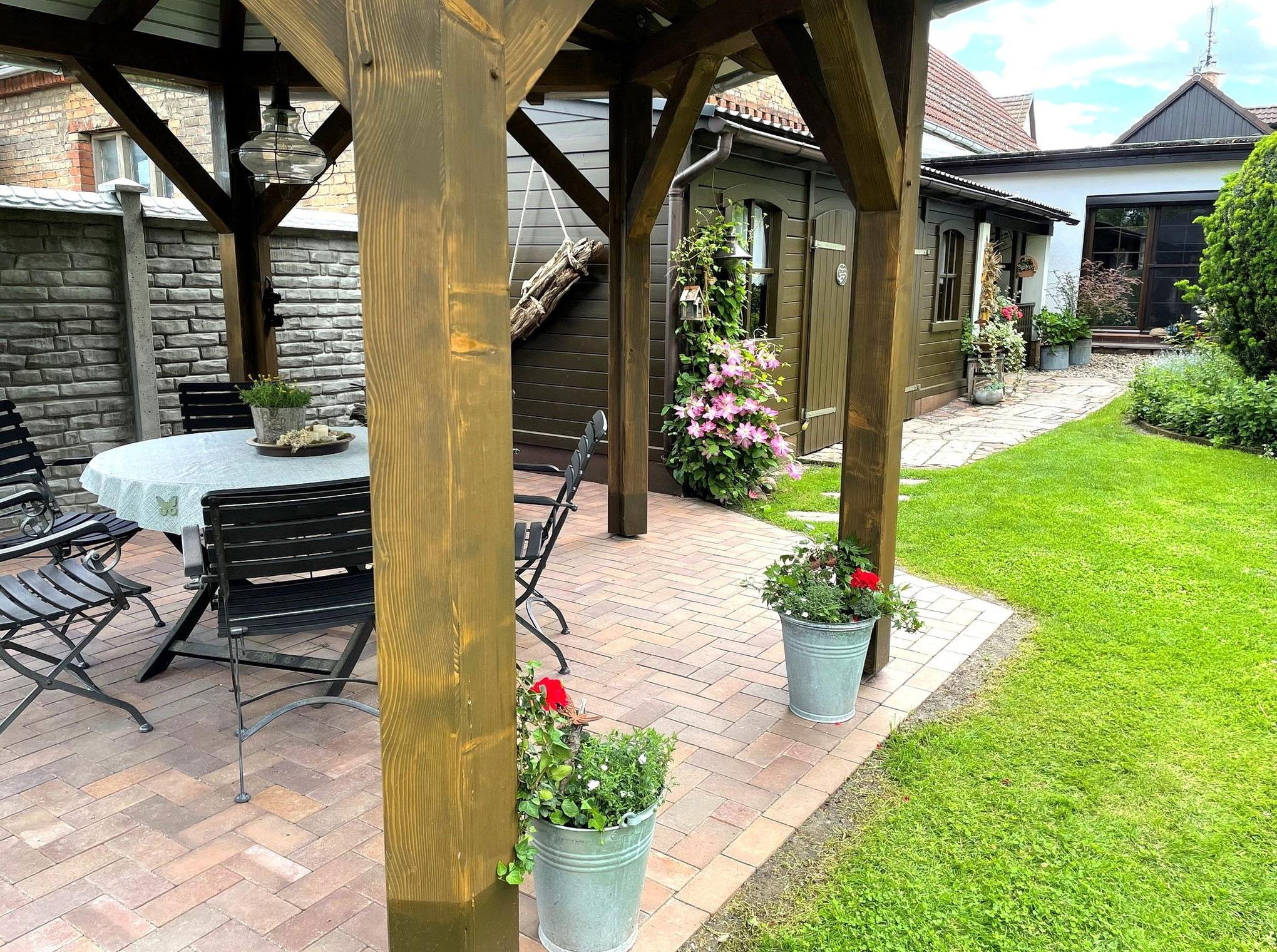 Die Ferienwohnung Rosentraum befindet sich in der oberen Etage des Hinterhauses. Sie haben direkten Zugang zum Garten, welcher liebevoll mit kleinen Sitzecken zum Verweilen ausgestattet ist.