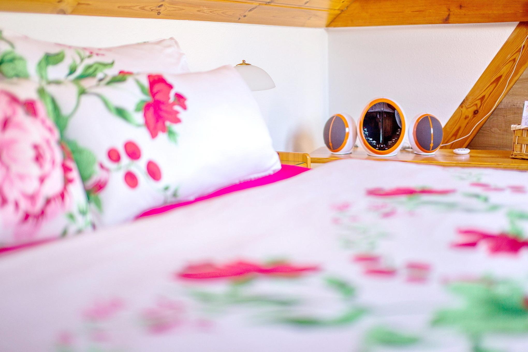 Die 25 qm große 1-Raum-Wohnung ist ideal ausgestattet für zwei Personen. Sie ist hochwertig und mit Liebe zum Detail romantisch eingerichtet, die warmen Farben erschaffen eine Atmosphäre zum Wohlfühlen. Die Pantryküche befindet sich unter einer Dachschräge und ist ausgestattet mit einer Spüle, einem Ceran Herd mit zwei Platten, Kühlschrank mit Gefrierfach, Wasserkocher Toaster und Kaffeemaschine. Der Schlafraum bietet neben einem großzügigen Doppelbett (1,80 x 2,00 m), einem Kleiderschrank mit viel Stauraum auch einen Essbereich mit gemütlicher Sitzecke sowie einem Sofa. Zur Unterhaltung bietet die Wohnung einen Flachbild TV und eine Stereoanlage. Der Schlafraum verfügt über ausreichend Platz für ein Babyreisebett. Das moderne Bad mit Fliesen in Holzoptik ist mit einer Sitzbadewanne und einer Toilette ausgestattet. Über dem Waschbecken befindet sich ein großer beleuchteter Spiegel. Außerdem sind ein Föhn sowie Handtuchtrockner vorhanden. Aus Rücksicht auf andere Gäste ist das Rauchen in der Wohnung nicht gestattet. WLAN ist kostenfrei.