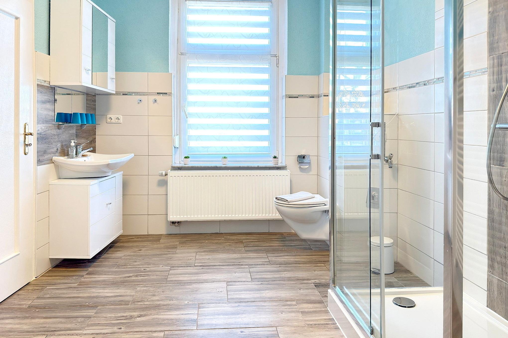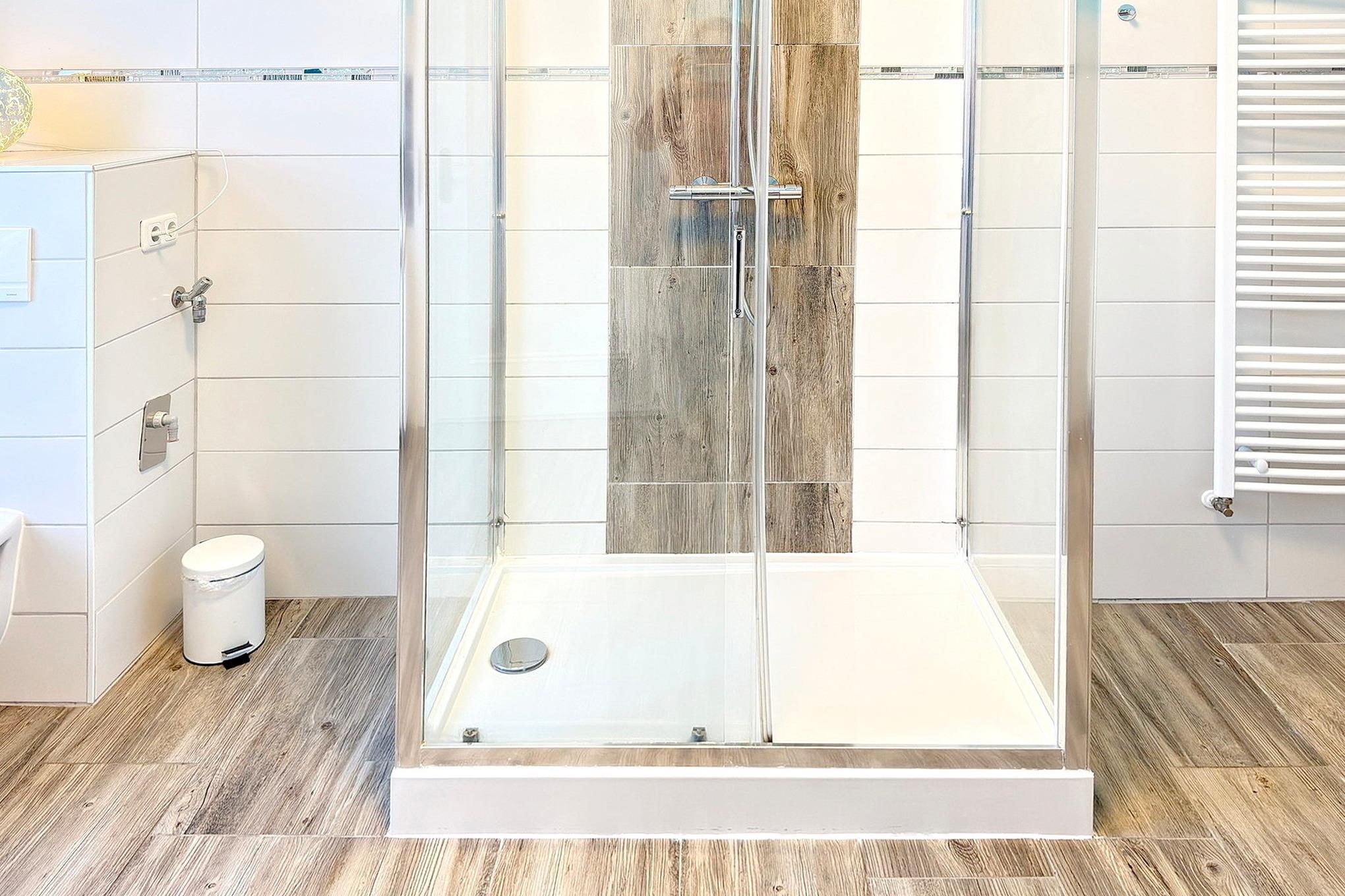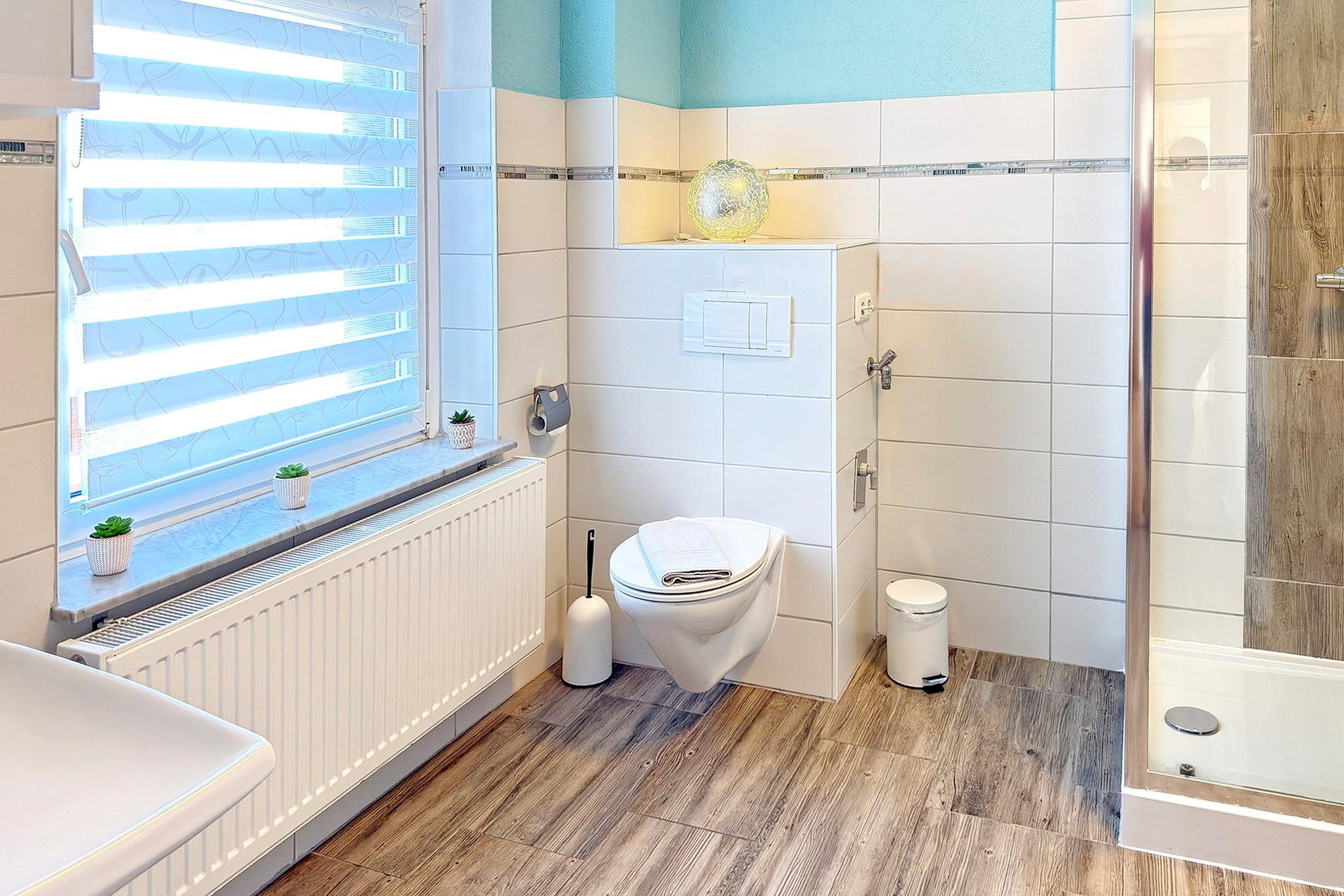 Über den Haupteingang und Flur mit Treppe gelangen Sie zum Eingang der Ferienwohnung in der 1. Etage. Sie kommen in die Wohnküche rein, rechts ist das Wohnzimmer und geradezu das Bad. Die vollausgestatte Küche bietet Ihnen alles was Sie zum Essenbreiten brauchen, einen Esstisch mit 6 Plätzen, einen Elektroherd (Cerankochfeld, 4 Platten), Backofen, Dunstabzugshaube, Geschirrspüler, Kühlschrank (120 l), Mikrowelle, Kaffeemaschine, Toaster und elektrischem Wasserkocher, sowie zahlreiche Küchenutensilien. Das Bad mit Dusche, einem Waschbecken, WC, Föhn, Fenster und moderne große Dusche[nbsp] mit 5 Funktionen wie z.B. Wasserfall und Regendusche werden Sie rundum zufrieden stellen. Im geräumigen Wohnzimmer haben Sie eine Couch und ein Kamin für die gemütlichen Stunden im Urlaub, einen Flachbild-TV, sowie ein Radio. Von dort aus gehen Sie in beide Schlafzimmer rechts und links. Sie haben ein Schlafzimmer mit einem Doppelbett, ein Kindergitterbett mit Wickelauflage, sowie einen Flachbild-TV. Im anderen Schlafzimmer haben Sie ein ein Doppelbett, ein Einzelbett mit Ausziehfunktion für ein Doppelbett.