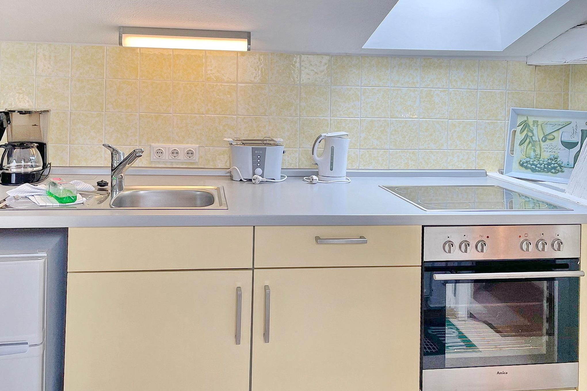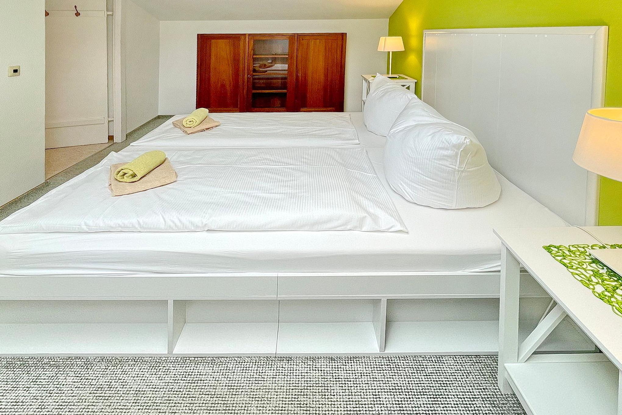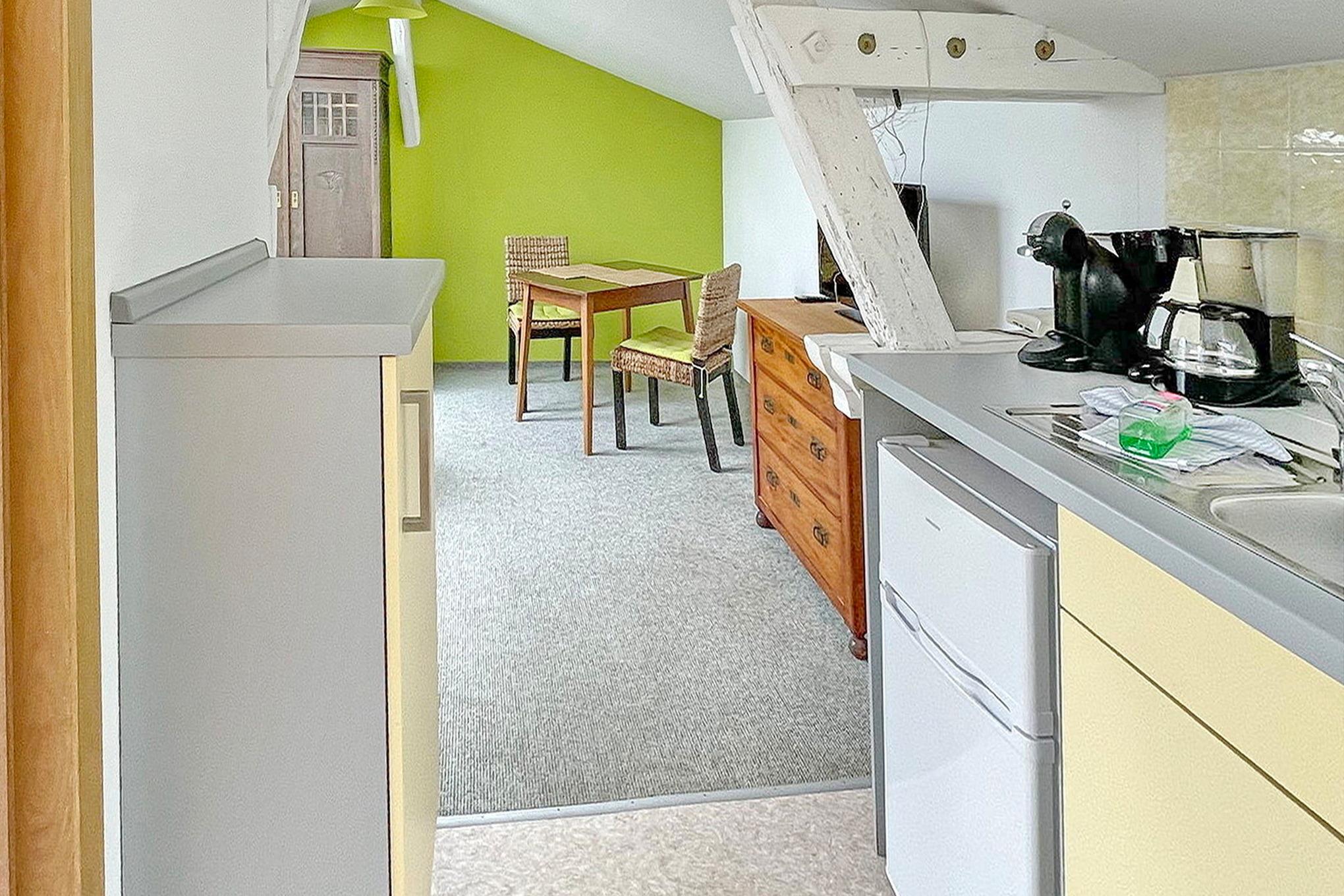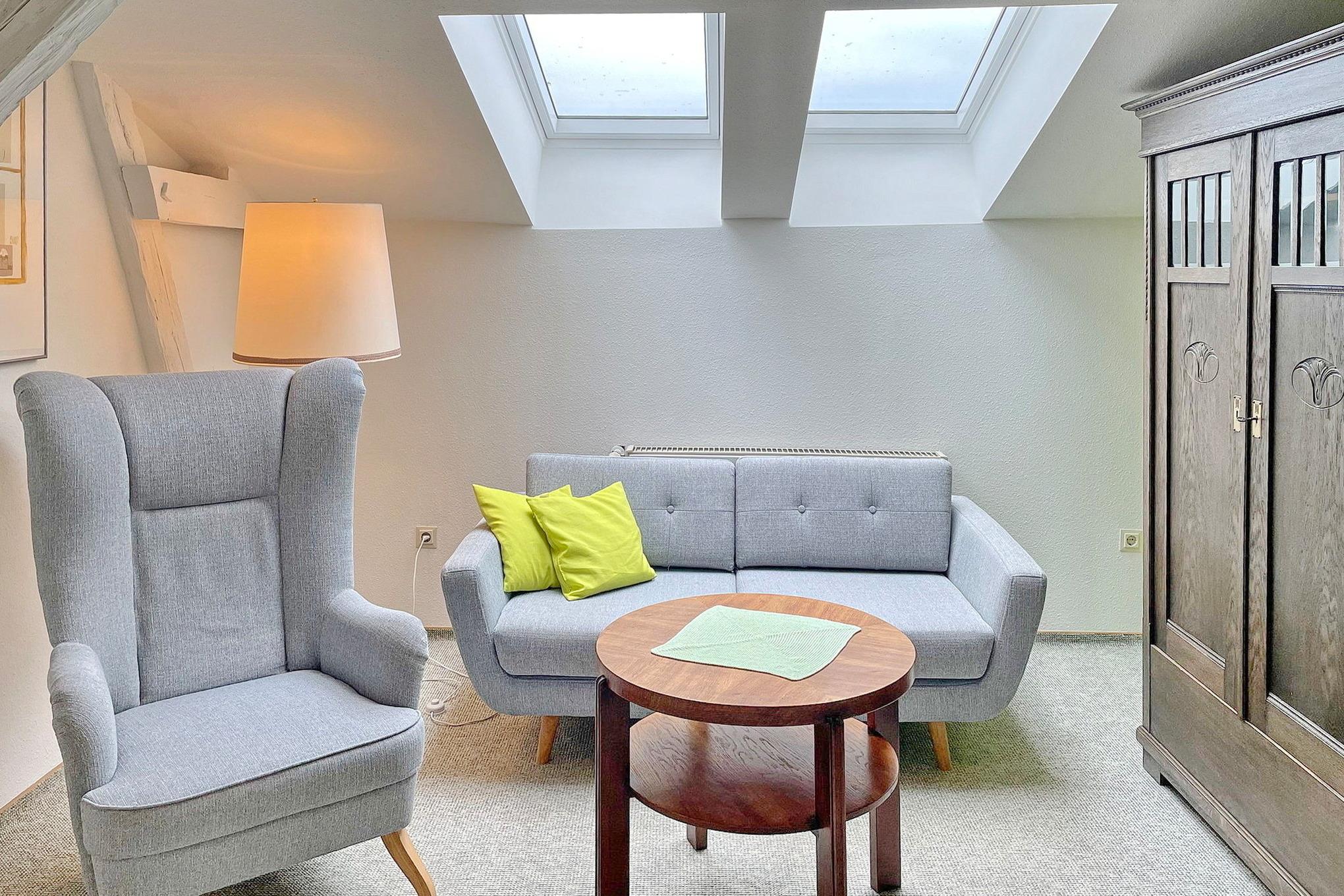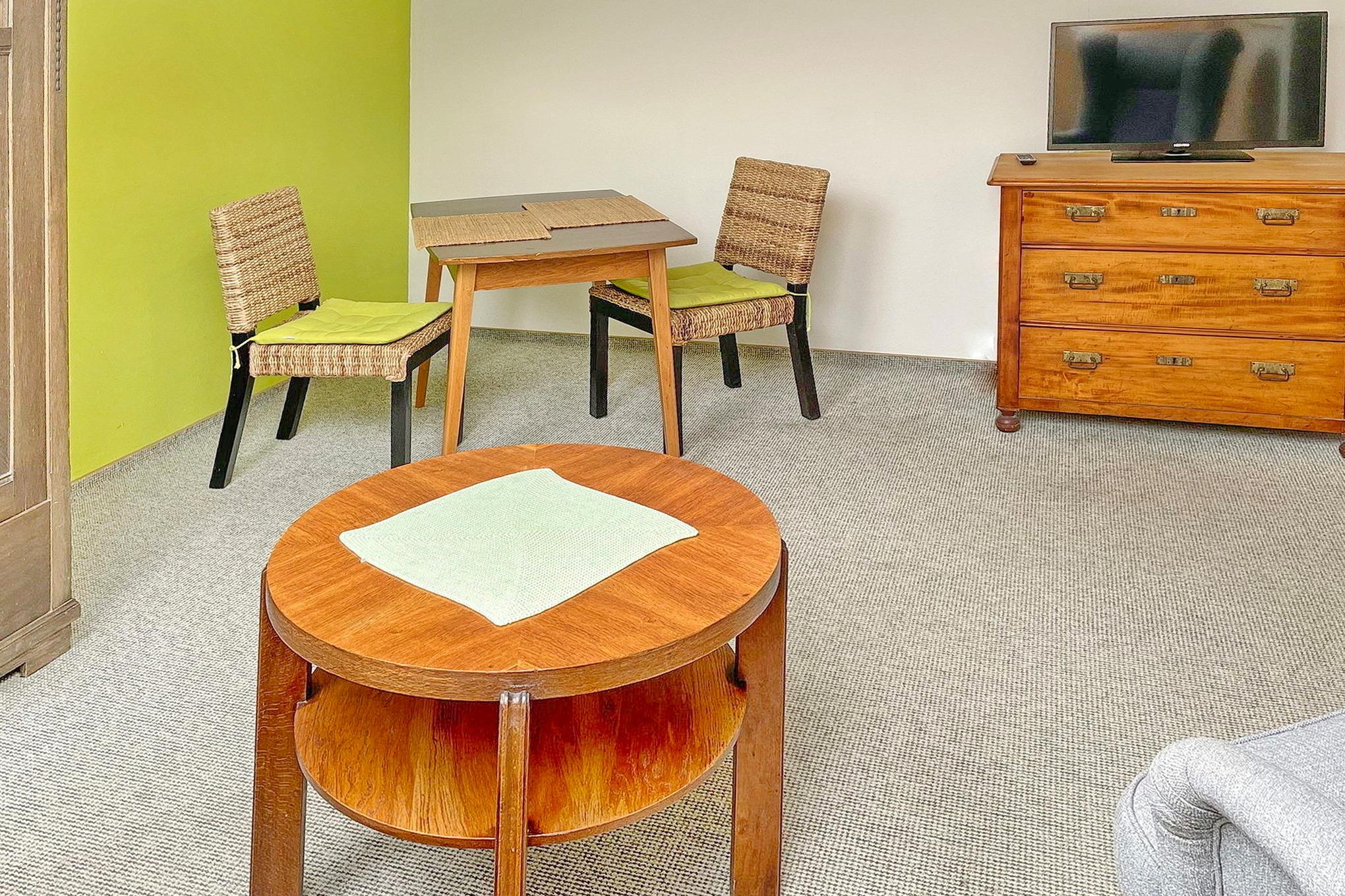 Die Wohnung Lindenblüte befindet sich im Dachgeschoss. Sie hat einen kombinerten Wohn- und Küchenbereich. Im sepraraten Schlafzimmer befindet sich ein Doppelbett. Das Bad ist separat mit Dusche und WC.