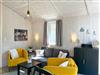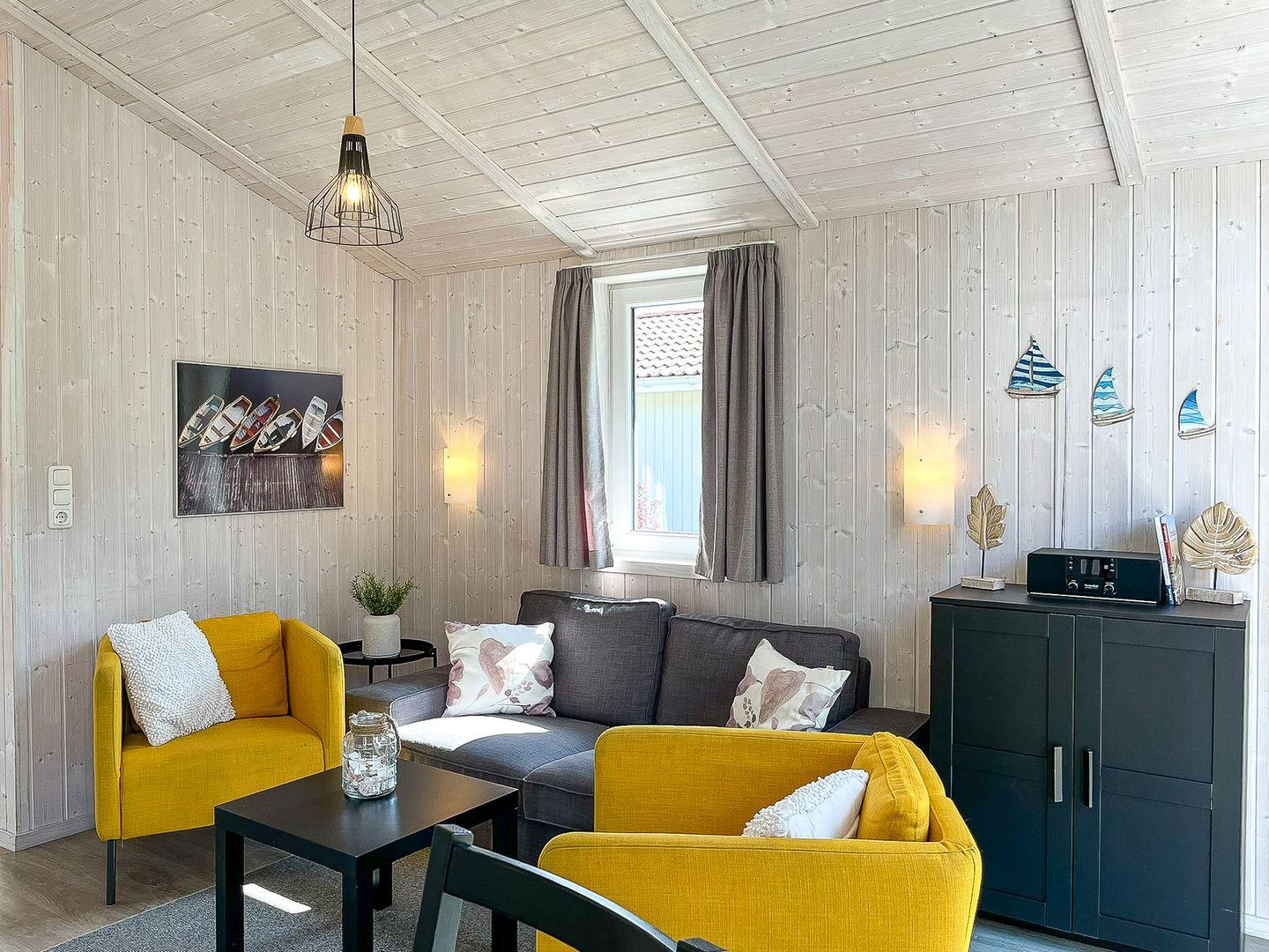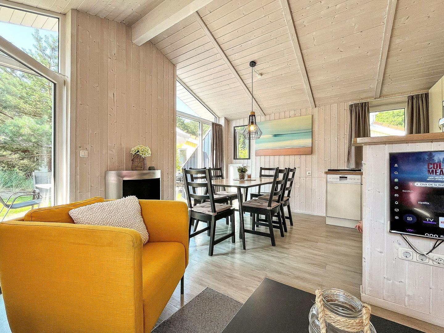 Im offenen Wohn- und Essbereich erwarten Dich ein Sofa, ein Sessel und ein Esstisch. Für Unterhaltung ist mit Smart-TV (Sat), Radio und HiFi-Anlage gesorgt. Der Kaminofen schafft an kühleren Abenden eine besonders behagliche Atmosphäre.