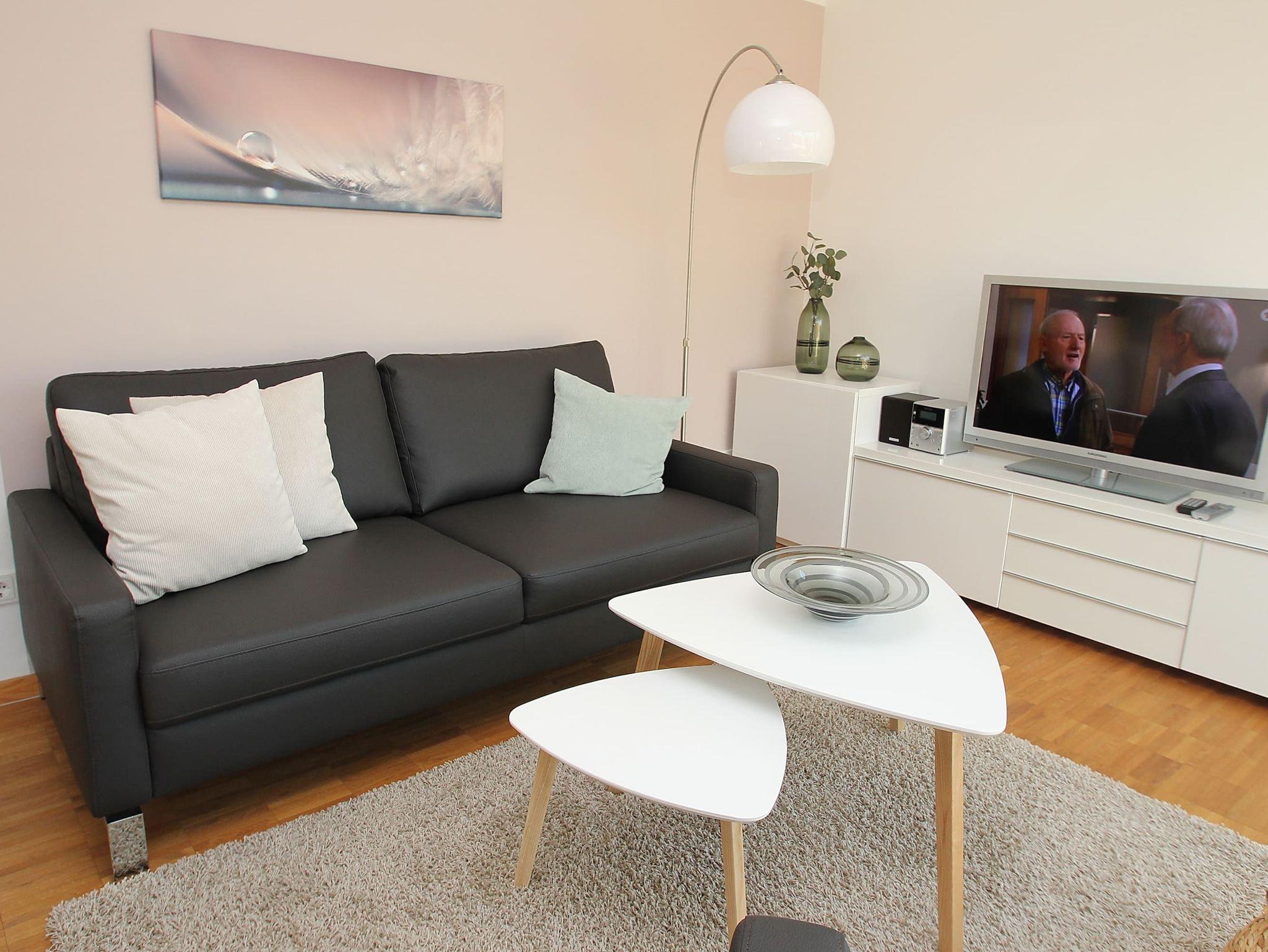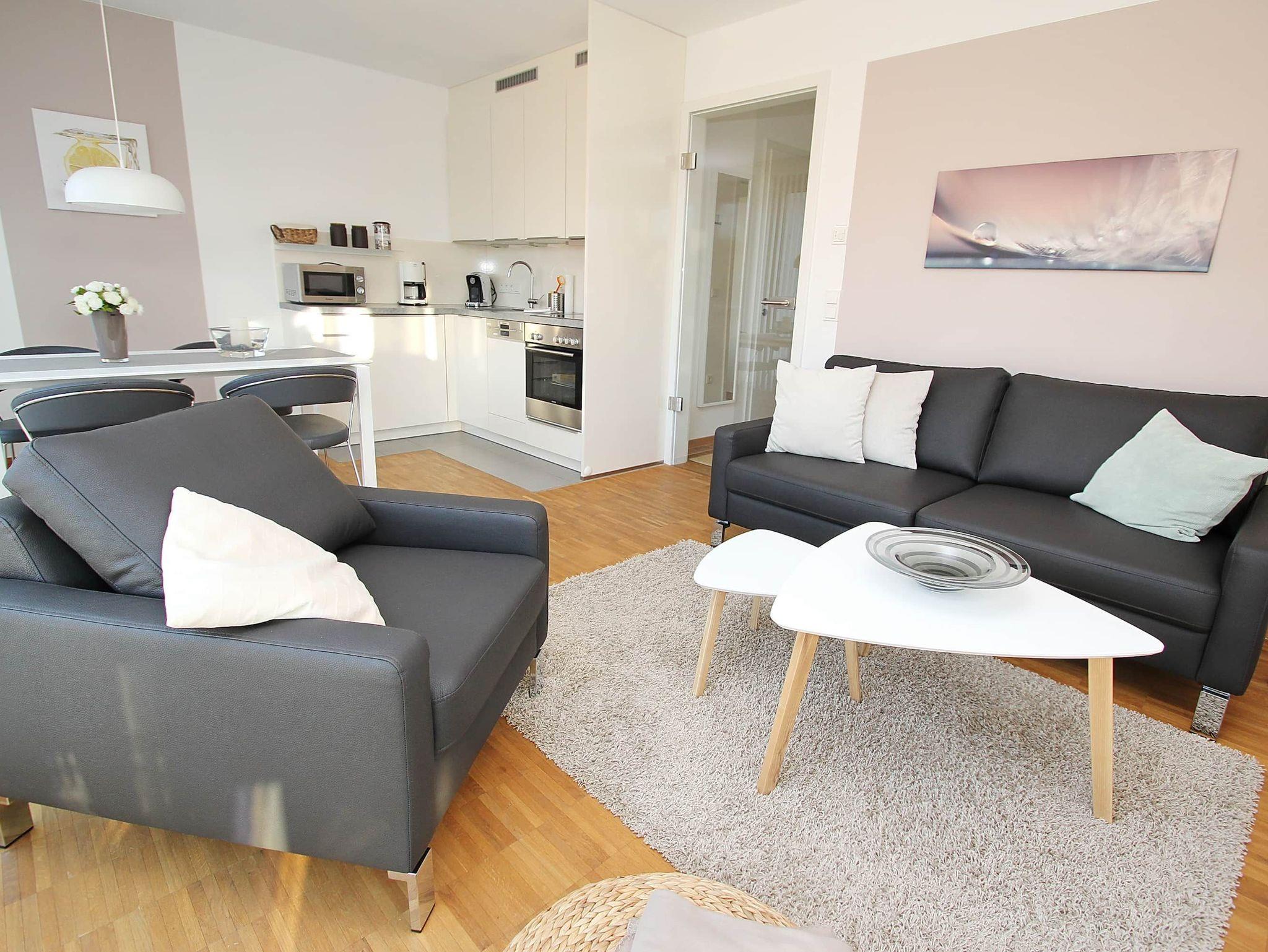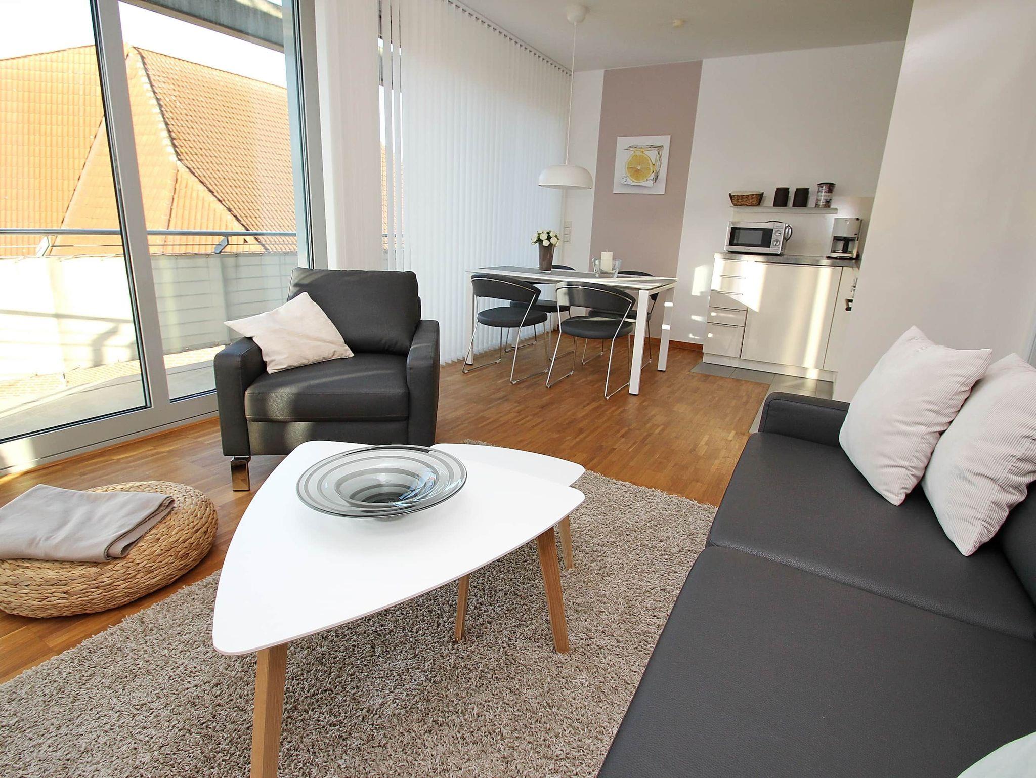 Dieses moderne Appartement mit Loft-Charakter liegt vis-à-vis vom Fährschiffhafen Skandinavienkai in einer neuen Wohnanlage. Die exzellente Wohneinheit liegt in der 2. Etage mit einem sehr schön geschnittenen und lichtdurchfluteten Wohnraum, in dem die Fensterelemente bis zum Boden reichen. Von der hochwertigen, komfortablen Einrichtung werden Sie begeistert sein. Der großzügige Wohnraum verfügt über eine offene Einbauküche, einen Esstisch mit Stühlen, direkt an der großen Fensterfront, sowie eine gemütliche Couch mit einem Sessel und einem Couchtisch. Im Schlafzimmer, das vom Flur abgeht, stehen ein bequemes Doppelbett (2x 90 cm x 200 cm) und ein geräumiger Kleiderschrank. Das ansprechende, helle Bad erreichen Sie vom Flur. Das Appartement ist mit Echtparkett und Fußbodenheizung ausgestattet. Der Süd-West-Balkon lädt zum Relaxen ein.