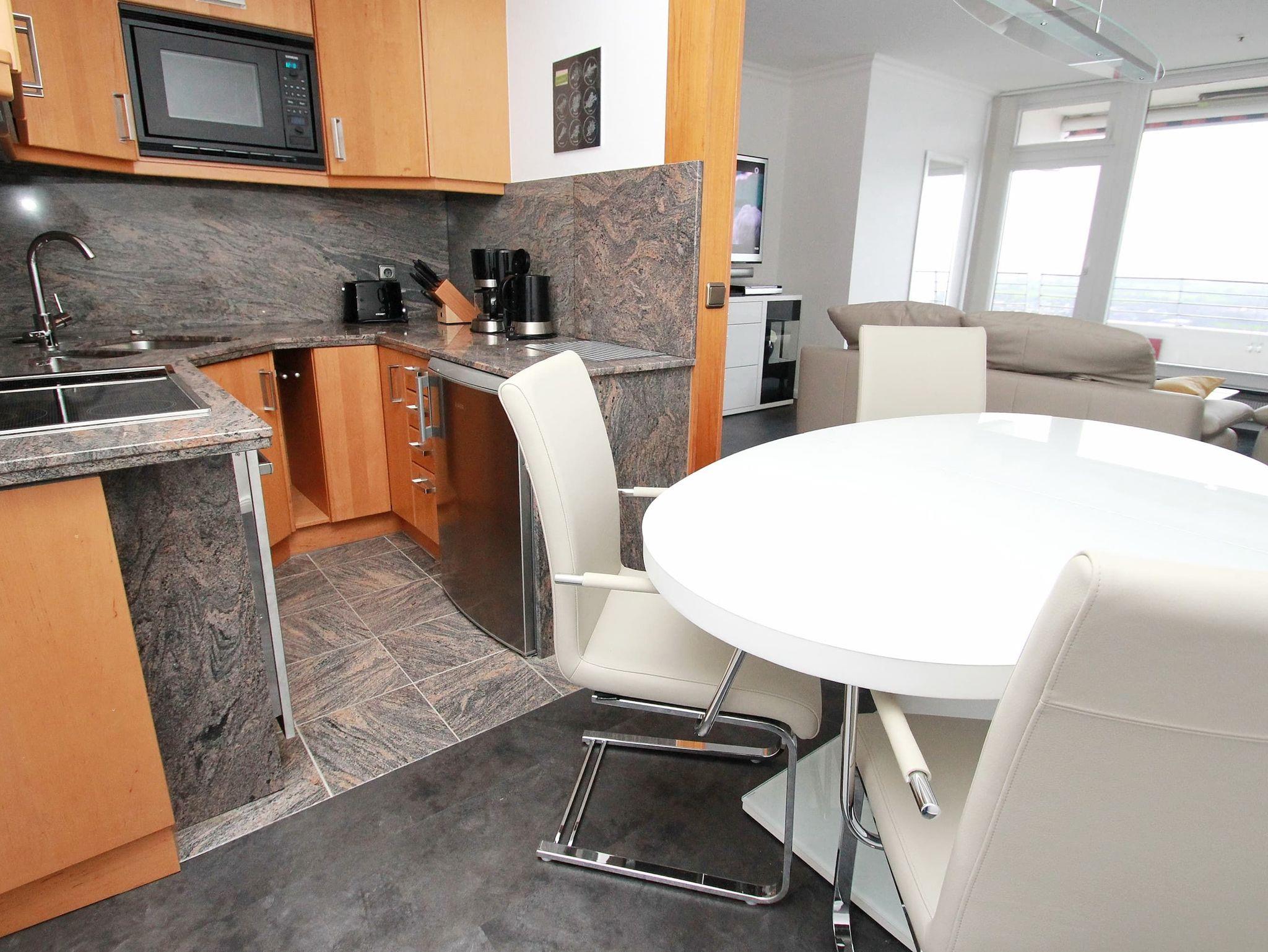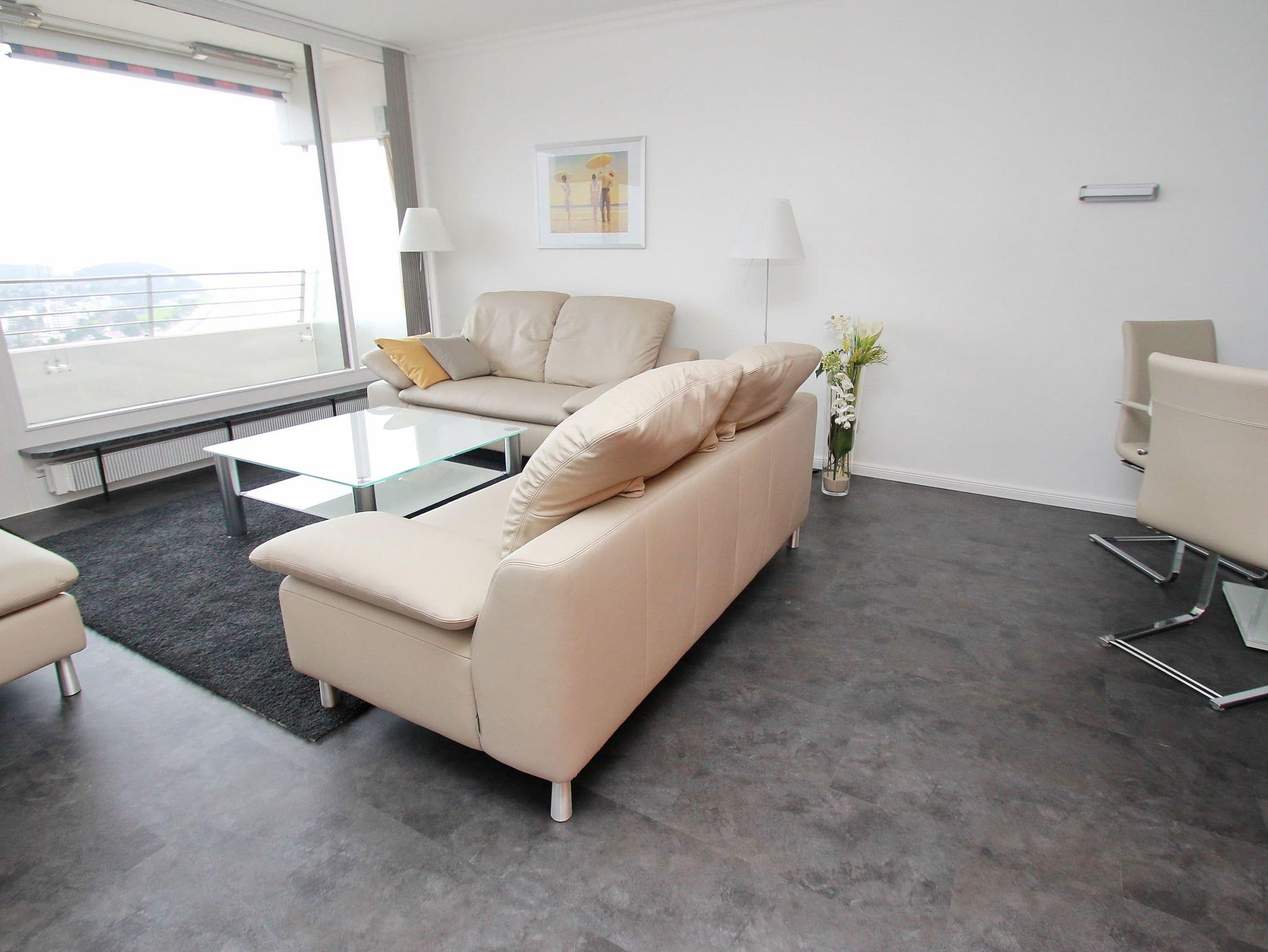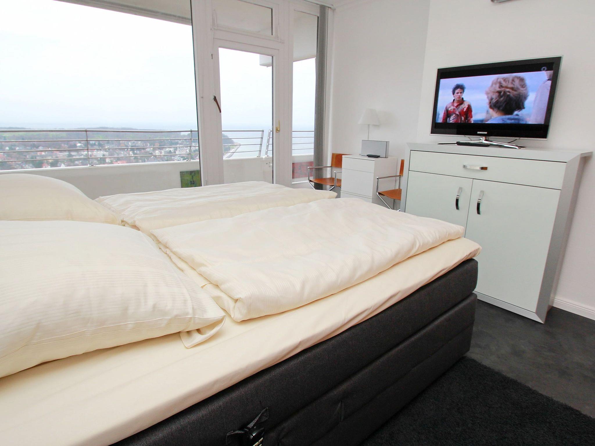 Dieses komfortable Appartement in bevorzugter Lage hat eine ausgesprochen geschmackvolle Einrichtung und lädt zu einem schönen Urlaubsaufenthalt ein. Im Wohnraum stehen eine gemütliche Ledercouchgarnitur mit Tisch, eine Anrichte und eine Essecke neben der Küche. Das Schlafzimmer ist ausgestattet mit einem bequemen Boxspringbett (2x 90 cm x 200 cm) mit elektrisch verstellbarem Kopf- und Fußteil und einem großzügigen Kleiderschrank. Das moderne Duschbad geht vom Flur ab. Vom Wohn- und Schlafraum erreichen Sie den großen Balkon. Hier haben Sie einen traumhaften Ausblick auf die Strandpromenade, weit über die Lübecker Bucht bis hin zum Ostsee-Horizont.