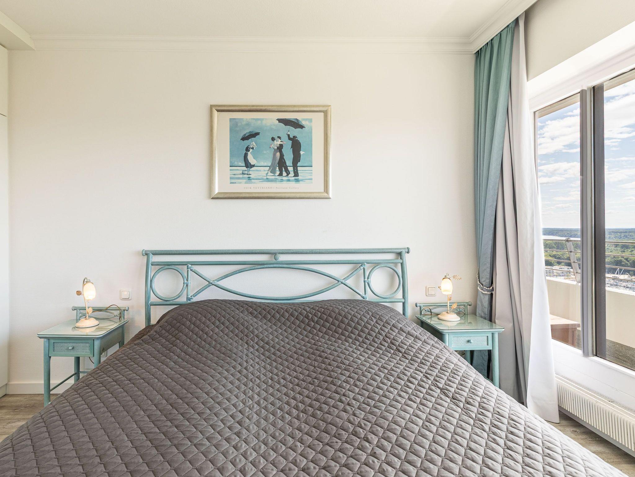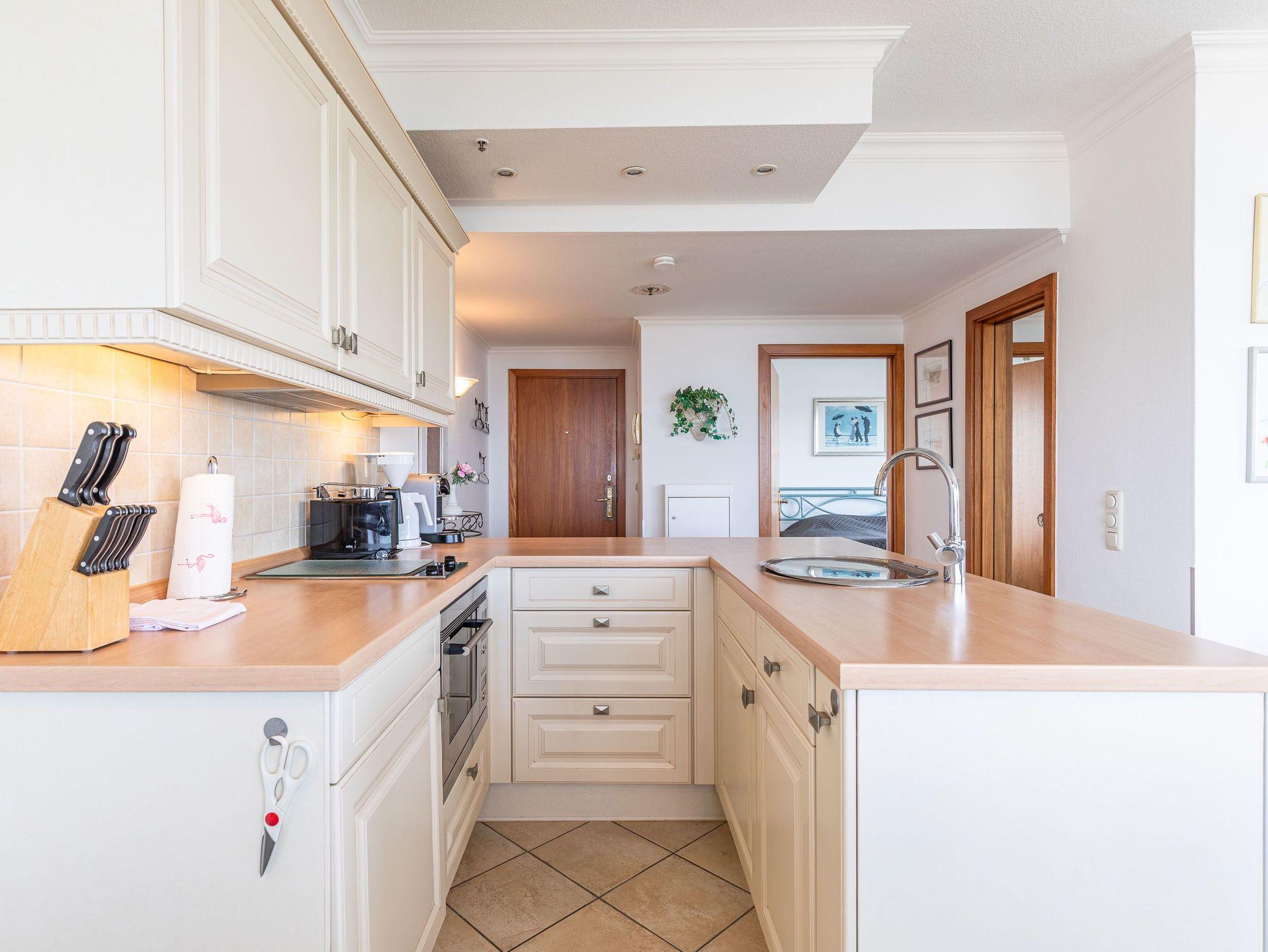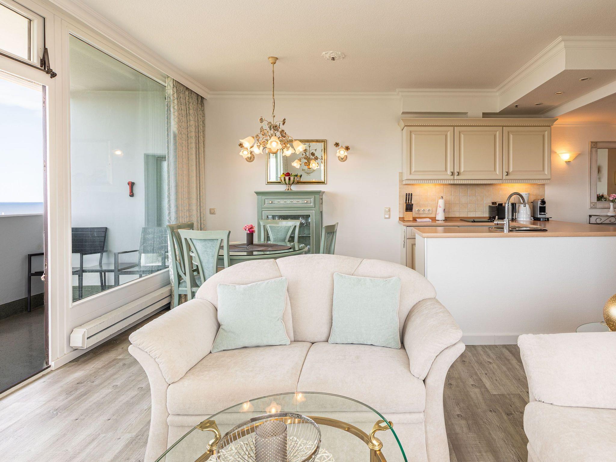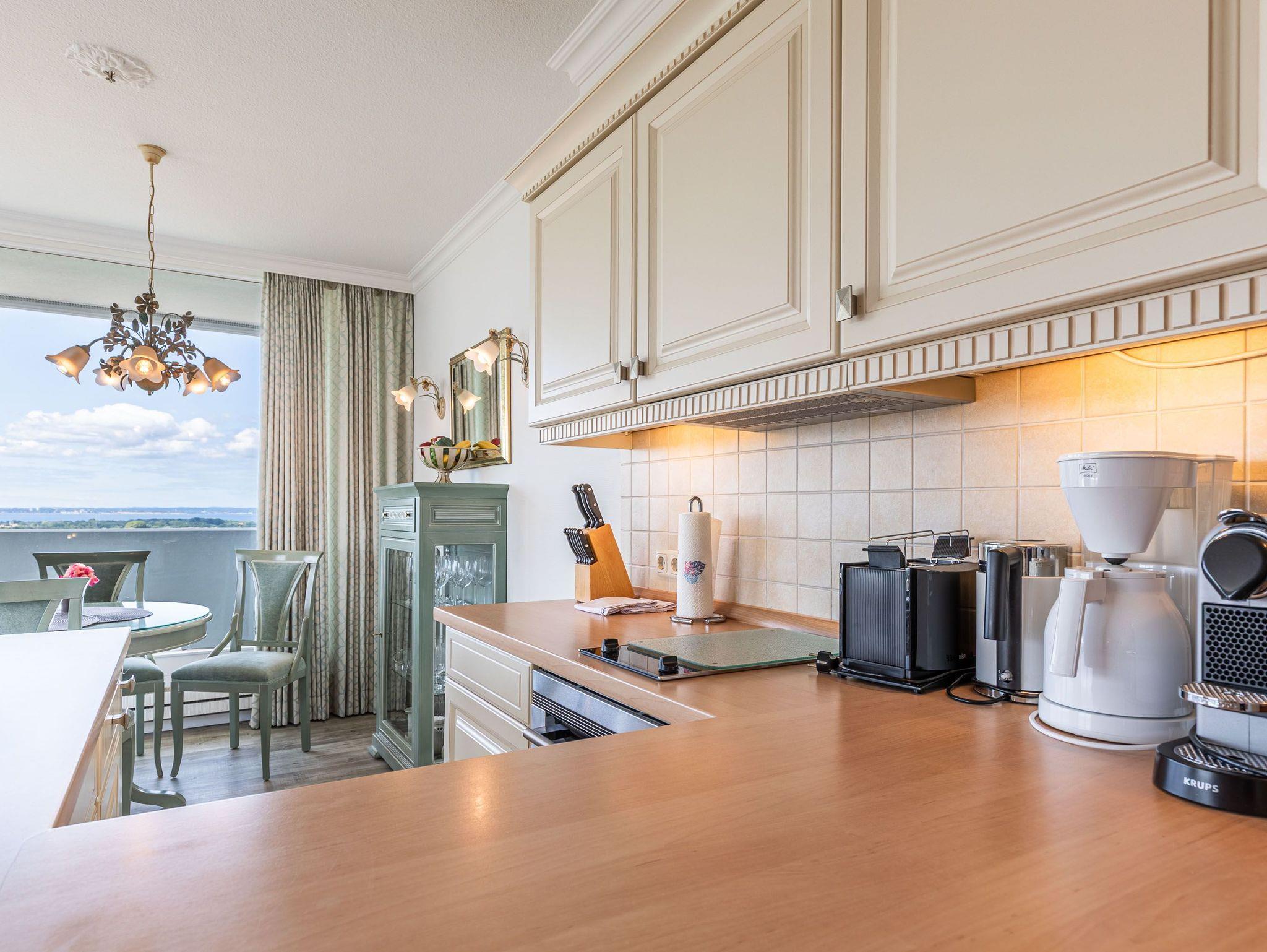 Dieses komfortable und elegante Appartement bietet ein Wohnerlebnis für höchste Ansprüche und lädt zum Wohlfühlen und Entspannen fern des Alltags ein. Die lichtdurchflutete Wohneinheit ist mit italienischen Möbeln ausgestattet. Im pastellfarbenen Wohnraum stehen eine zweiteilige Couchgarnitur, ein Glastisch und ein schicker Esstisch mit Stühlen. Die offene, moderne Küche lässt keine Wünsche offen. Im Schlafzimmer erwarten Sie ein schönes Doppelbett (2x 90 cm x 200 cm) und eine Kleiderschrankwand mit integrierter Bügelstation. Elegante Dekorationen verleihen diesen Wohnräumen eine repräsentative Optik. Den sonnigen Eckbalkon erreichen Sie von beiden Wohnräumen, um den Blick auf die Lübecker Bucht, die Ostsee und die Trave mit lebhaftem Schiffsverkehr zu genießen.