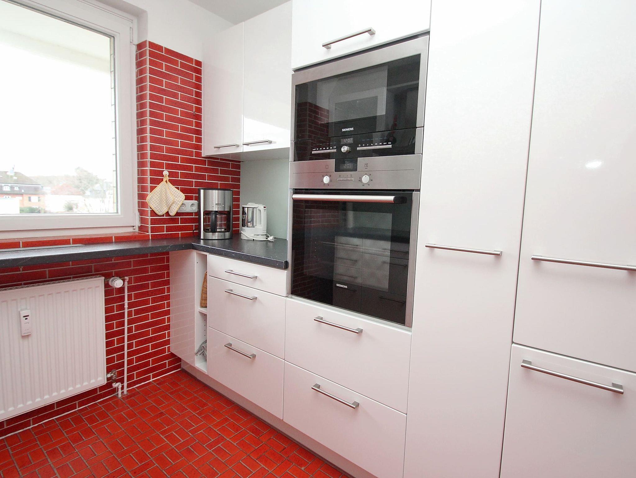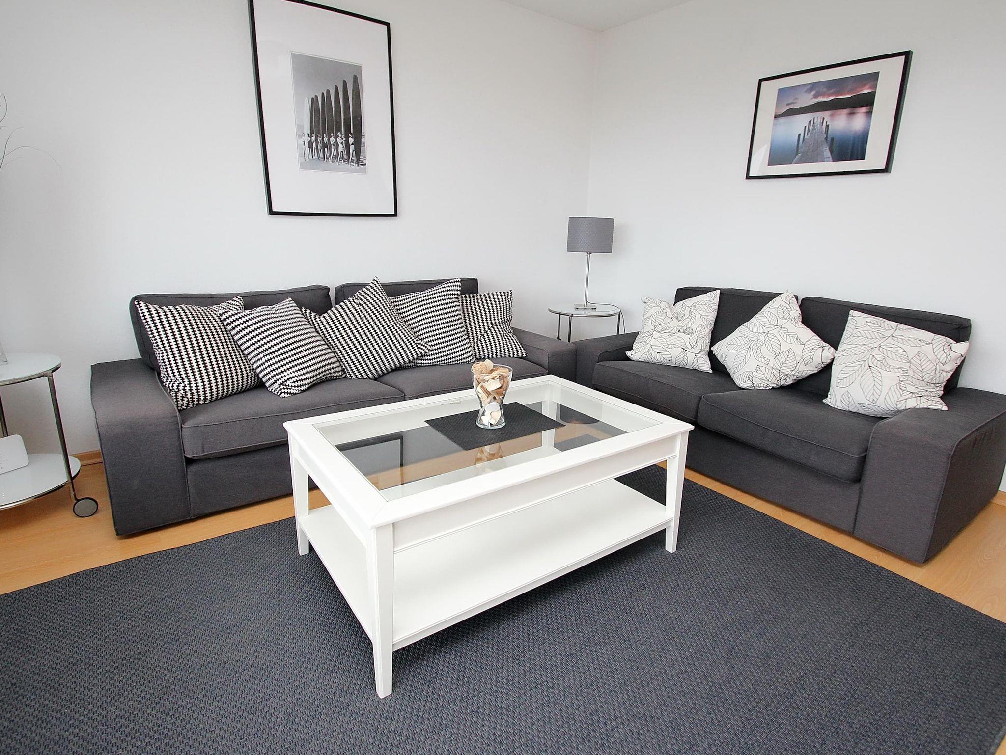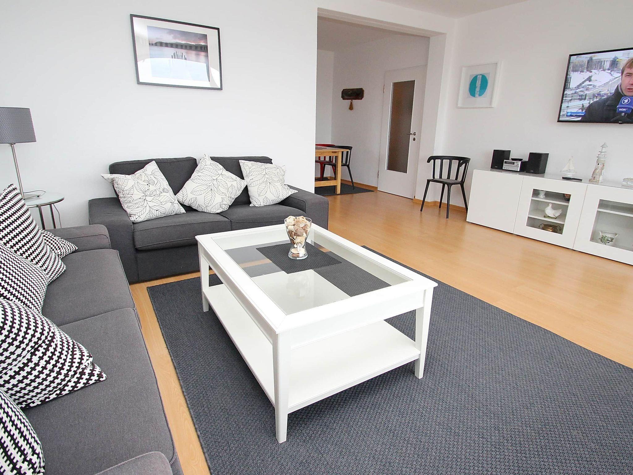 Umlaufender Eckbalkon von ca. 16 m², Küche, Geschirrspüler, Mikrowelle, Duschbad/WC, Fön, (Waschmaschine und Trockner im Haus), 3x TV, Stereoanlage, kostenl. W-Lan, Aufzug, inkl. Tiefgaragenstellplatz (Einfahrtshöhe: 1,70 m).
