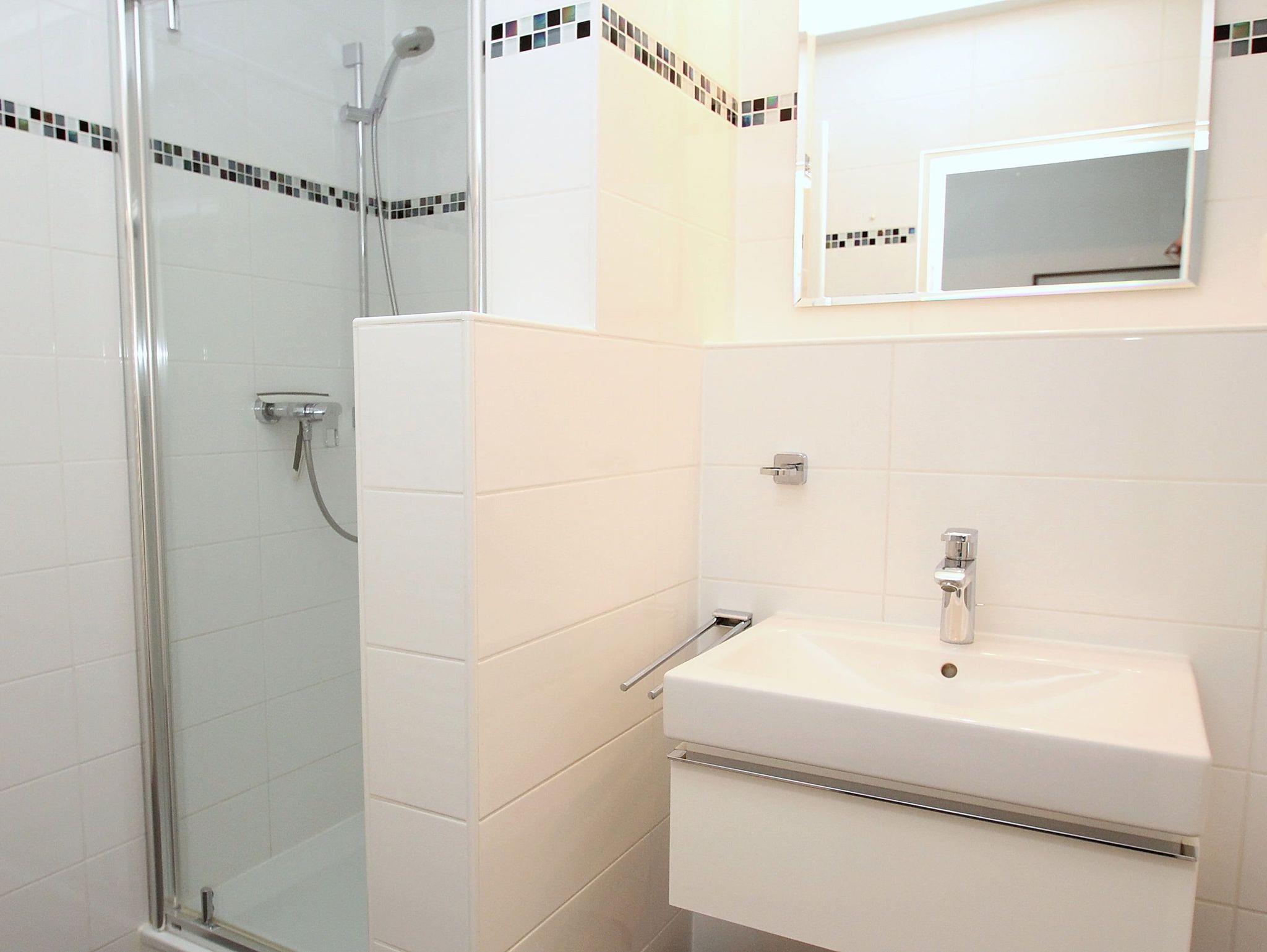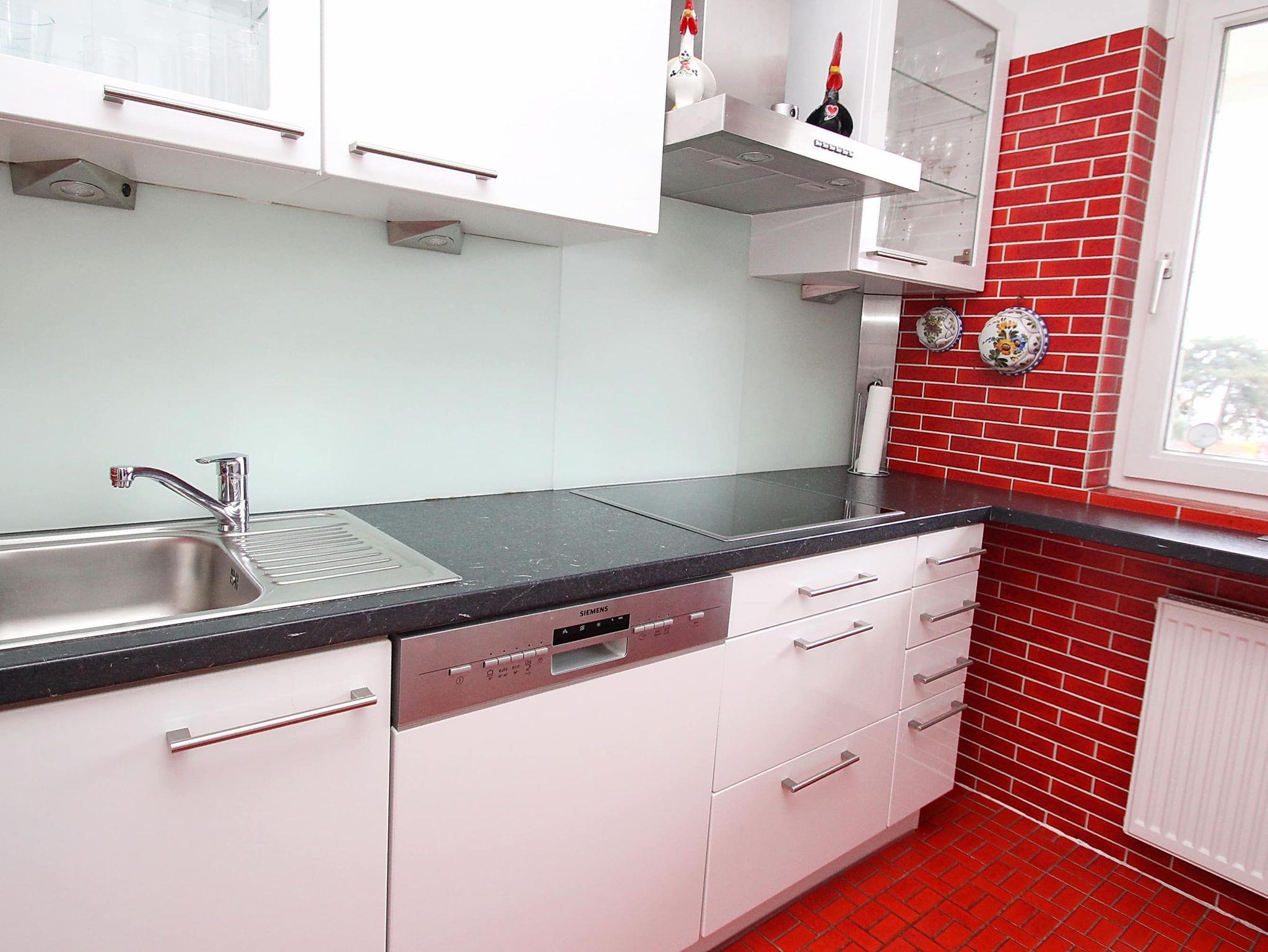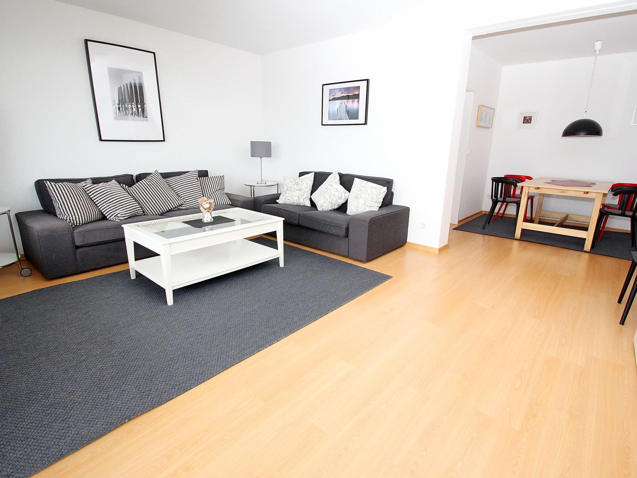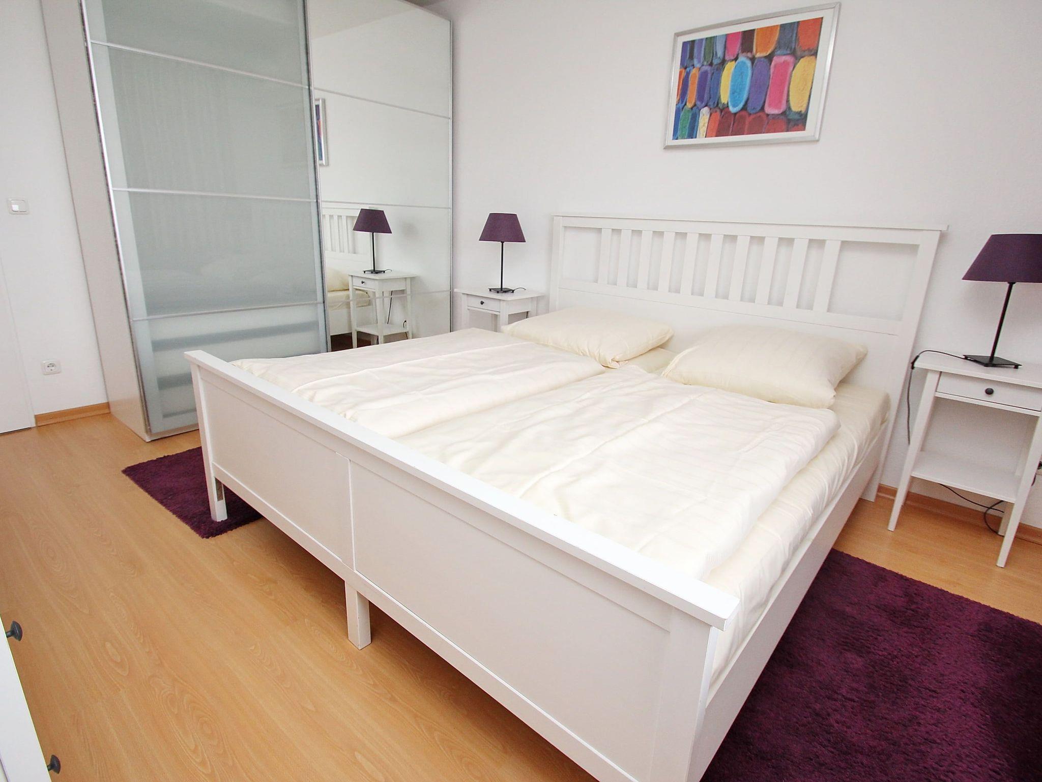 Umlaufender Eckbalkon von ca. 16 m², Küche, Geschirrspüler, Mikrowelle, Duschbad/WC, Fön, (Waschmaschine und Trockner im Haus), 3x TV, Stereoanlage, kostenl. W-Lan, Aufzug, inkl. Tiefgaragenstellplatz (Einfahrtshöhe: 1,70 m).