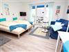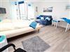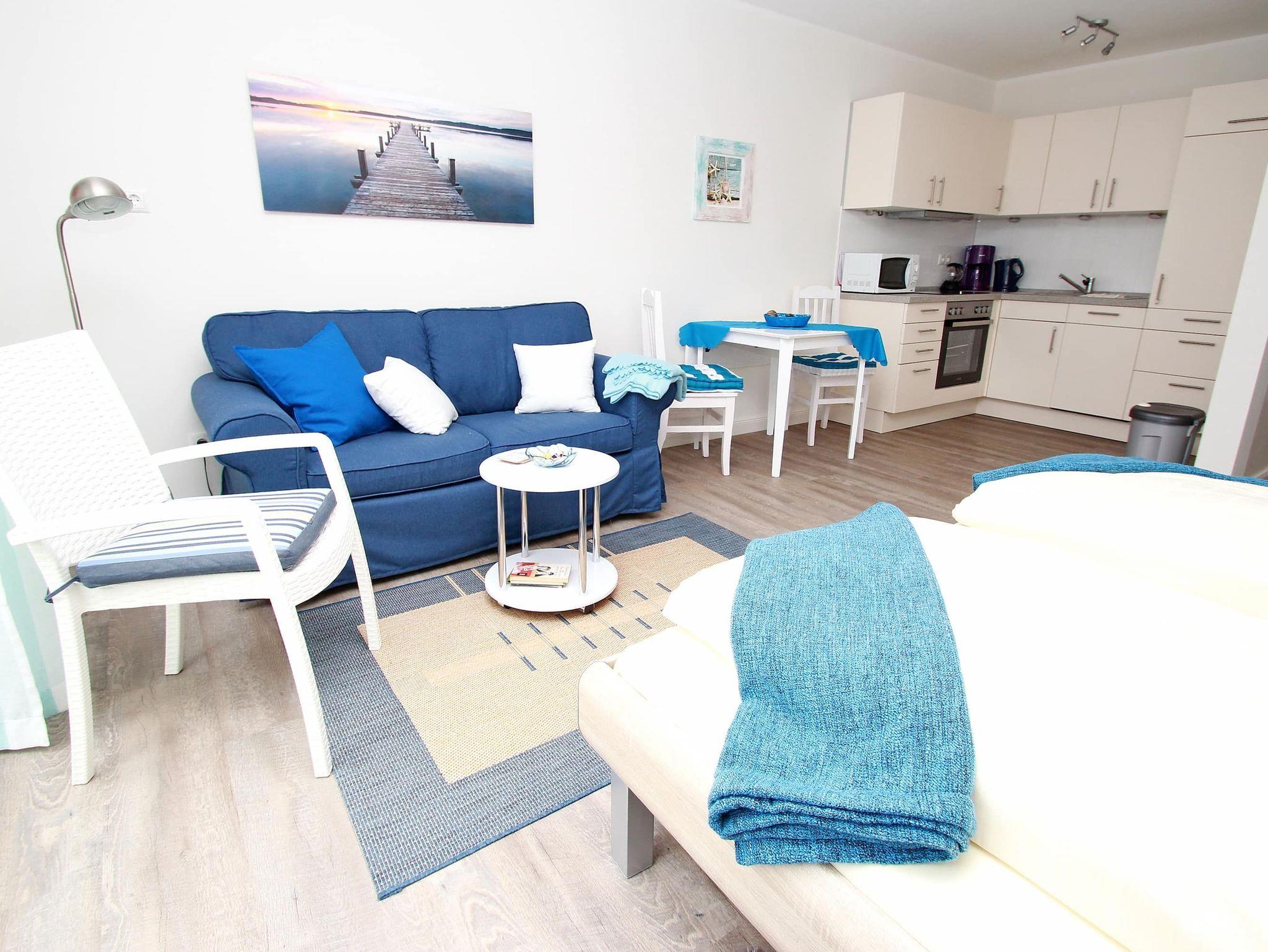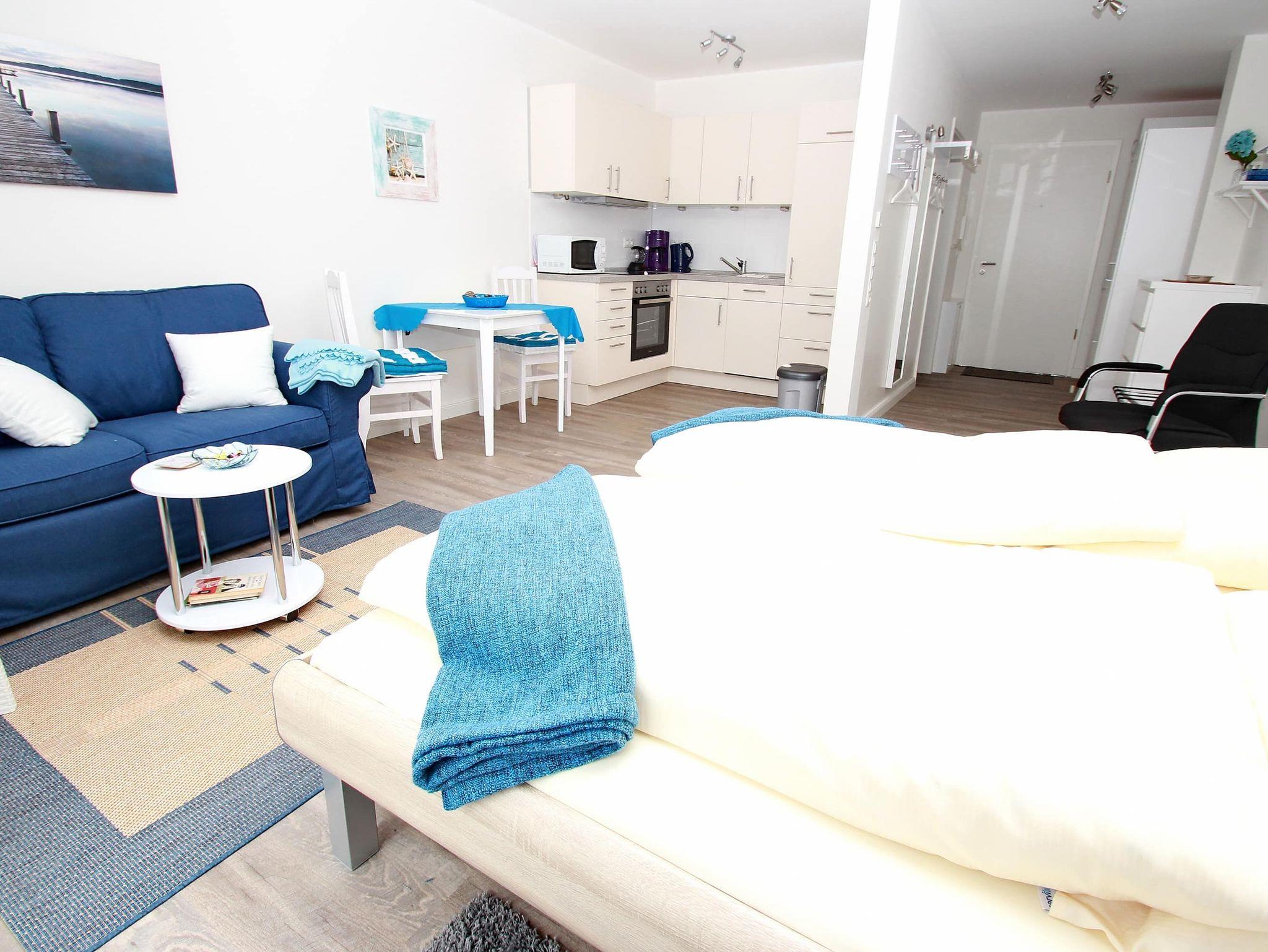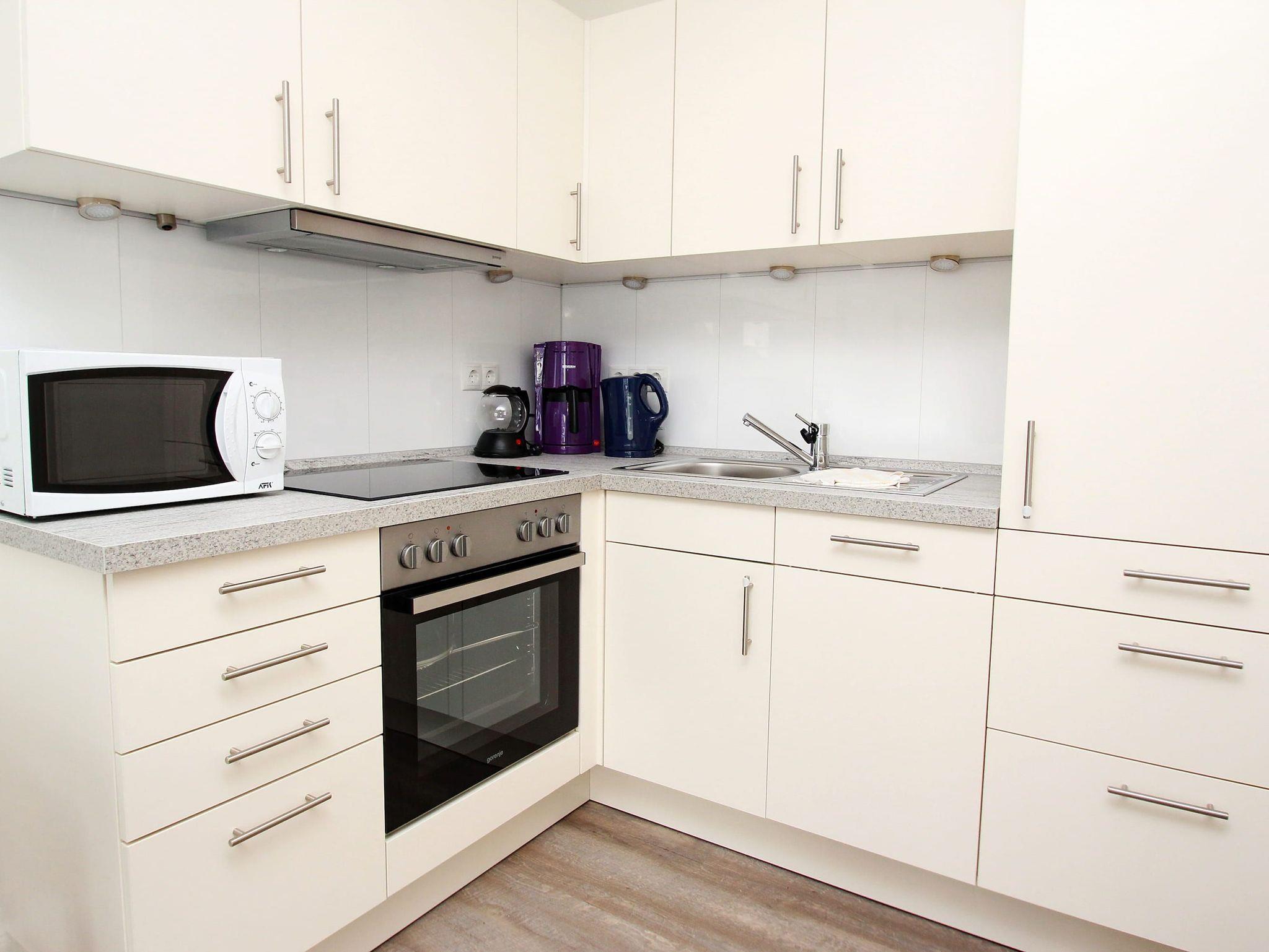 Dieses stufenlose, exklusive Appartement mit günstigen Übernachtungspreisen liegt zentral und ist gehbehindertenfreundlich. Im hellen Wohnraum des Neubaus befinden sich neben der offenen Einbauküche eine gemütliche Couch mit einem Couchtisch und ein Esstisch mit zwei Stühlen. Gegenüber stehen zwei bequeme Einzelbetten (je 90 cm x 190 cm). Im Flurbereich mit einer Garderobe und einem Kleiderschrank geht separat das moderne Duschbad ab. Rundum eine schöne, neue Wohneinheit mit sonnigem Balkon für junge und ältere Urlaubsgäste.