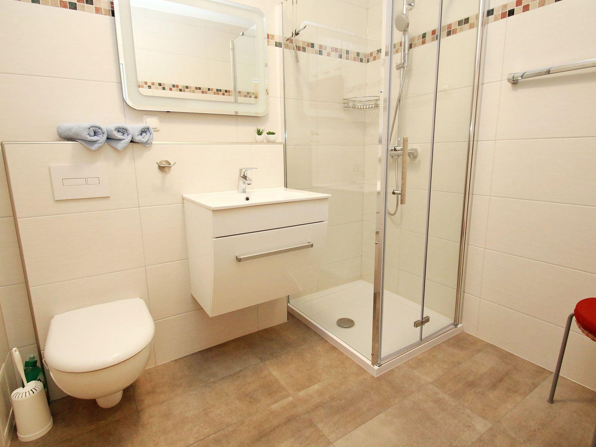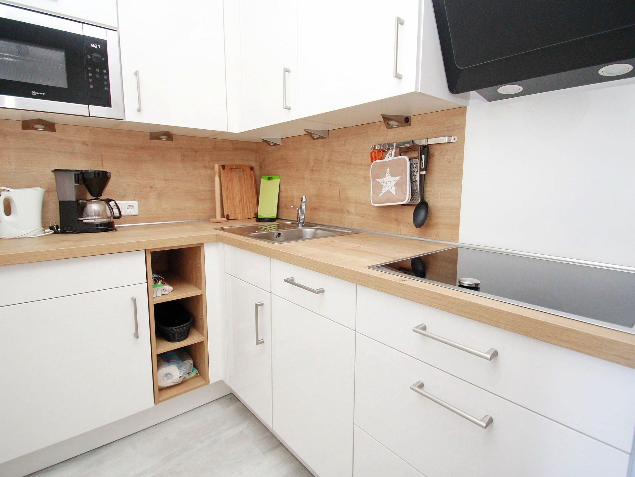 Terrasse, elektr. Außenjalousie, Küche, Geschirrspüler, Mikrowelle, Duschbad/WC, Fön, (Waschmaschine und Trockner im Haus), TV, Stereoanlage, kostenl. W-Lan, inkl. Tiefgaragenstellplatz (Einfahrtshöhe: 2,00 m).