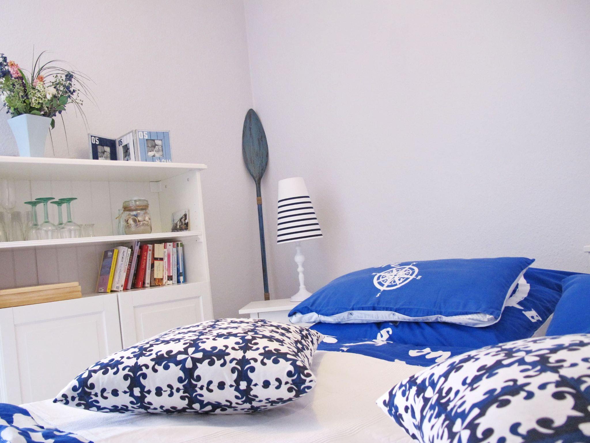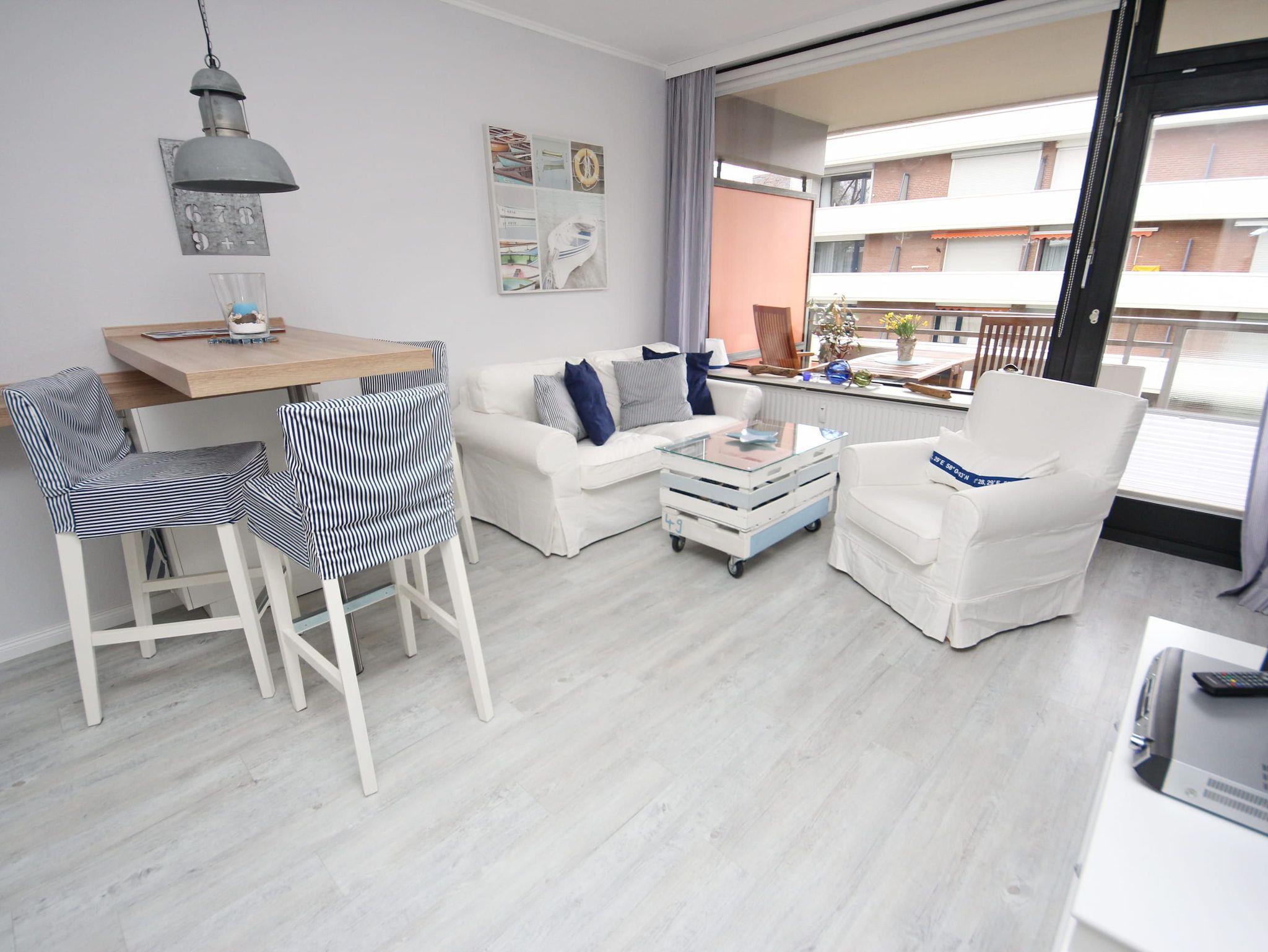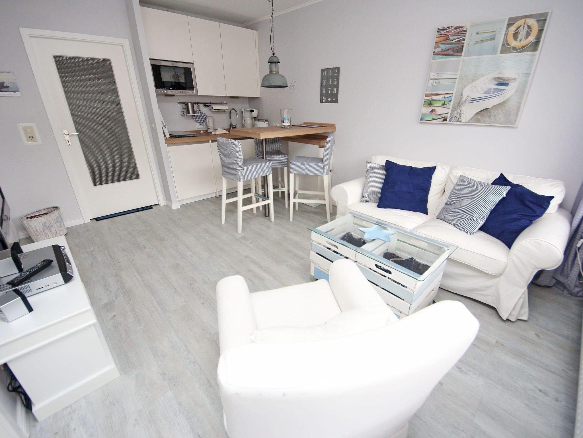 Diese exklusive 2-Zimmer-Wohnung im maritimen Wohnstil ist liebevoll und bis ins kleinste Detail hervorragend für Ihren Urlaub ausgestattet. Im hellen Wohnraum befinden sich eine bequeme Couch und ein Sessel mit Tisch. Neben der komfortablen Küchenzeile erwartet Sie ein Tresen mit schicken Hochstühlen. In der Wohnraumnische finden Sie ein schönes Doppelbett (160 cm x 200 cm) und eine Kommode vor. Das weitere Zimmer, abgehend vom Wohnzimmer, besteht aus einem Einzelbett (80 cm x 200 cm) sowie einem Kleiderschrank und einem Arbeitsbereich am Fenster. Abgehend vom Flur erreichen Sie das moderne Duschbad und das separate WC. Auf dem Balkon genießen Sie die frische Seeluft und schauen in die gepflegte Grünanlage.