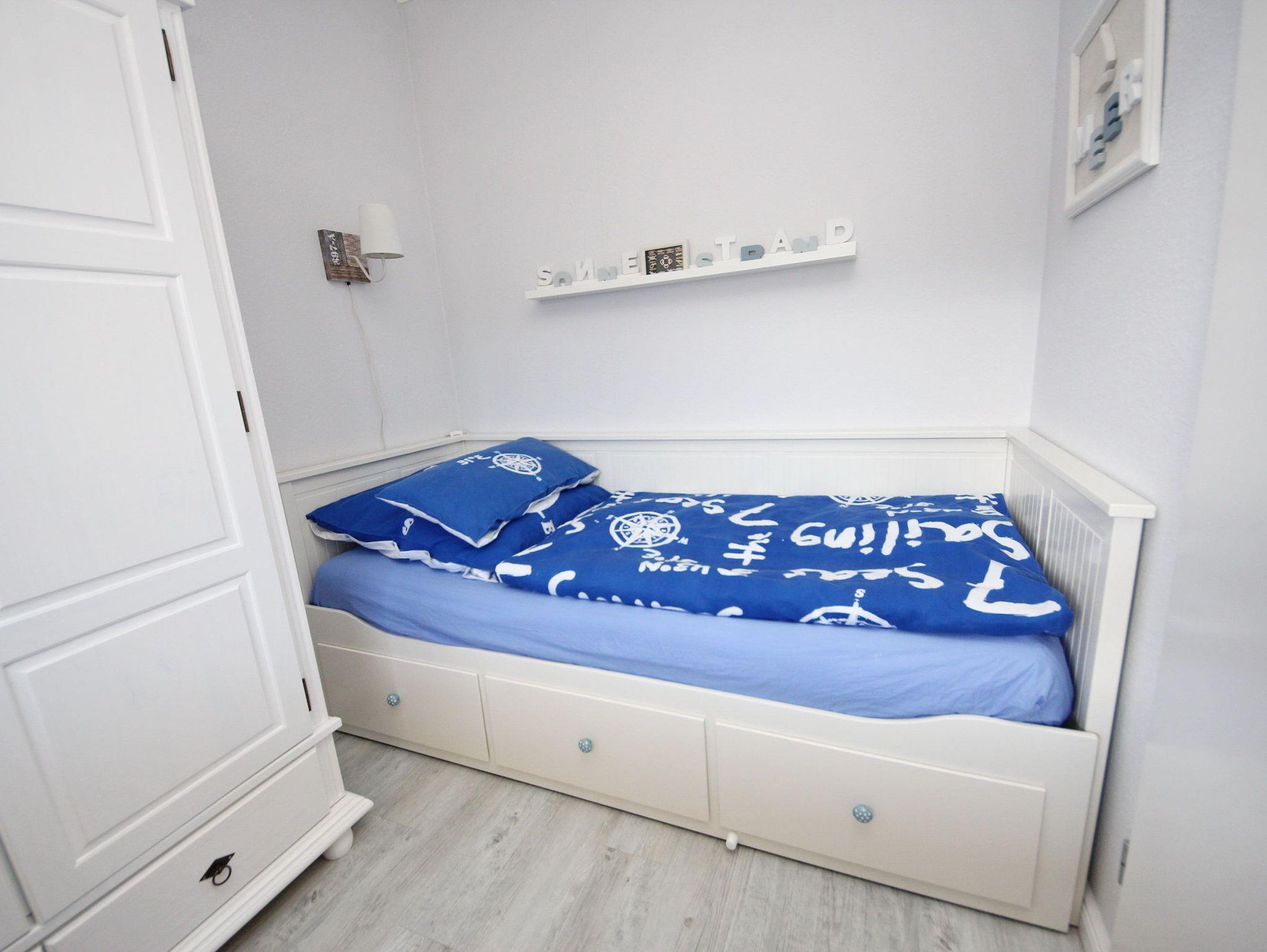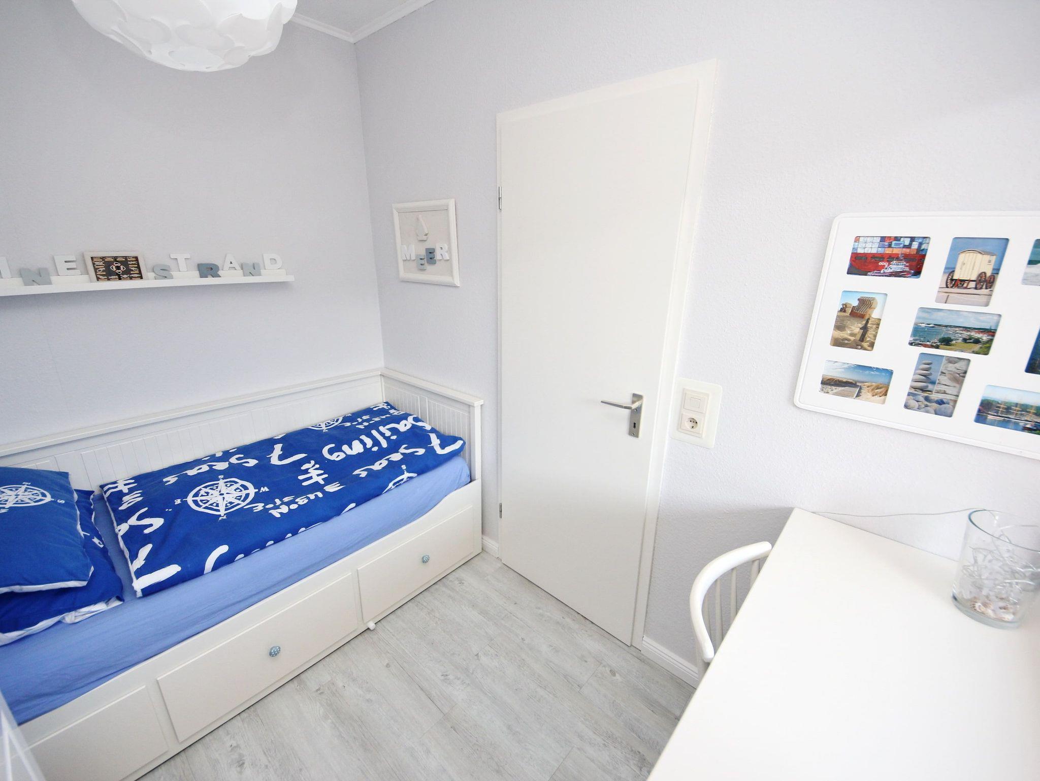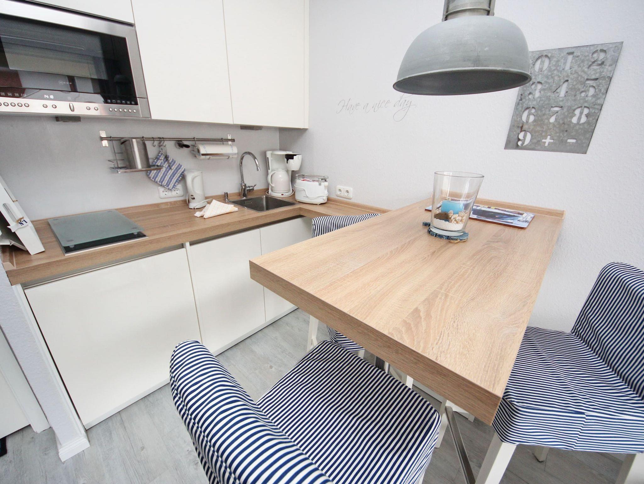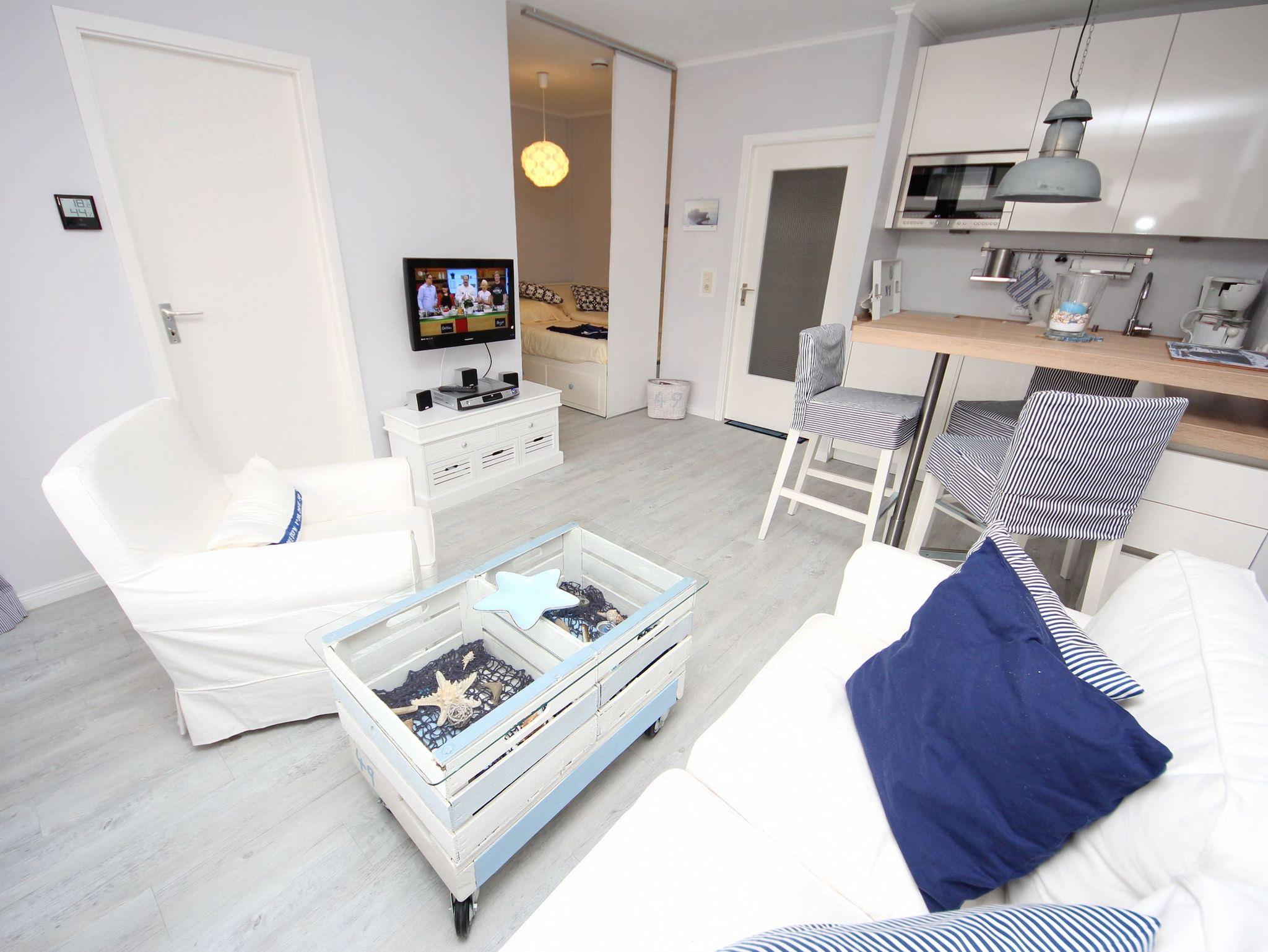 Diese exklusive 2-Zimmer-Wohnung im maritimen Wohnstil ist liebevoll und bis ins kleinste Detail hervorragend für Ihren Urlaub ausgestattet. Im hellen Wohnraum befinden sich eine bequeme Couch und ein Sessel mit Tisch. Neben der komfortablen Küchenzeile erwartet Sie ein Tresen mit schicken Hochstühlen. In der Wohnraumnische finden Sie ein schönes Doppelbett (160 cm x 200 cm) und eine Kommode vor. Das weitere Zimmer, abgehend vom Wohnzimmer, besteht aus einem Einzelbett (80 cm x 200 cm) sowie einem Kleiderschrank und einem Arbeitsbereich am Fenster. Abgehend vom Flur erreichen Sie das moderne Duschbad und das separate WC. Auf dem Balkon genießen Sie die frische Seeluft und schauen in die gepflegte Grünanlage.
