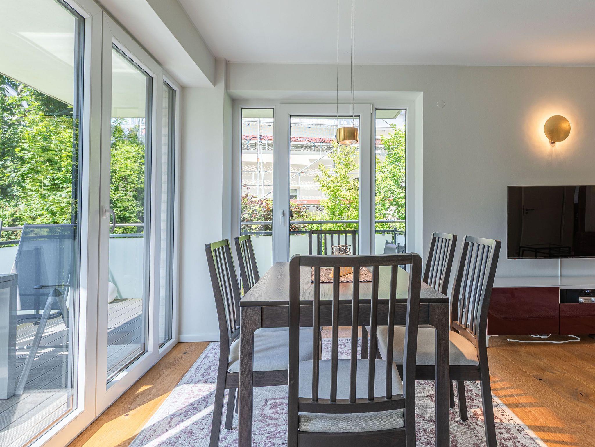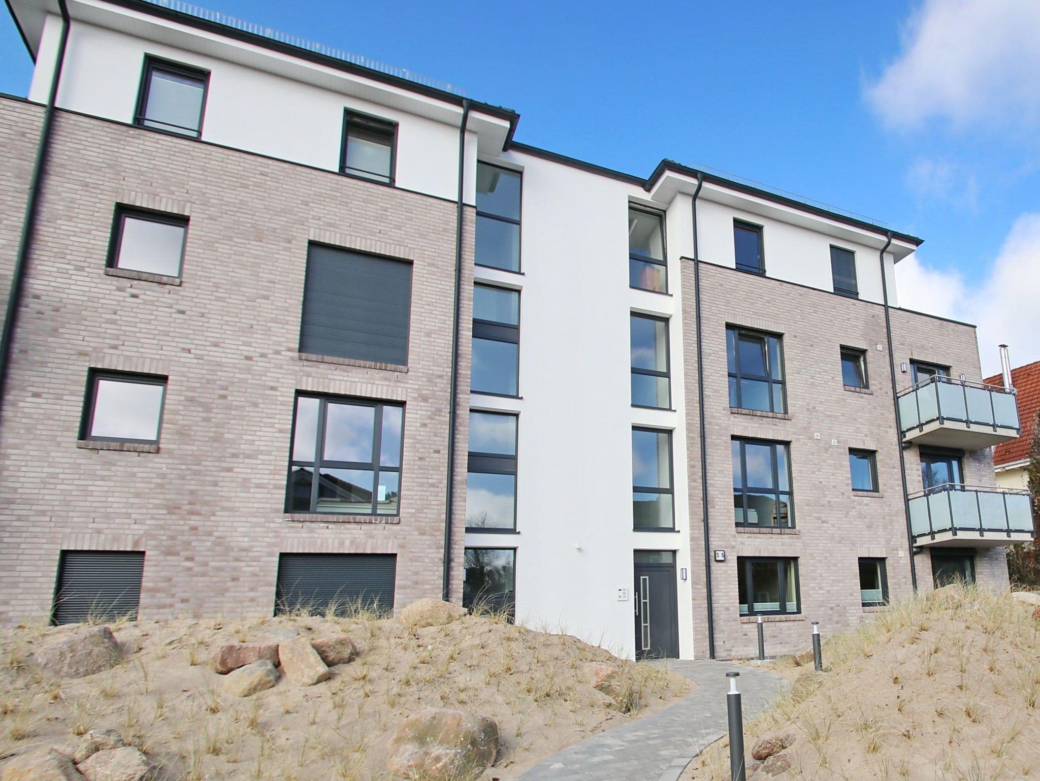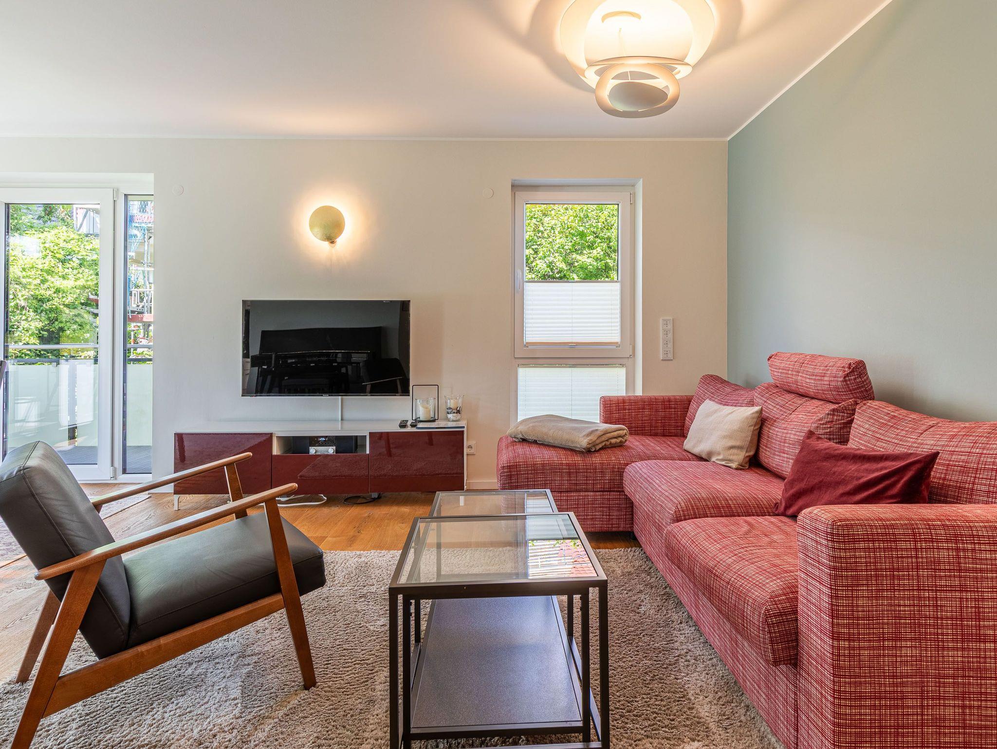 Hier erwartet Sie eine neu errichtete Wohnung mit gehobenem Wohlfühlcharakter in einem exklusiven Appartementanlagenneubau. Mit ihrem hochwertigen Ambiente lässt sie keine Wünsche offen. Der Wohnraum ist mit einer gemütlichen Couch mit Récamiere, einem Sessel und einem Couchtisch ausgestattet. Die Einrichtung wird mit einem Sideboard ergänzt. Die hochmoderne Küche ist im offenen Wohn- und Essbereich integriert, von dem Sie auch einen der großzügigen Balkone erreichen. Das erste Schlafzimmer ist mit einem Boxspringbett (180 cm x 200 cm) und einem Kleiderschrank ausgestattet. Das weitere Schlafzimmer verfügt über ein Boxspringbett (180 cm x 200 cm) und ebenfalls einen Kleiderschrank. Eines der beiden Duschbäder geht vom Flur ab. Das zweite Duschbad erreichen Sie direkt vom Schlafzimmer, wie auch den zweiten Balkon.