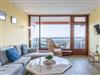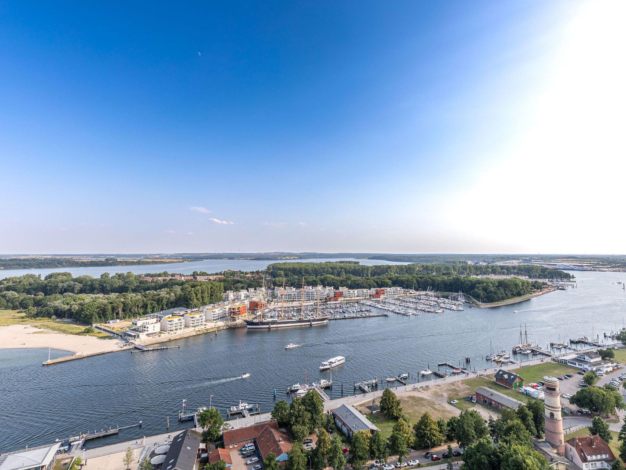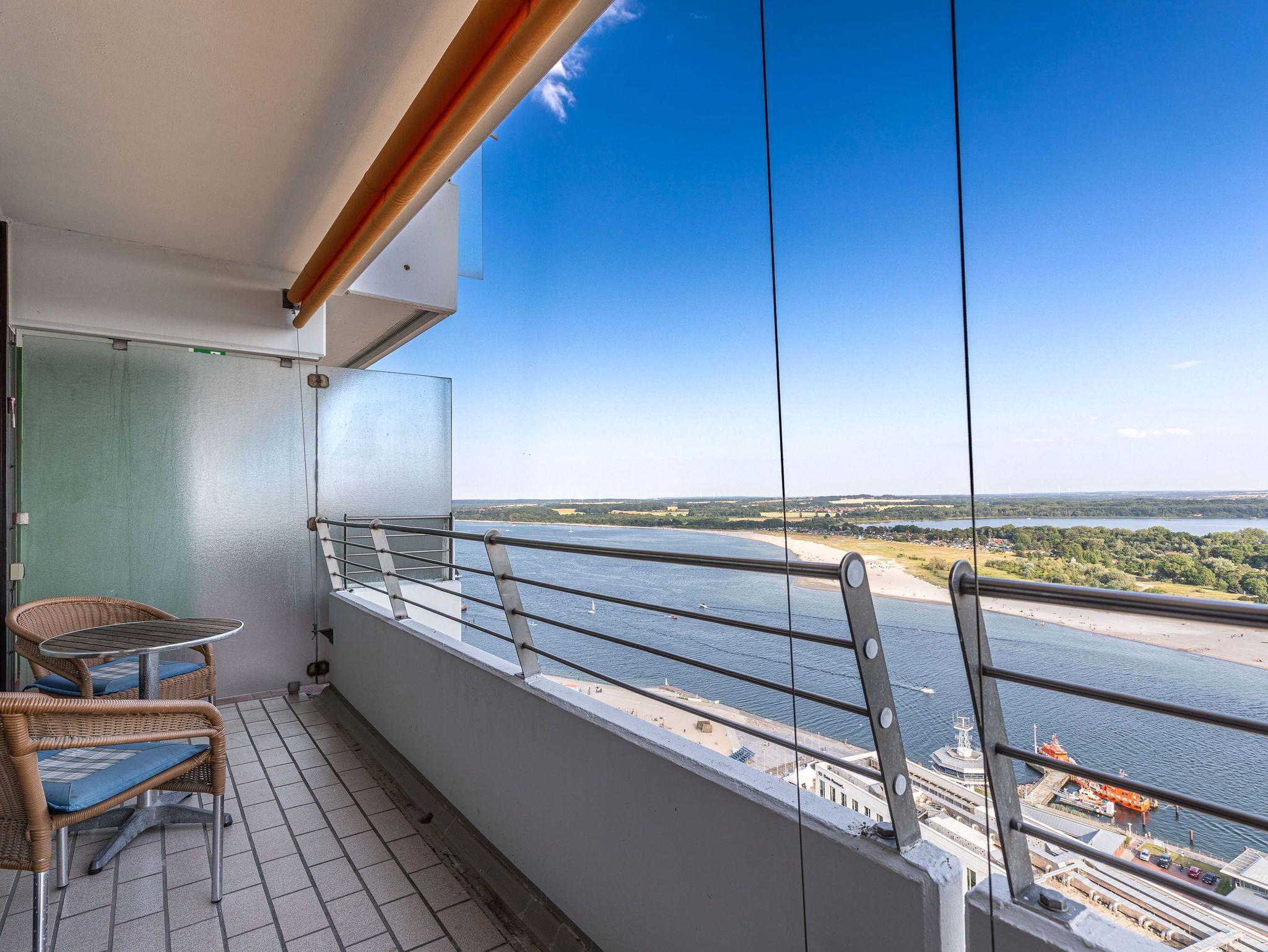 Dieses freundliche Appartement in traumhafter Lage hat eine ausgefallene und angenehme Einrichtung. Im hellen Wohnzimmer erwartet Sie eine offene Einbauküche mit Tresen und maritimen Hochstühlen. In der anderen Wohnraumhälfte befinden sich eine gemütliche zweiteilige Couchgarnitur mit einer Ottomane und einem Beistelltisch vor dem Fenster sowie ein antiker Vitrinenschrank. Im Schlafzimmer stehen ein bequemes Doppelbett (2x 90 cm x 200 cm) und ein schöner Kleiderschrank. Das moderne Bad geht vom Flur ab. Von beiden Wohnräumen haben Sie Zugang zum großen Balkon und genießen hier einen herrlichen Panoramablick direkt auf die Trave mit ein- und ausfahrendem Schiffsverkehr, auf die Lübecker Bucht und zum Hafen.