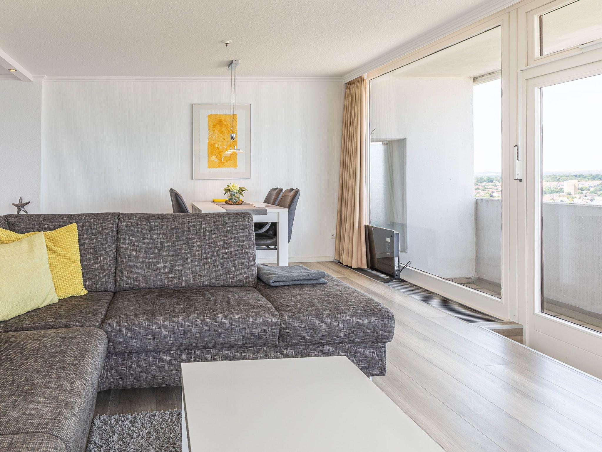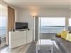Dieses exzellente, hell eingerichtete Appartement gehört zur absoluten Spitzenklasse. Der erhöhte Podest im Wohnraum ermöglicht Ihnen von der bequemen Sitz-/Schlafcouch (55 cm x 200 cm) sowie von der Essecke einen herrlichen Meerblick. Des Weiteren befindet sich im Wohnraum eine schöne Schrankwand mit einem integrierten Einzelschrankbett (90 cm x 200 cm). Die moderne Einbauküche mit Tresen lässt die Herzen aller Kochfans höher schlagen. Im Schlafzimmer, abgehend vom Flur, befinden sich ein hochwertiges Boxspringbett (2x 90 cm x 200 cm) und ein Einbaukleiderschrank. Das hochmoderne Bad erreichen Sie vom Flur. Beide Wohnräume sind hell, lichtdurchflutet und haben einen Zugang zum großen Eckbalkon. Hier genießen Sie einen uneingeschränkten Panoramablick direkt auf die Ostsee und zur Lübecker Bucht mit lebhaftem Schiffsverkehr.