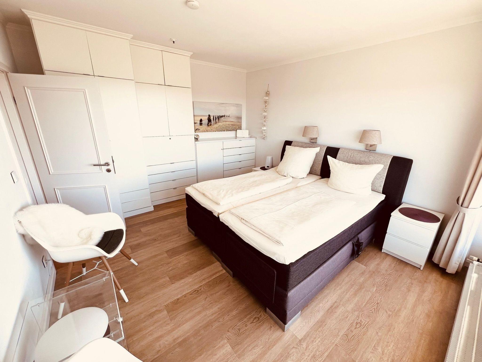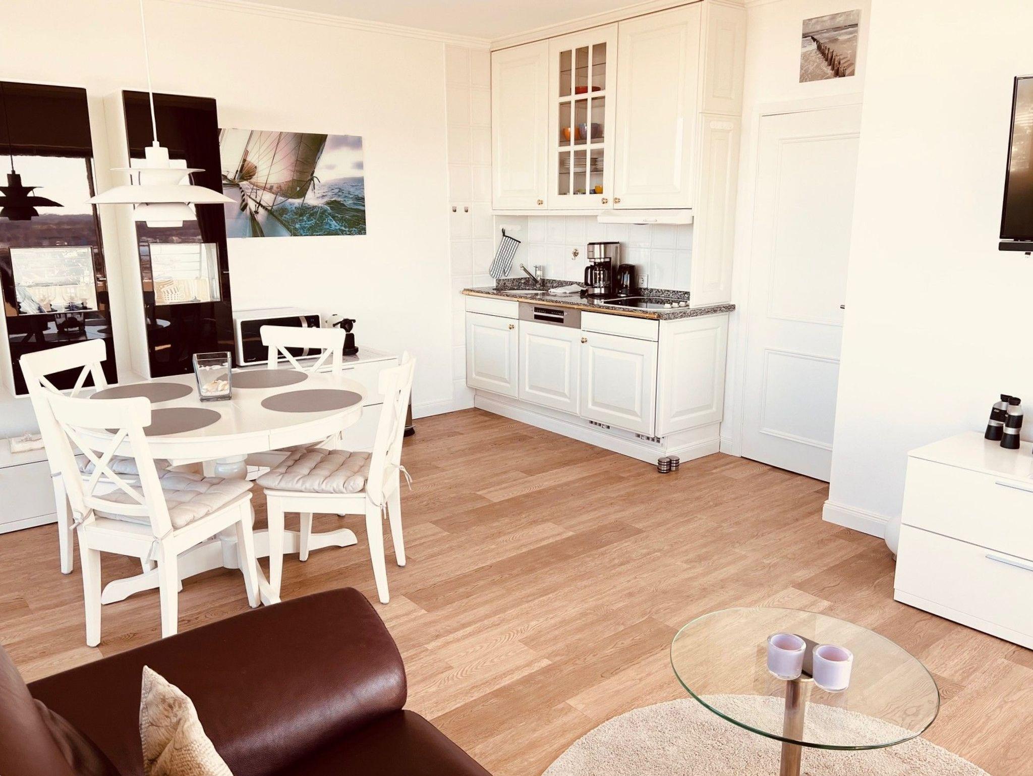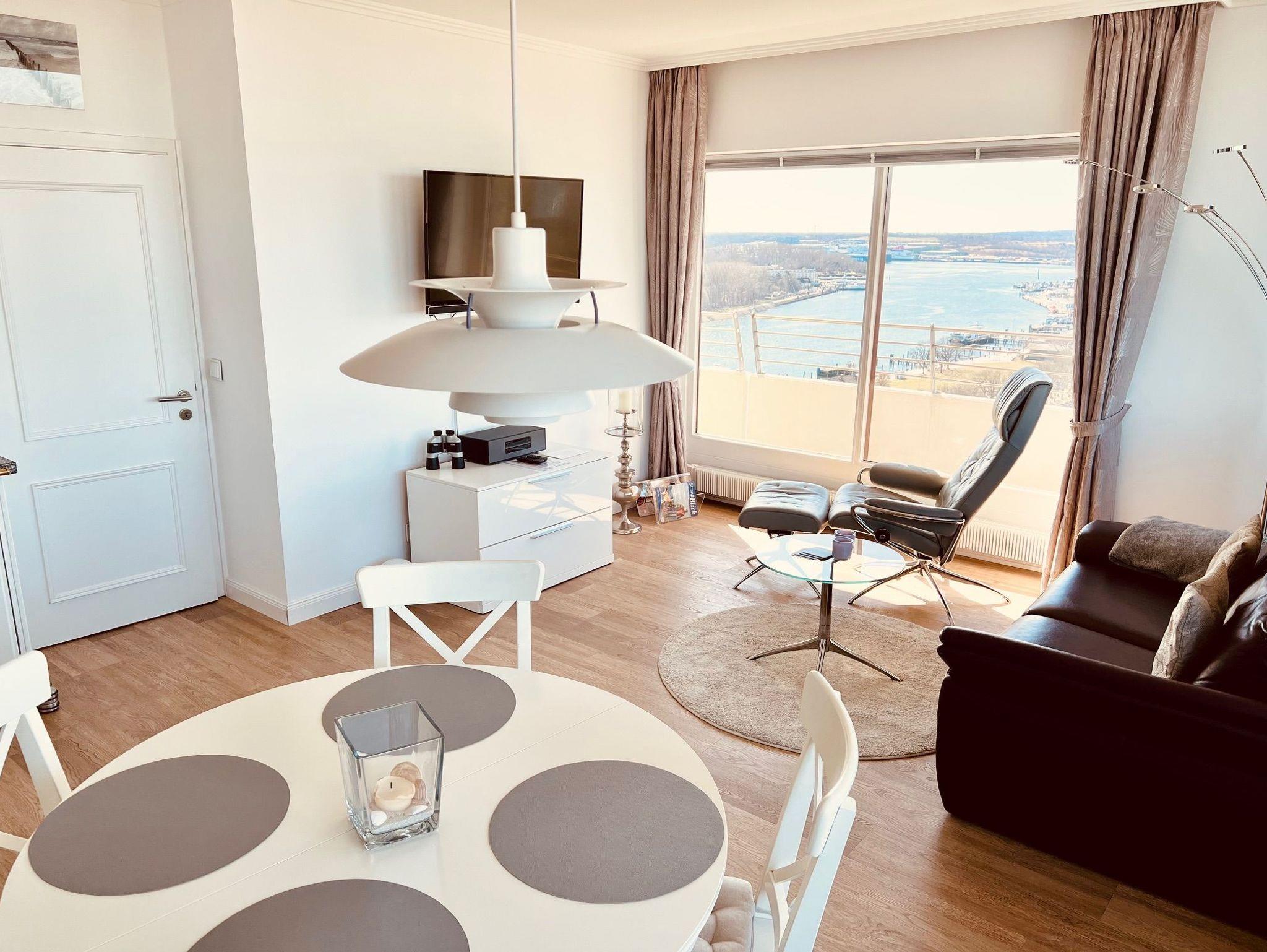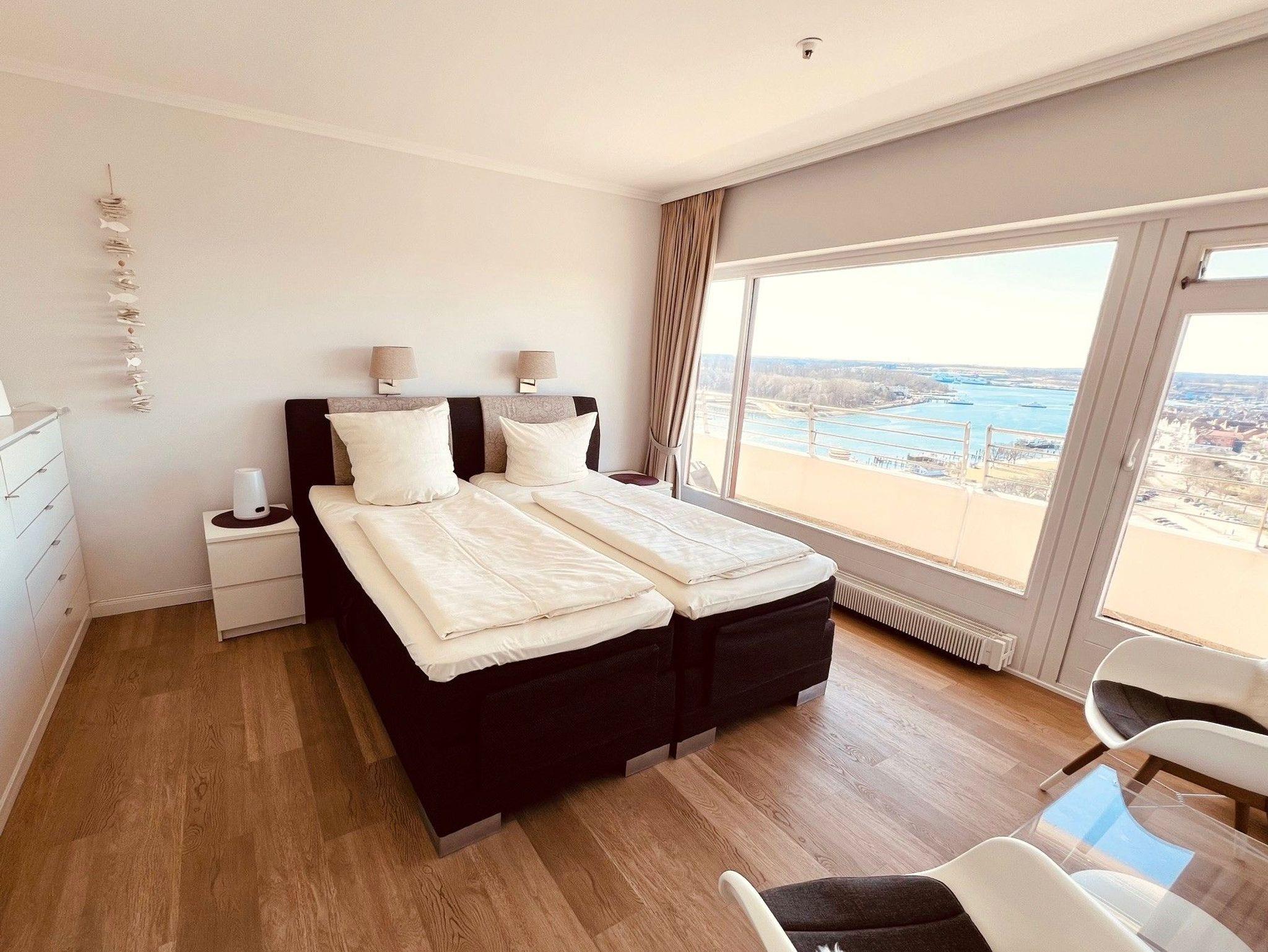Dieses komfortable Appartement bietet ein Wohnerlebnis für höchste Ansprüche und lädt zum Wohlfühlen und Entspannen fern des Alltags ein. Der helle Wohnraum ist mit einem komfortablen elektrischen Relax-Ledersofa, einem Couchtisch und einem Relax Sessel mit Fußhocker ausgestattet. Darüber hinaus ergänzt ein Esstisch mit bequemen Stühlen und ein schicker Vitrinen Schrank den Wohnbereich. Die Küchenzeile ist im Wohnraum integriert. Im Schlafzimmer befinden sich ein Boxspringbett (2 x 100 cm x 200 cm) und ein geräumiger Einbaukleiderschrank. Das moderne Bad mit vielen Extras ist einzigartig und verfügt über eine großzügige bodentiefe Dusche mit Glasabtrennung. Den sonnigen Eckbalkon erreichen Sie von beiden Wohnräumen, um den Blick auf die Lübecker Bucht, die Ostsee und die Trave mit lebhaftem Schiffsverkehr zu genießen.