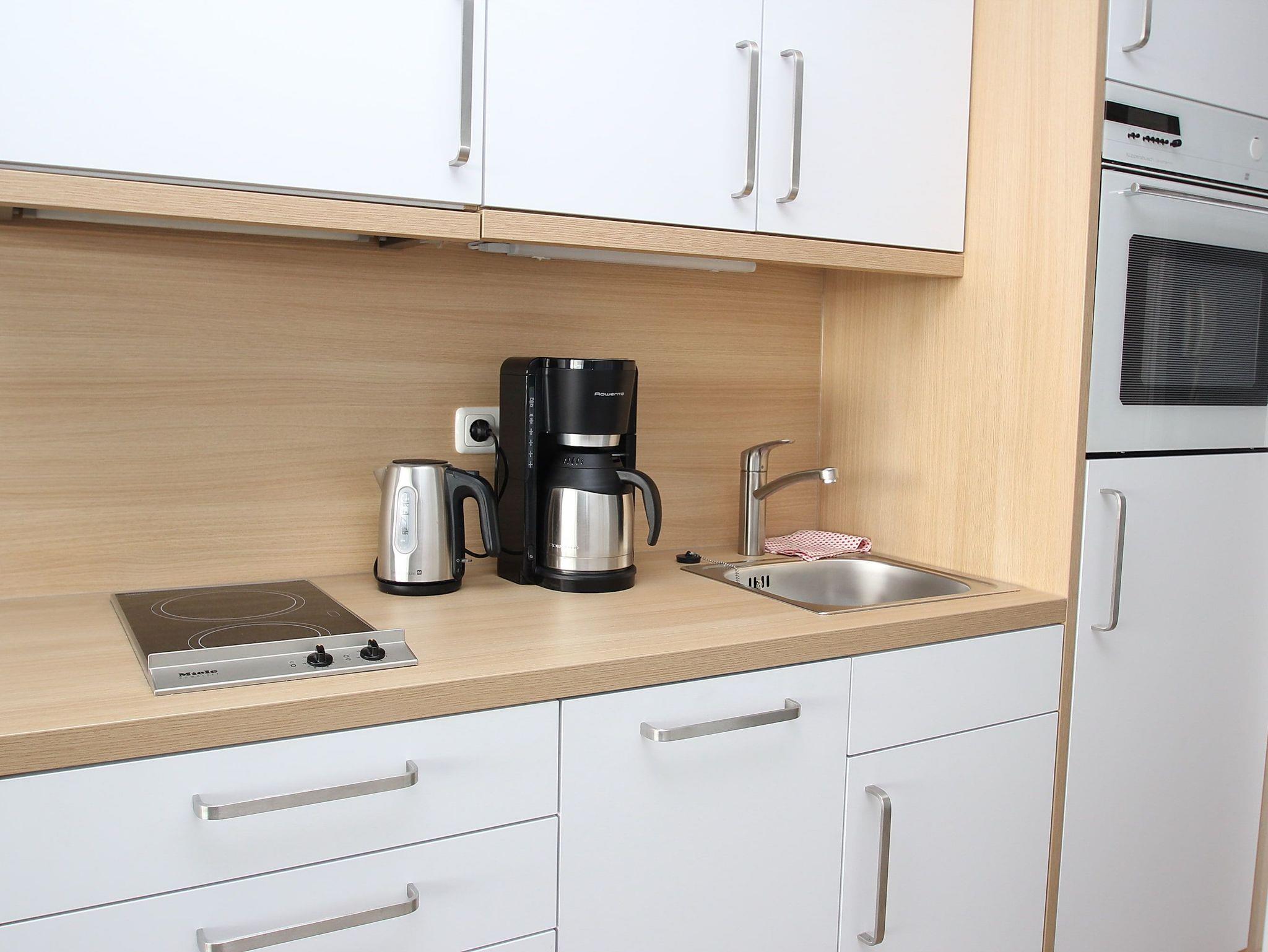 Balkon, Markise, Küchenzeile, Geschirrspüler, Duschbad/WC, Fön, TV, Stereoradio mit CD, kostenl. W-Lan, Aufzug, inkl. Tiefgaragenstellplatz (Einfahrtshöhe: 1,85 m).
