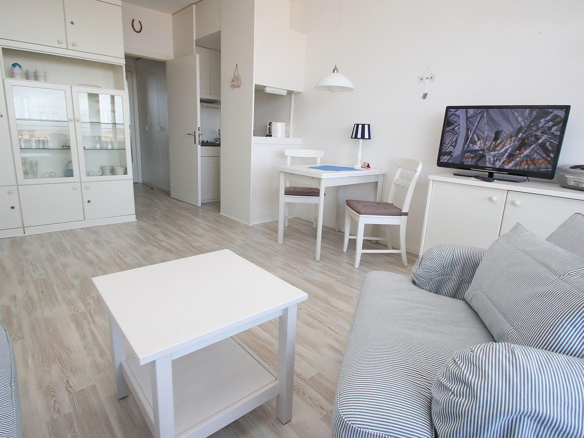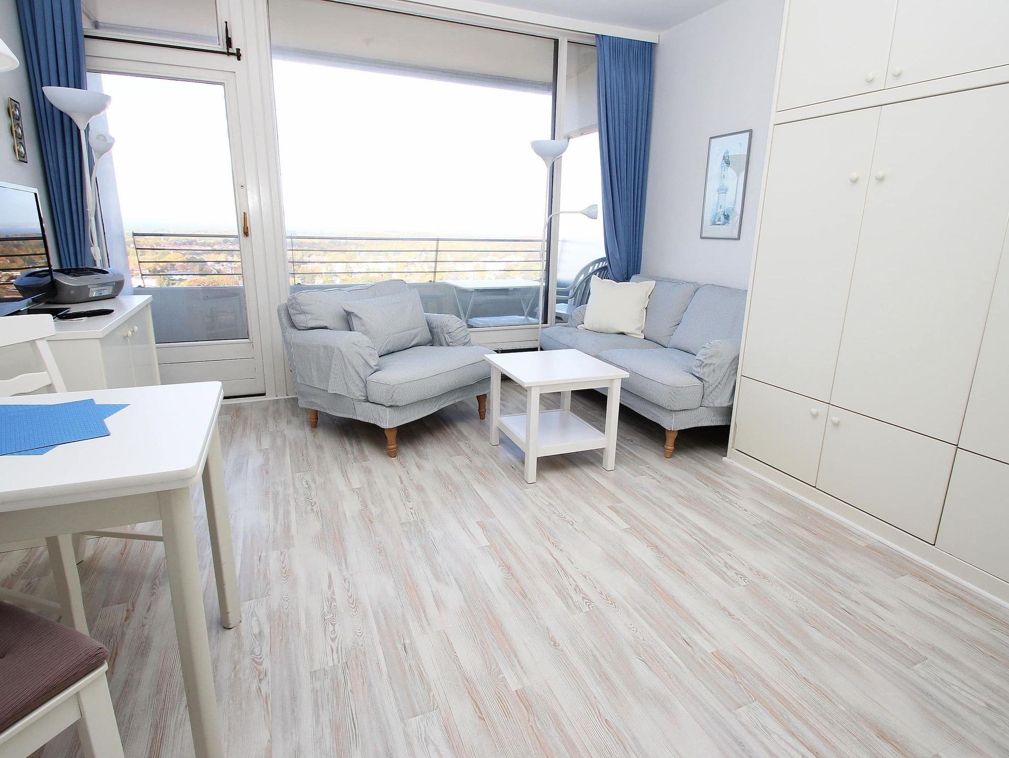 In diesem bezaubernden Appartement geht die Sonne auf! Es ist in hellblauen und weißen Farbtönen farblich sehr schön abgestimmt und lädt zum Wohlfühlen und Entspannen fern des Alltags ein. Hier können Sie aus nächster Nähe das Strandleben genießen und das beschauliche Spiel der Segelboote im Wind beobachten. Die geschmackvolle Einrichtung mit einer Sitzcouch, einem Tisch und einem passenden Sessel sowie einem kleinen Esstisch mit Stühlen neben der Pantryküche wird Ihnen gefallen. Eine geräumige, helle Glasvitrinen Schrankwand mit zwei nebeneinander integrierten Einzelbetten (je 80 cm x 190 cm) vervollständigen die Ausstattung. Vom Eingangsbereich der Wohnung erreichen Sie das helle Bad, und gegenüber finden Sie noch einen Schrank vor. Rundum eine Wohnung zum Wohlfühlen. Auf dem Balkon erwartet Sie ein traumhafter Ostseeblick, weit über die Lübecker Bucht.