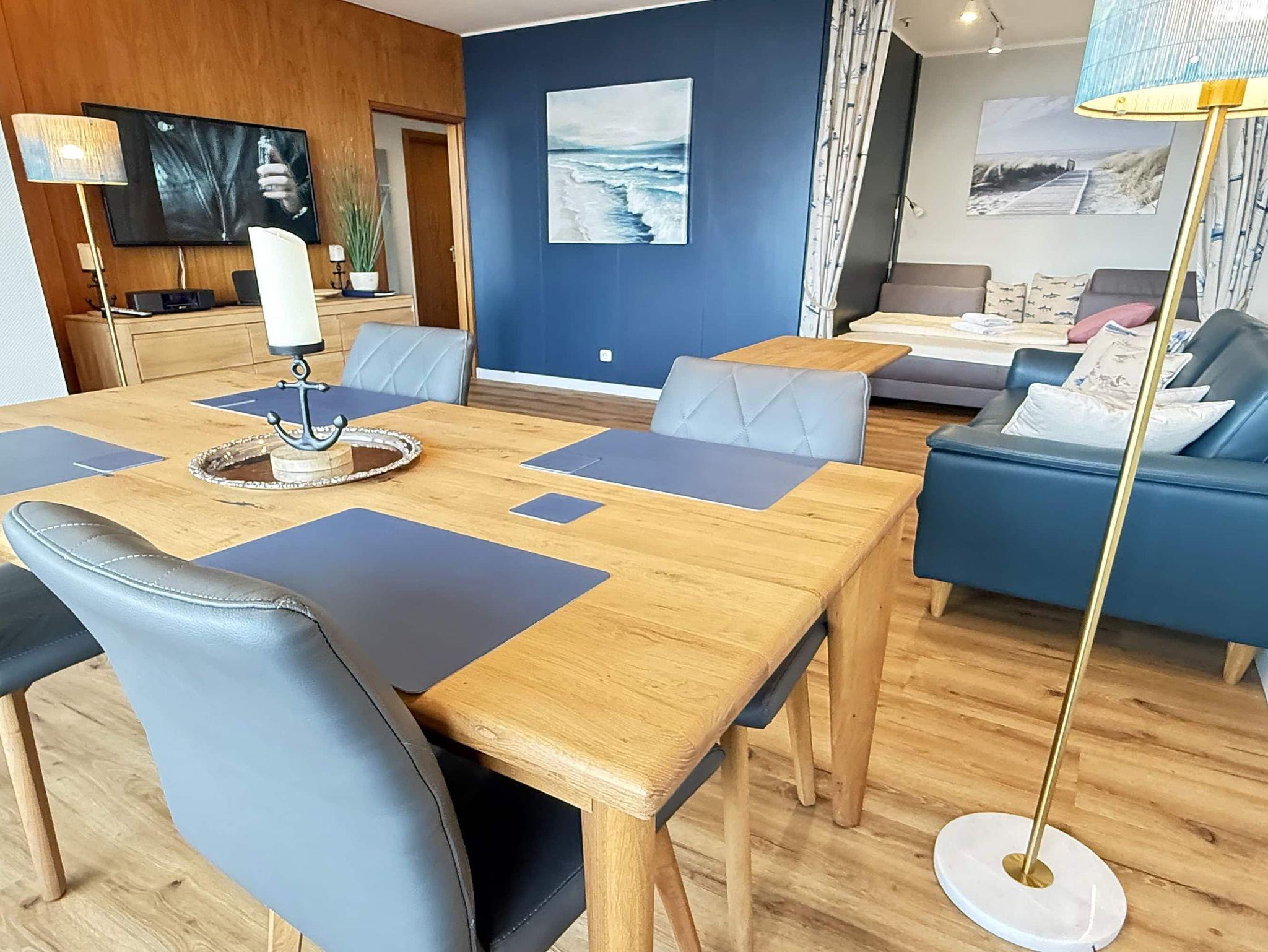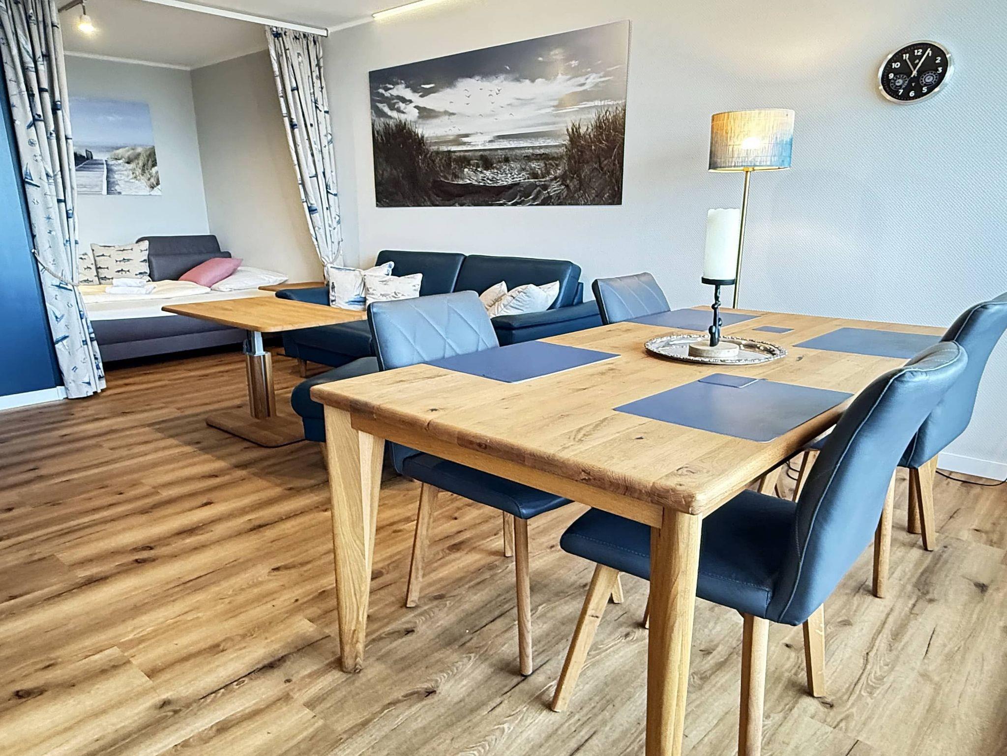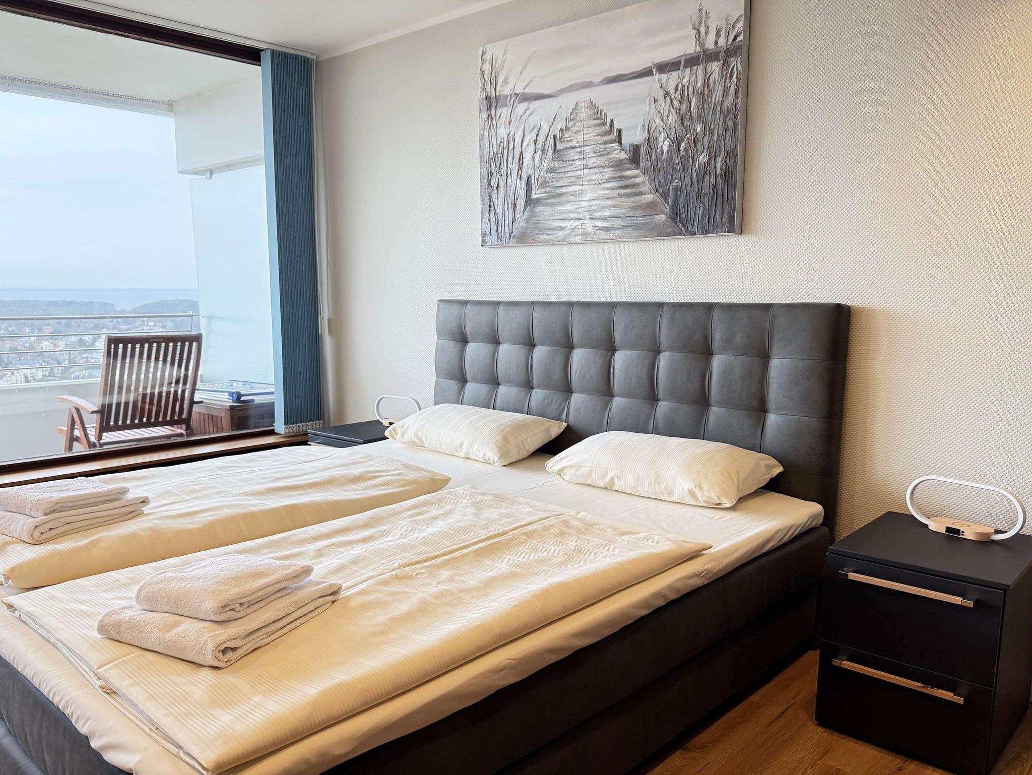 Diese stilvoll und gemütlich eingerichtete 2-Zimmer-Ferienwohnung bietet Platz für bis zu drei Personen und eignet sich hervorragend für Familien oder Paare. Der helle Wohnbereich überzeugt mit einem Essplatz, einem bequemen Sofa sowie einer Schlafcouch (140 × 200 cm), die sich in einer separaten Wohnraumnische befindet. Das Schlafzimmer ist mit einem komfortablen Boxspringbett (180 × 200 cm) und einem geräumigen Kleiderschrank ausgestattet. Vom Flur aus gelangen Sie sowohl in die voll ausgestattete Küche als auch in das modernisierte Badezimmer mit Dusche und Waschmaschine. Ein besonderes Highlight ist der großzügige Balkon, der sowohl vom Wohn- als auch vom Schlafzimmer aus zugänglich ist und einen herrlichen Blick auf Strand und Meer bietet. Dank der zentralen Lage erreichen Sie Restaurants, Einkaufsmöglichkeiten und Sehenswürdigkeiten bequem zu Fuß- beste Voraussetzungen für einen entspannten und erholsamen Urlaub.