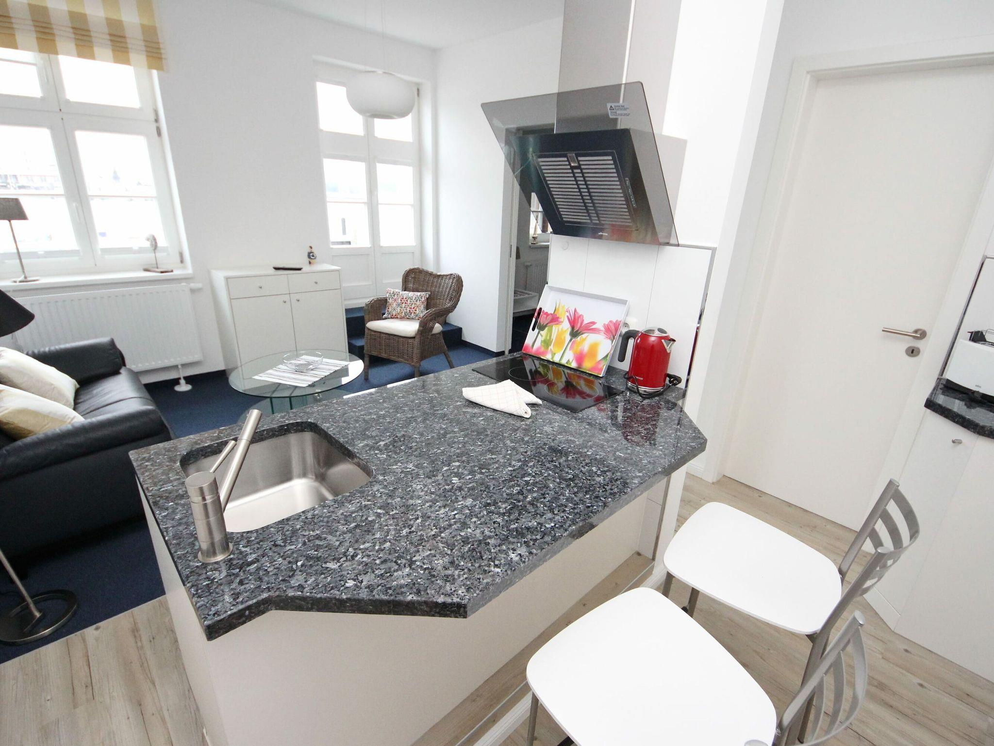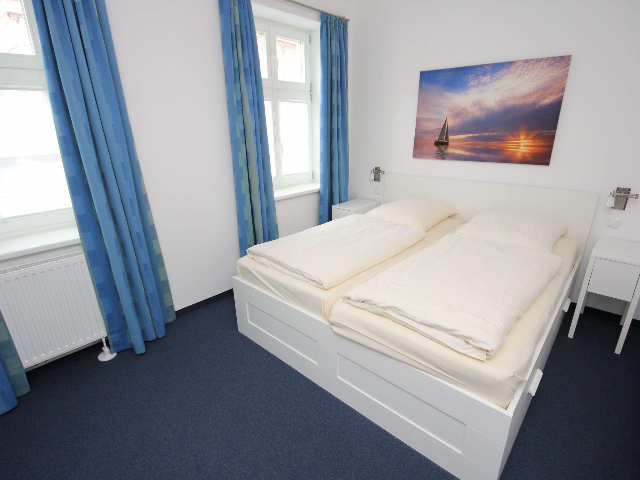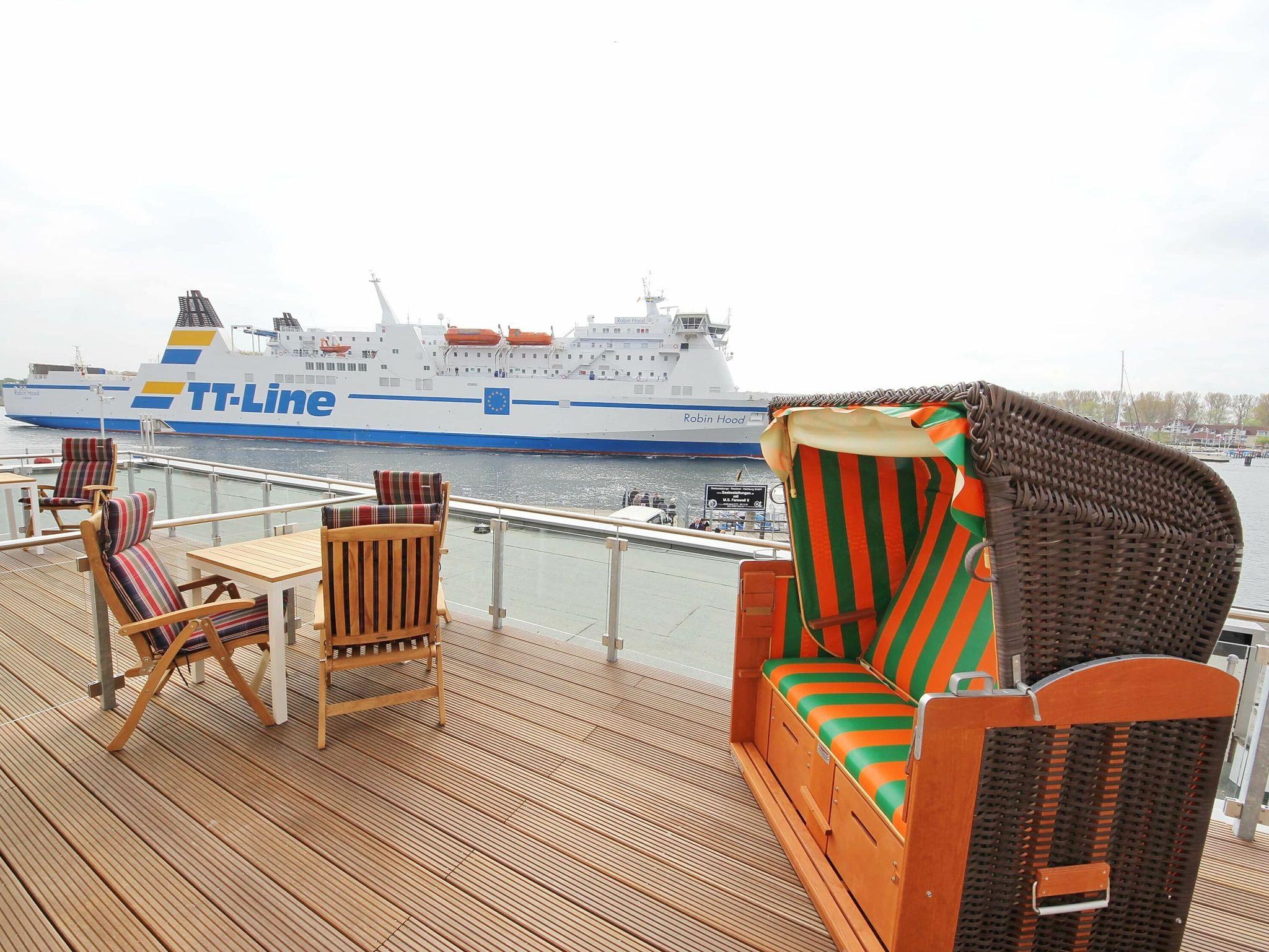 In dieser direkt an der Trave gelegenen und komplett sanierten Ferienwohnung wird Ihr Aufenthalt zu einem absolut tollen Erlebnis. Der helle Wohnraum, in den auch die moderne, offene Küchenzeile mit Esstresen integriert ist, ist sehr geschmackvoll mit einer bequemen Couch mit Tisch und einem Sessel eingerichtet. Vom Wohnzimmer erreichen Sie durch eine Schiebetür ein kleines, gemütliches Zimmer, das mit einer Sitz-/Schlafcouch (180 cm x 200 cm) und Einbauschränken ausgestattet ist. Im Schlafzimmer, das vom Flur abgeht, stehen ein Doppelbett (2x 90 cm x 200 cm) und ein großzügiger Kleiderschrank. Ebenfalls gelangen Sie vom Flur in das schöne Duschbad. Von der sonnigen Dachterrasse, die Sie vom Wohnbereich erreichen, genießen Sie die frische Seeluft und können aus direkter Nähe die Schiffe beobachten. Aktuelle Livebilder vom Ausblick dieses Feriendomizils sehen Sie auf den Webcams 3 und 4. Ein Bäcker befindet sich im Erdgeschoss.