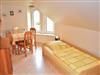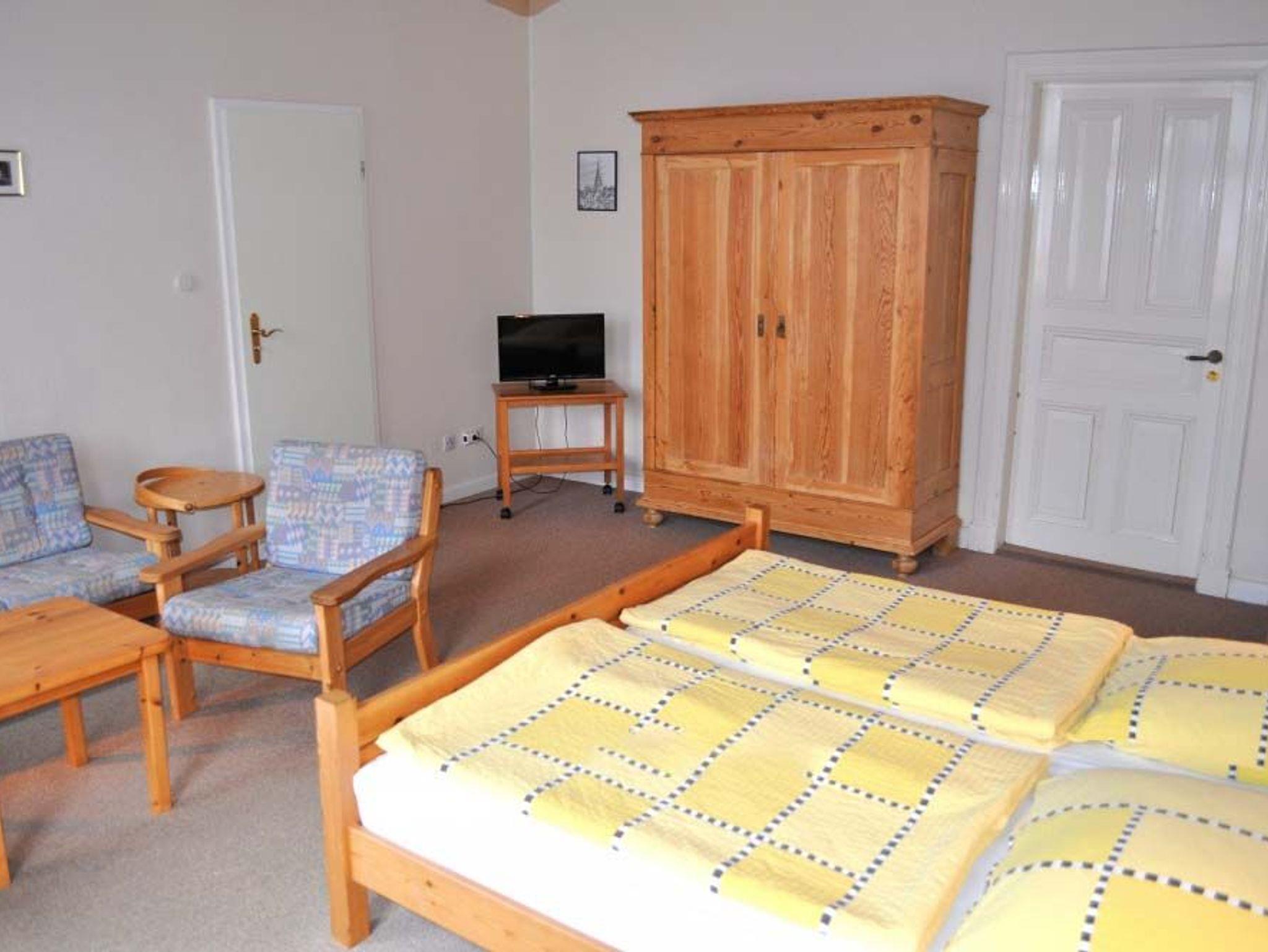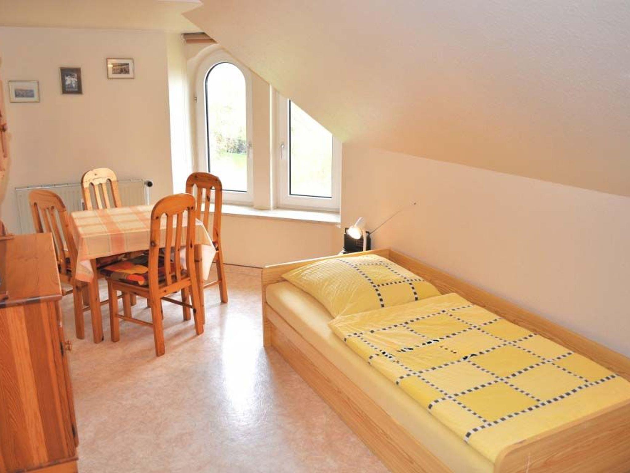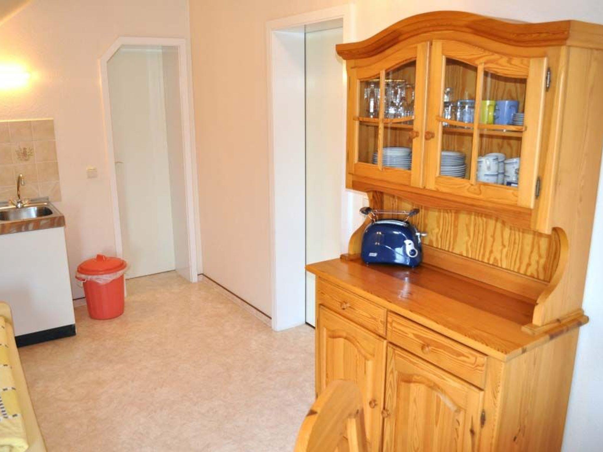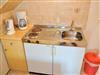 Schlafzimmer 1: 2 Plattenherd, Einzelbett, Essecke, Geschirr, Kaffeemaschine, Kochtöpfe, Küchenschrank, Küchenzeile, Kühlschrank, Radio, Wasserkocher