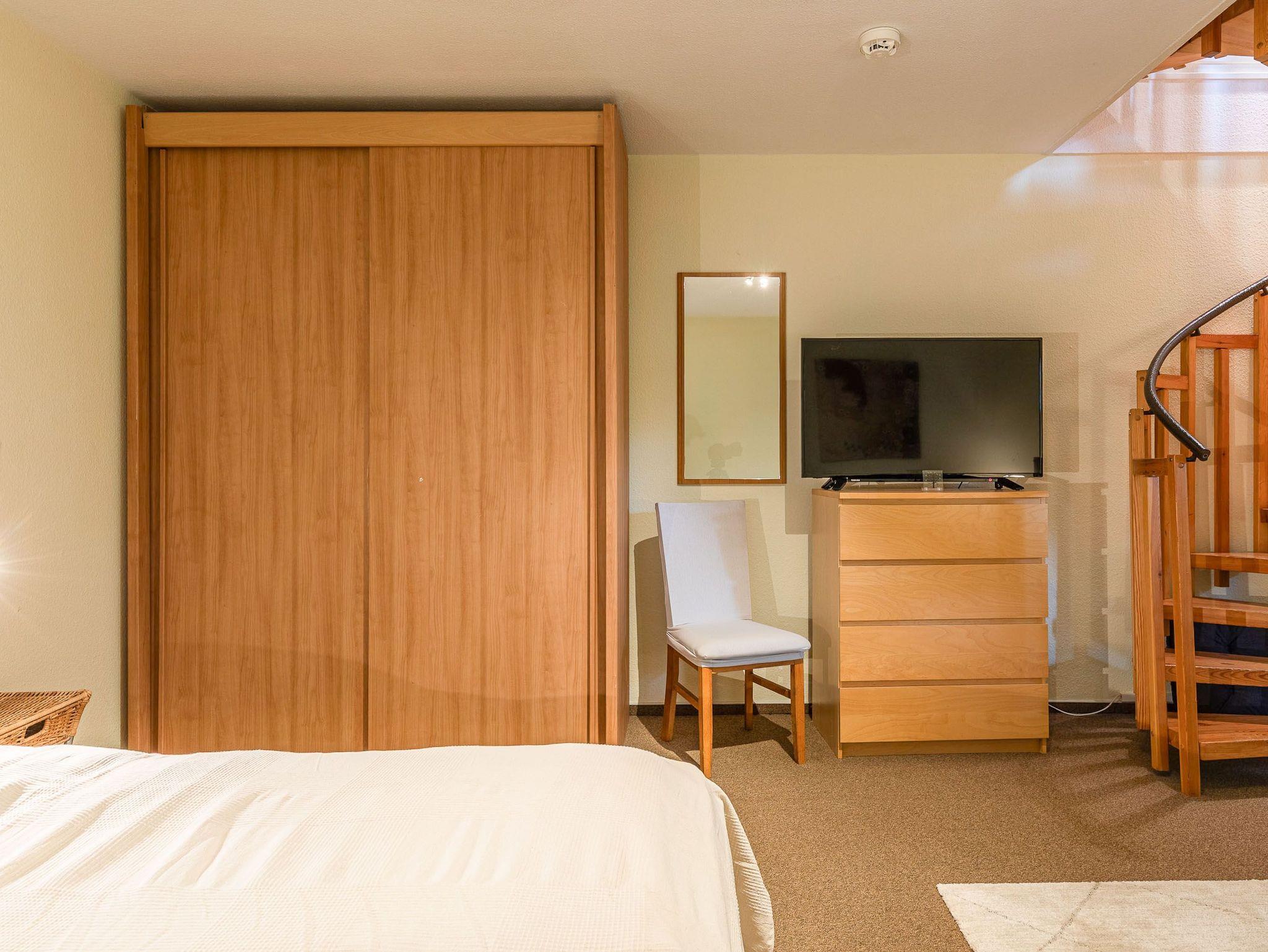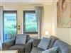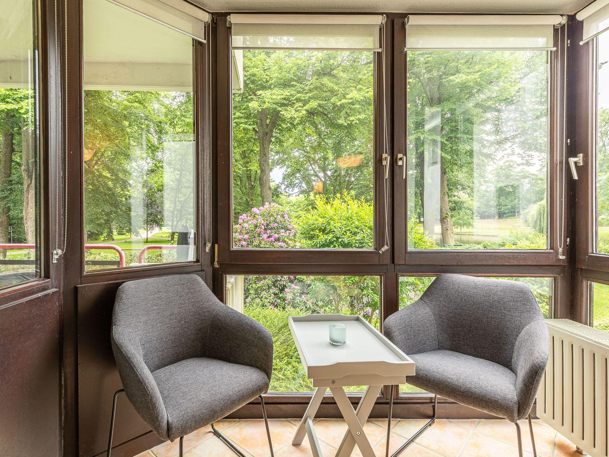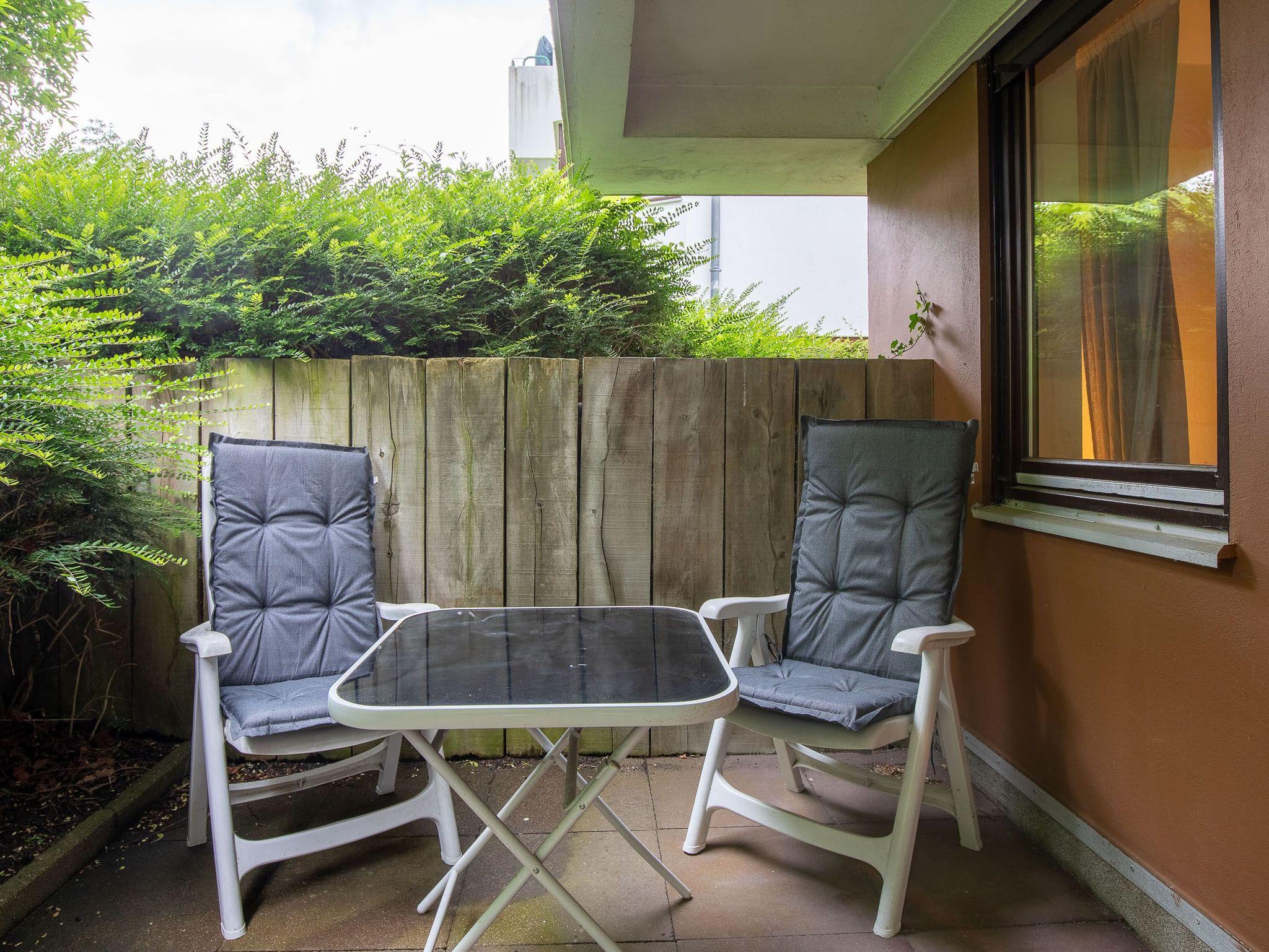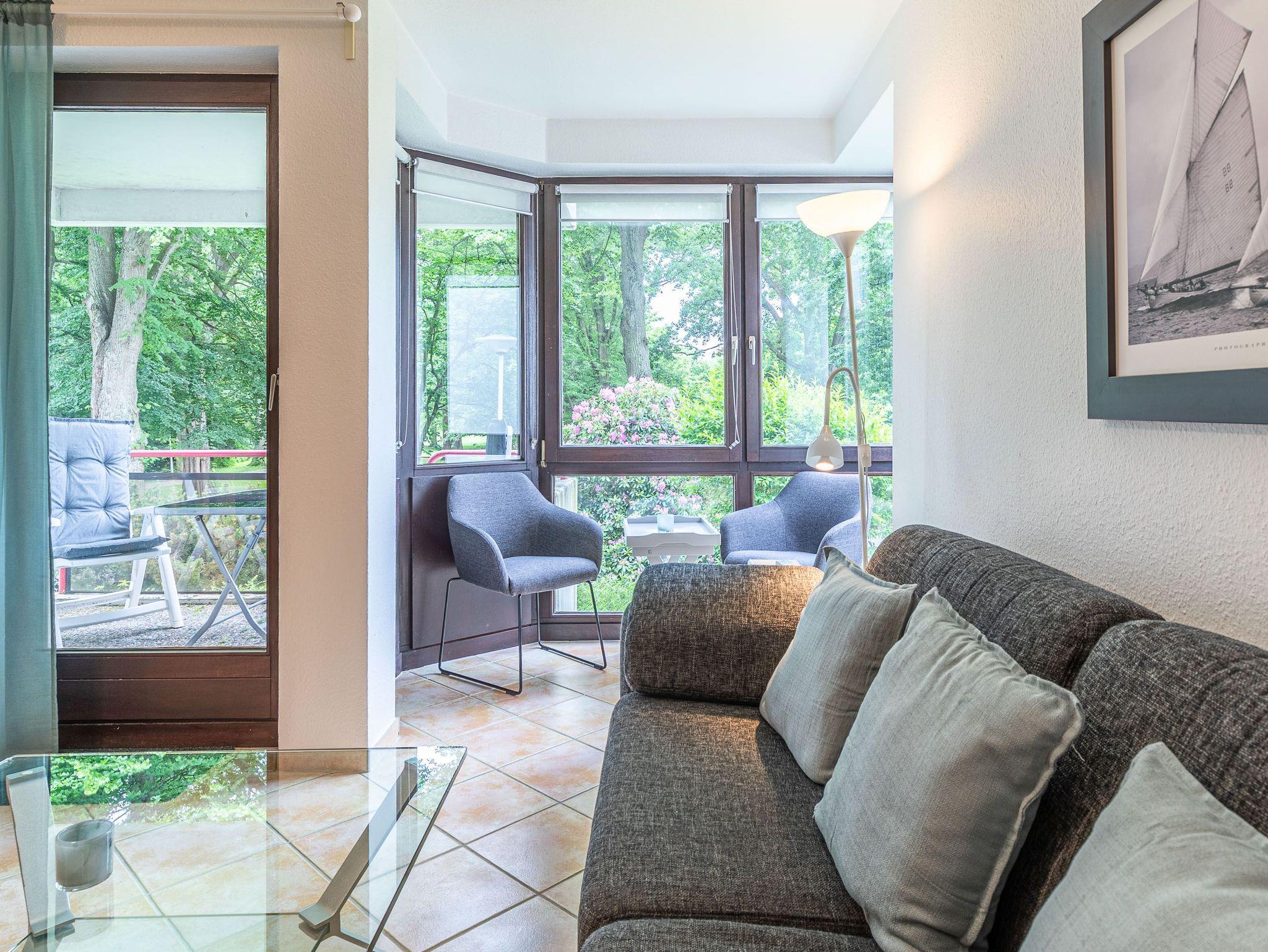 Diese großzügig geschnittene 3-Zimmer-Wohnung verläuft über zwei Ebenen. Sie bietet ausreichend Platz für einen Urlaub mit der ganzen Familie. Im Hochparterre befindet sich der Wohnraum mit kleinem Erker, der mit einer gemütlichen Couch, einem Tisch, einem Relaxsessel mit Fußhocker am Fenster und einem Wohnzimmerschrank möbliert ist. Die Küche geht vom Wohnbereich ab. Ebenfalls finden Sie auf dieser Ebene ein Schlafzimmer mit zwei Einzelbetten (je 90 cm x 200 cm) und zwei Kleiderschränken sowie das Badezimmer. Im Souterrain, durch eine Wendeltreppe vom Wohnzimmer erreichbar und mit Zugang zur überdachten Terrasse, stehen eine Couch, ein Sessel mit Tisch, ein komfortables Doppelbett (2x 90 cm x 200 cm) und ein Kleiderschrank. Vom Balkon im Hochparterre genießen Sie den herrlichen Blick auf die schöne Parkanlage.