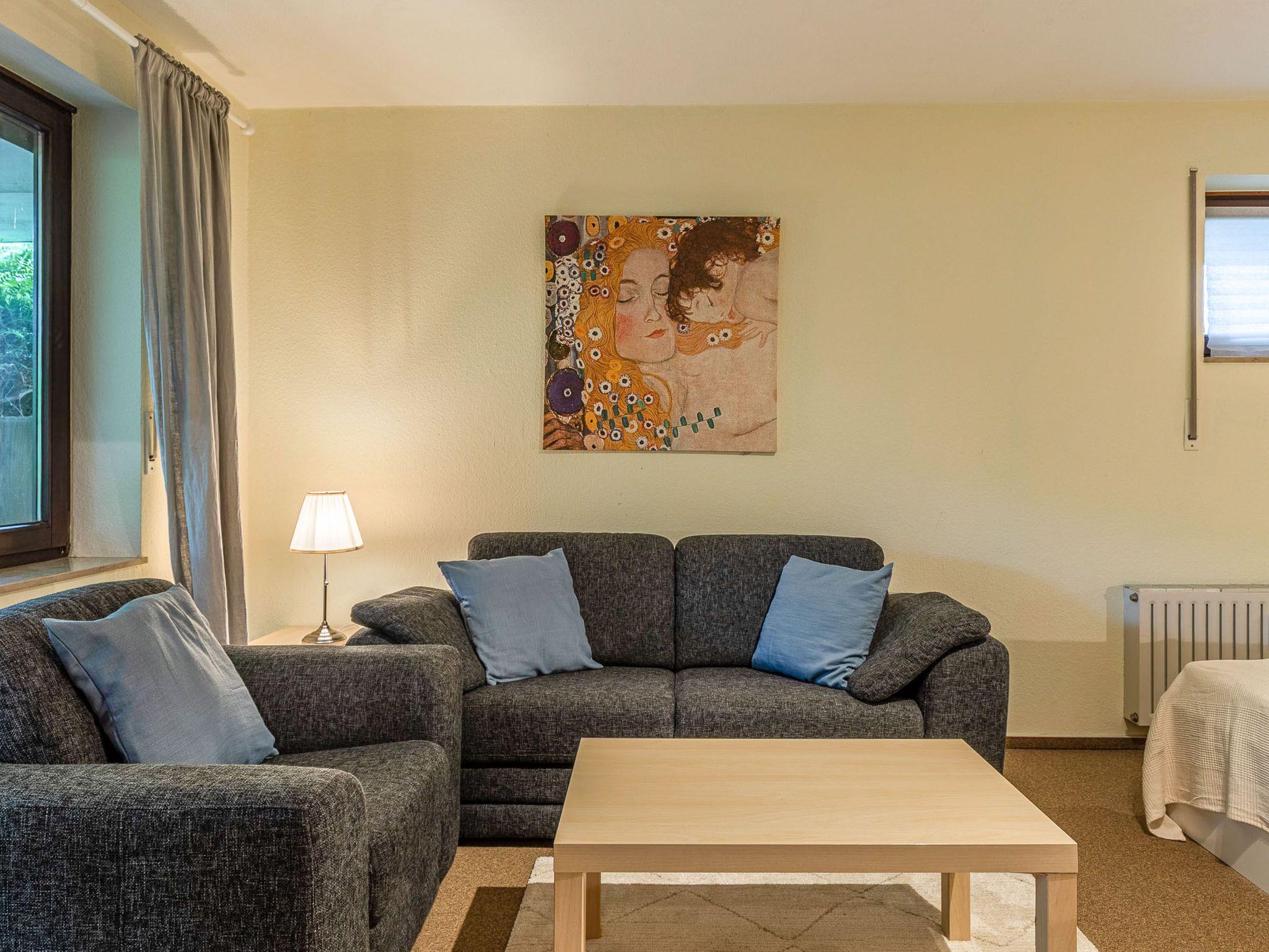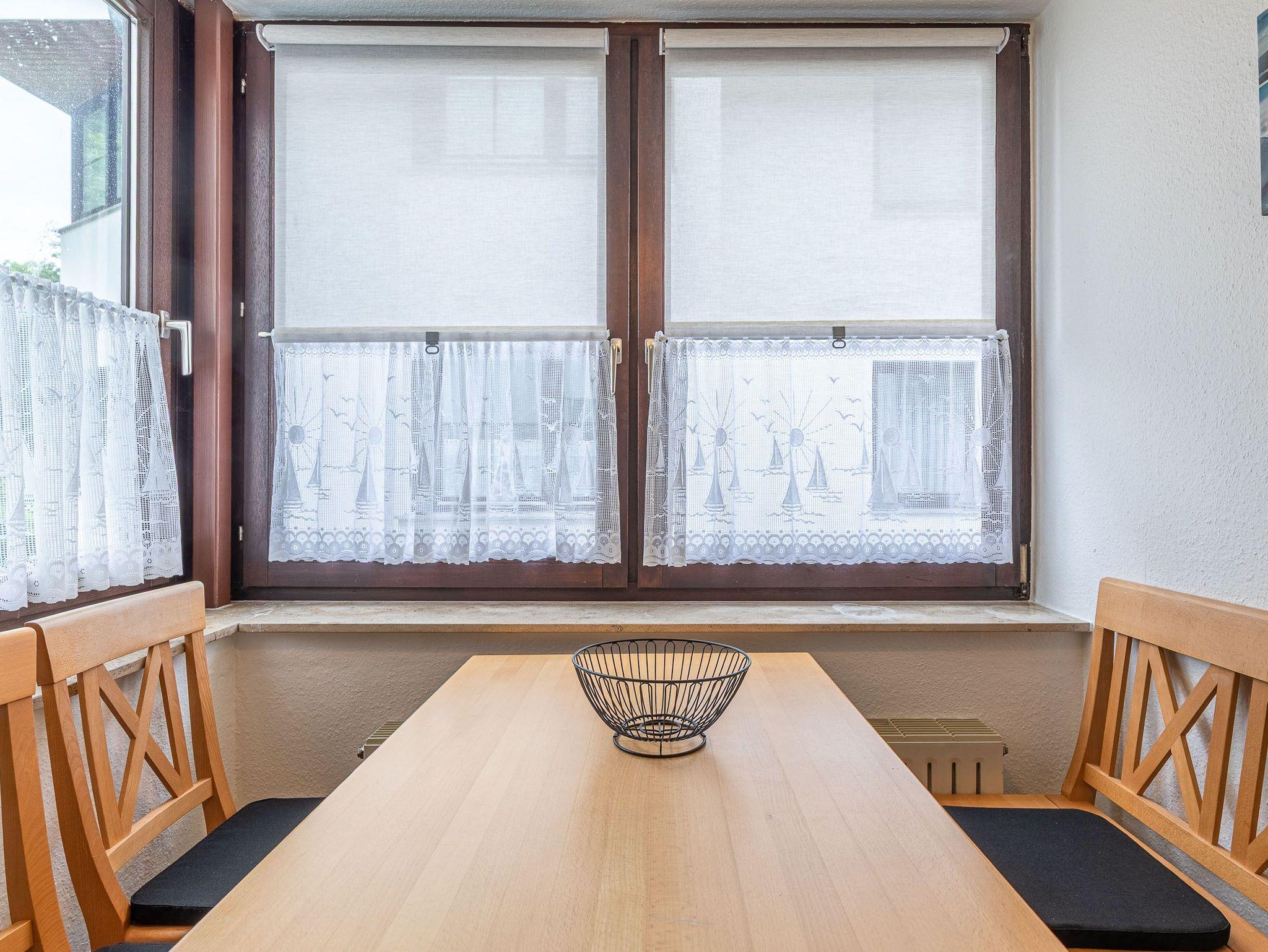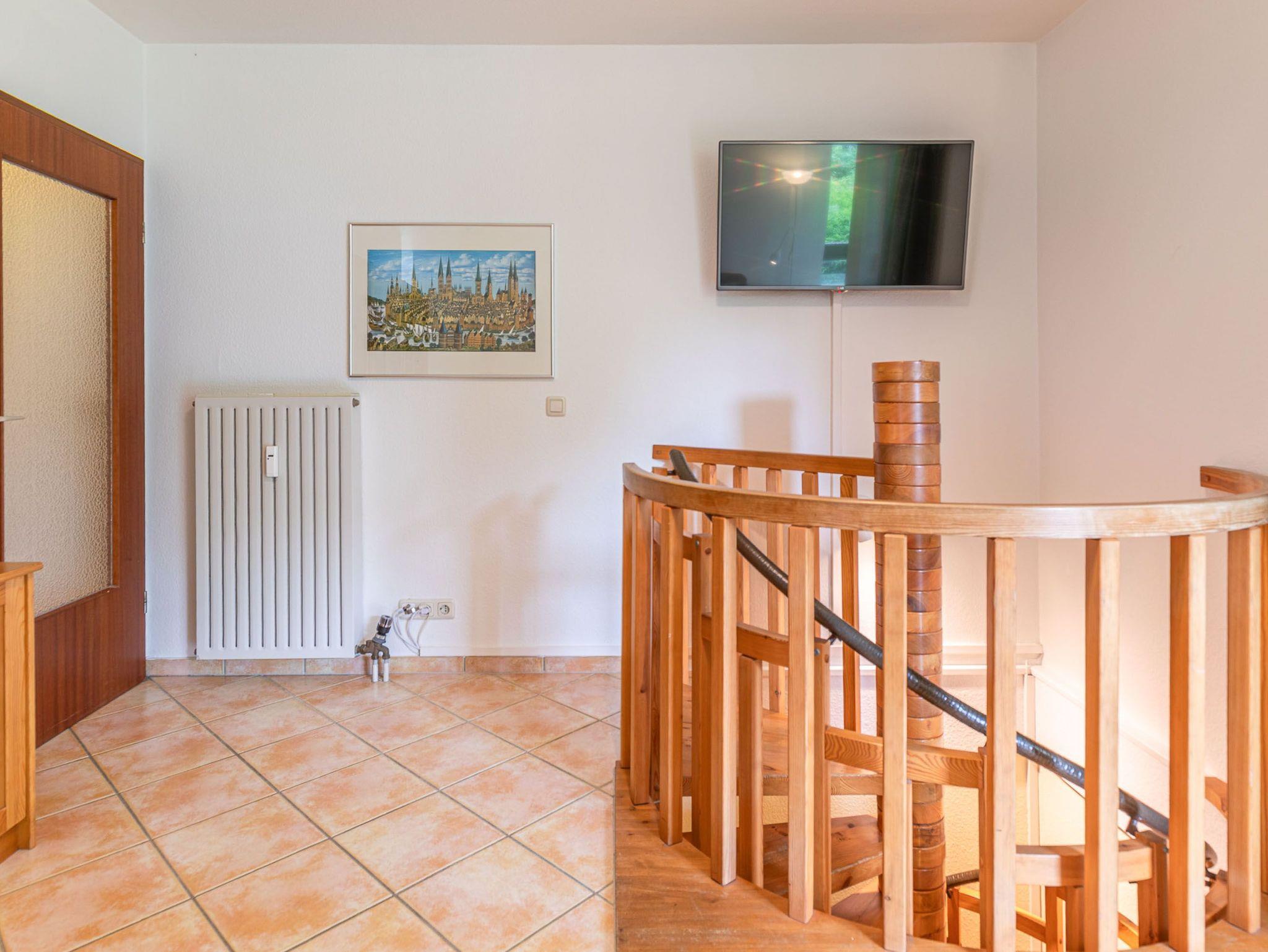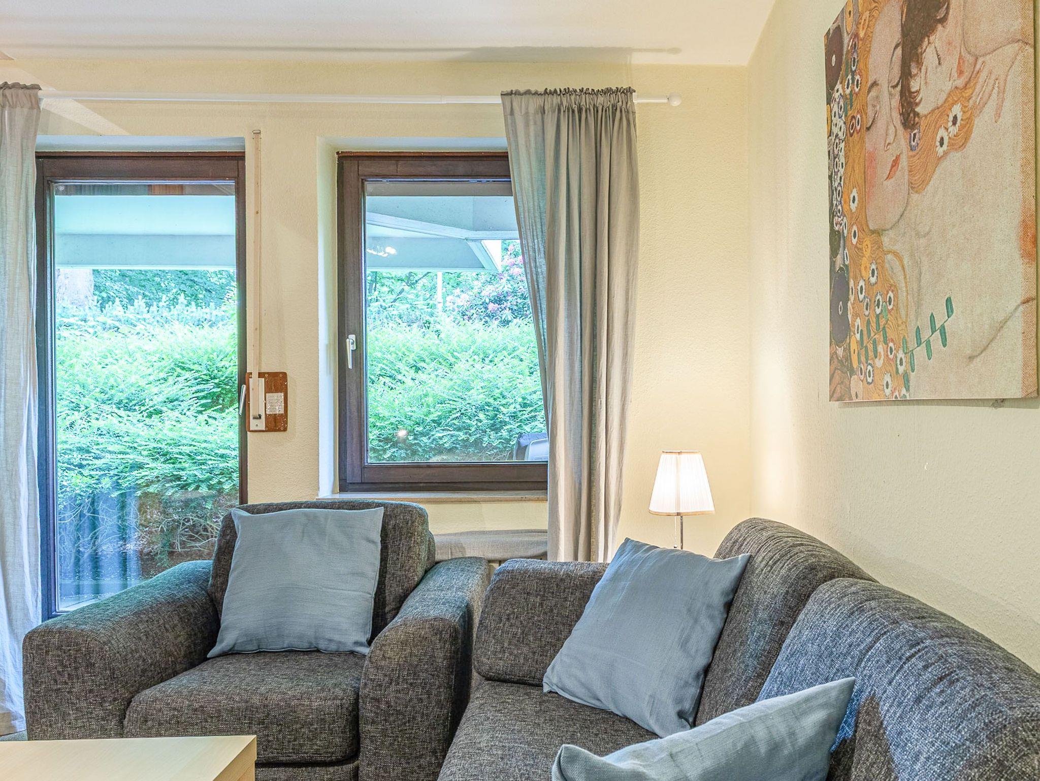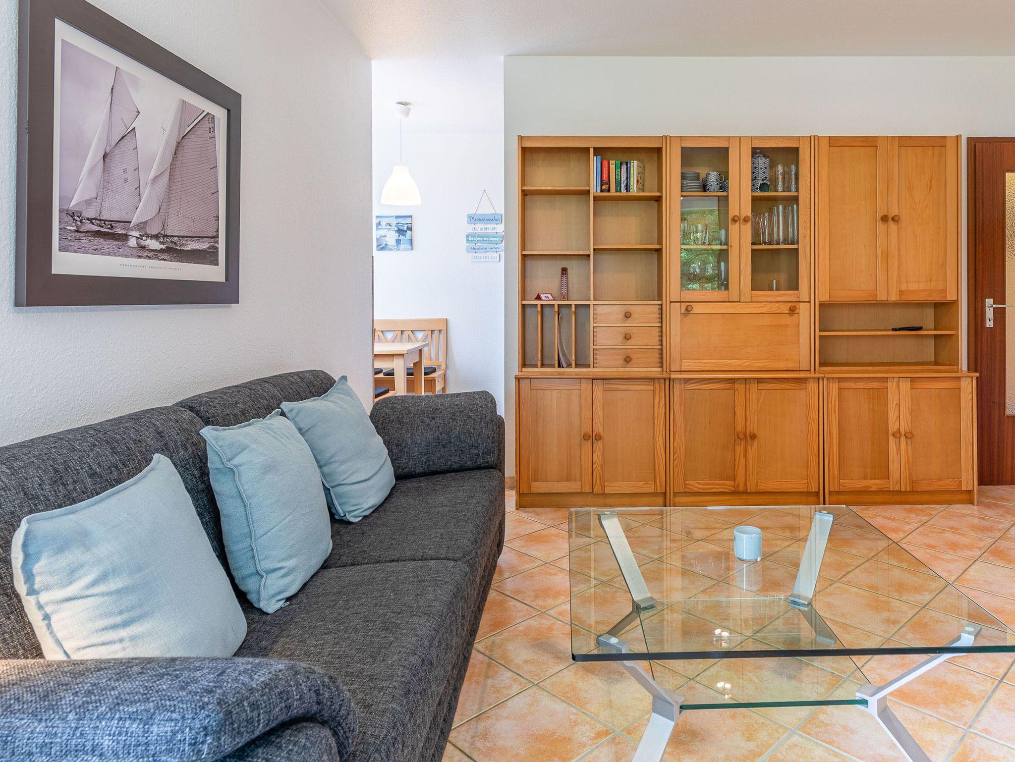 Diese großzügig geschnittene 3-Zimmer-Wohnung verläuft über zwei Ebenen. Sie bietet ausreichend Platz für einen Urlaub mit der ganzen Familie. Im Hochparterre befindet sich der Wohnraum mit kleinem Erker, der mit einer gemütlichen Couch, einem Tisch, einem Relaxsessel mit Fußhocker am Fenster und einem Wohnzimmerschrank möbliert ist. Die Küche geht vom Wohnbereich ab. Ebenfalls finden Sie auf dieser Ebene ein Schlafzimmer mit zwei Einzelbetten (je 90 cm x 200 cm) und zwei Kleiderschränken sowie das Badezimmer. Im Souterrain, durch eine Wendeltreppe vom Wohnzimmer erreichbar und mit Zugang zur überdachten Terrasse, stehen eine Couch, ein Sessel mit Tisch, ein komfortables Doppelbett (2x 90 cm x 200 cm) und ein Kleiderschrank. Vom Balkon im Hochparterre genießen Sie den herrlichen Blick auf die schöne Parkanlage.