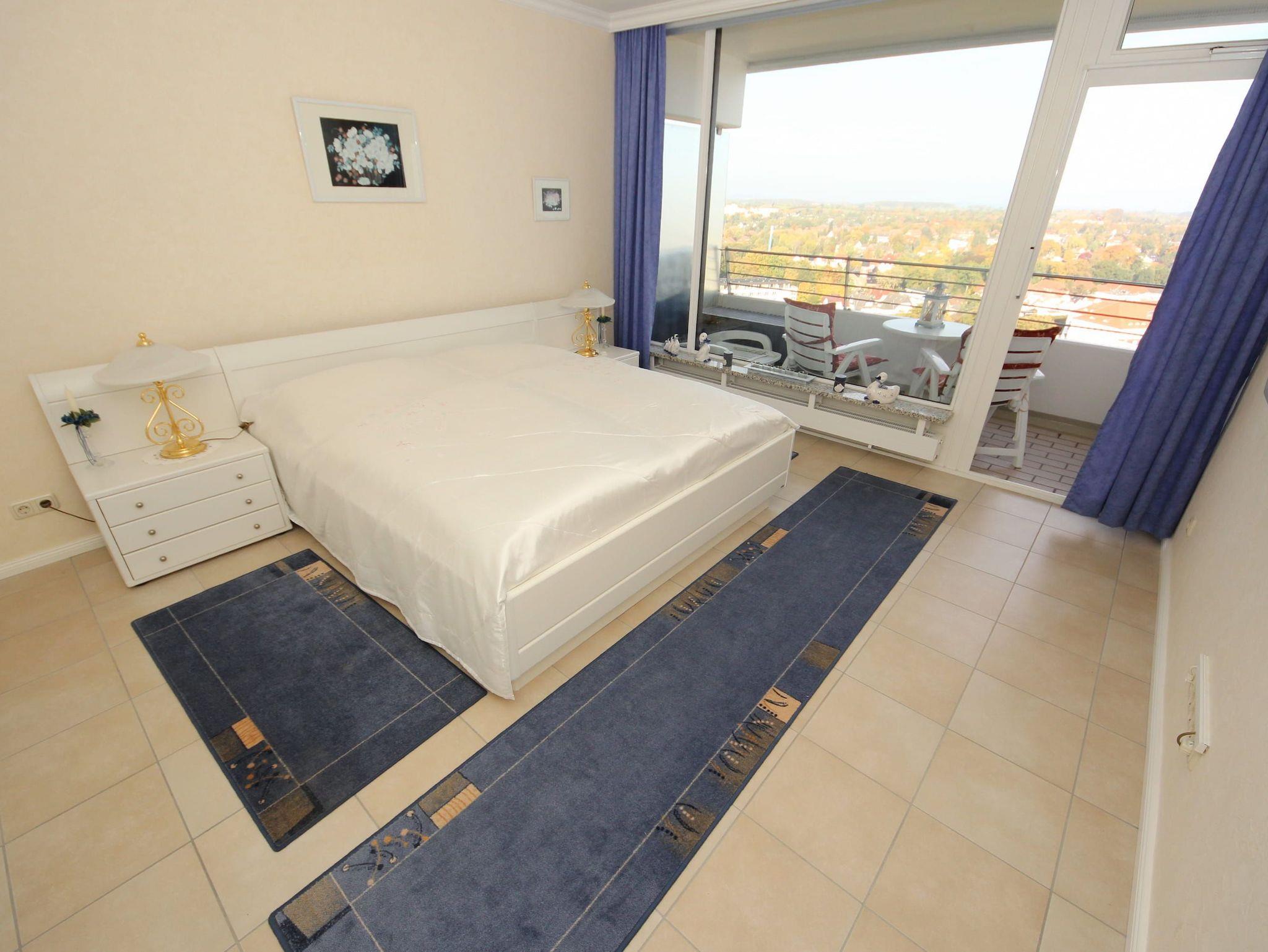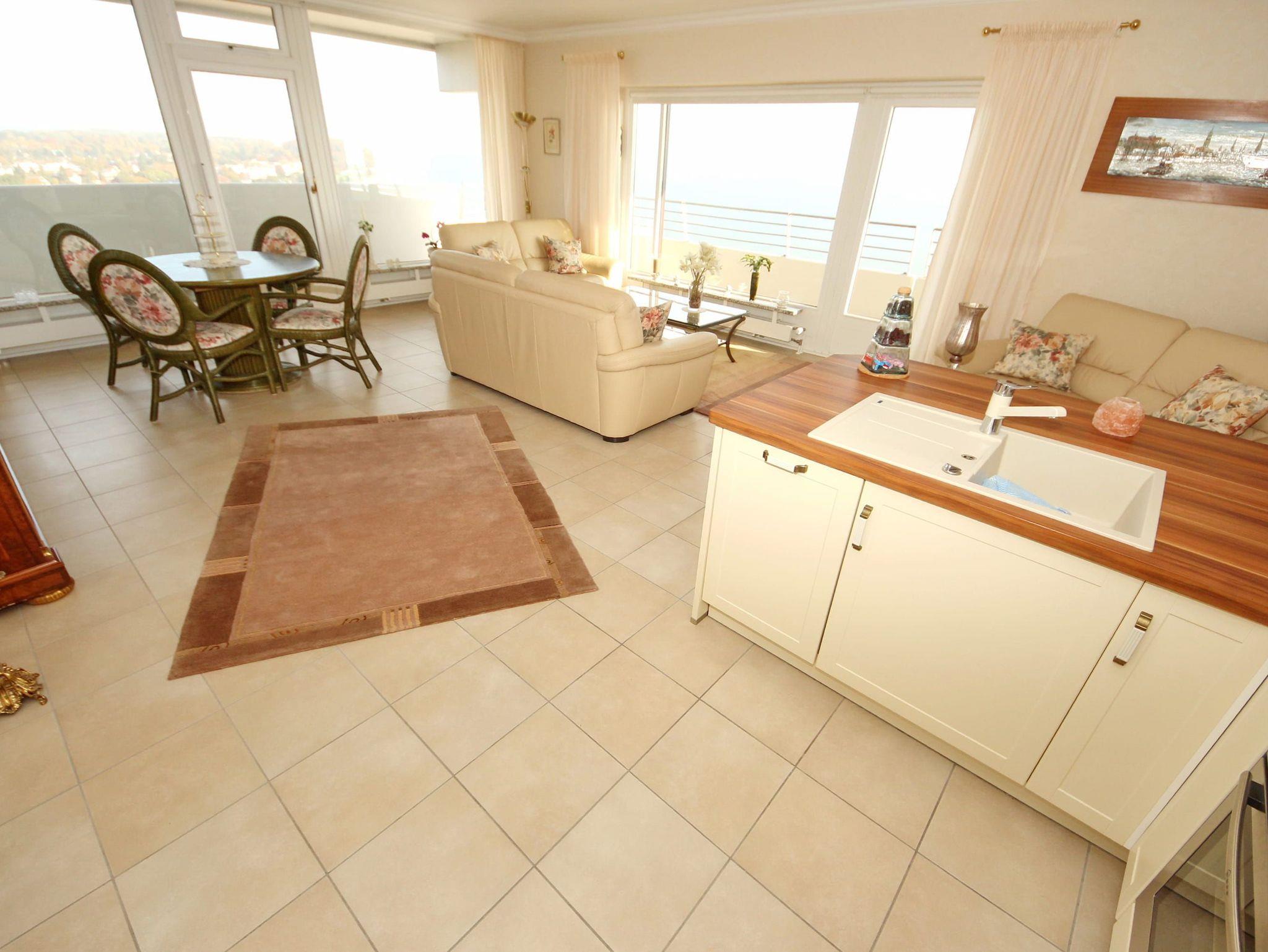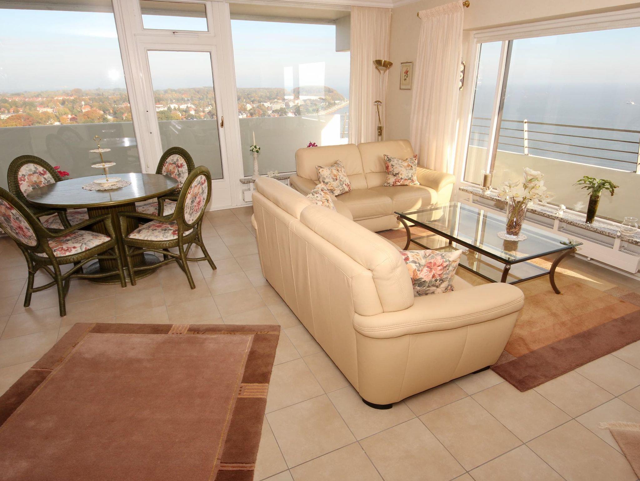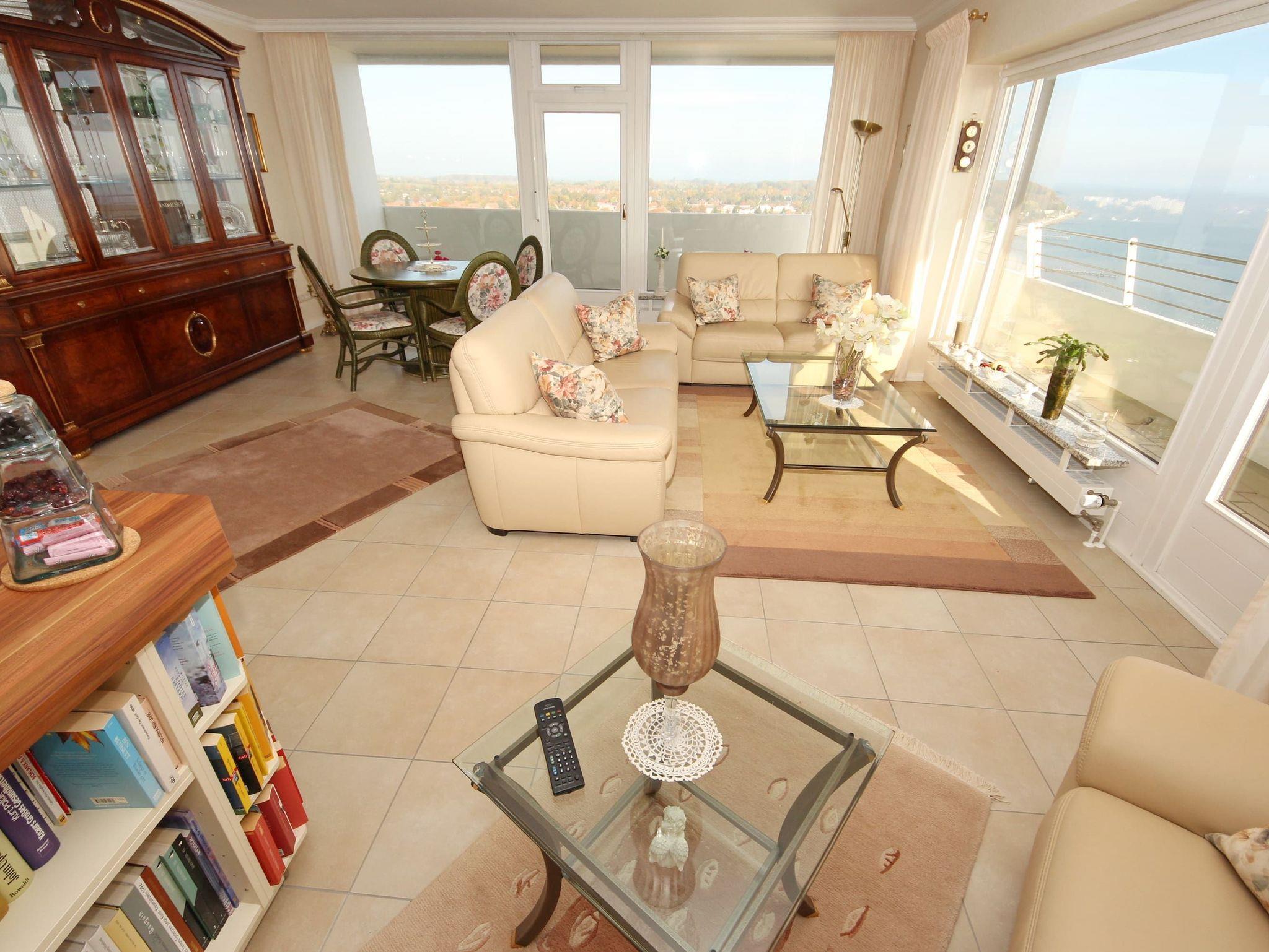 Dieses elegante 2-Zimmer-Appartement hat eine exklusive Ausstattung, die allen Ansprüchen entspricht und sofort zum Wohlfühlen einlädt. Der großzügige, helle Wohnraum hat eine moderne, offene Einbauküche. Die weitere Einrichtung besteht aus einer schönen, dreiteiligen Couchgarnitur mit Tischen, einer Essecke direkt am Fenster und einem antiken Glasvitrinenschrank. Im Schlafzimmer befinden sich ein großes, bequemes Doppelbett (2x 90 cm x 200 cm) und ein geräumiger Einbaukleiderschrank. Das moderne Duschbad erreichen Sie vom Flur. Beide Wohnräume sind hell und freundlich und haben einen Zugang zum großen Eckbalkon. Hier genießen Sie einen uneingeschränkten Panoramablick direkt auf die Ostsee und zur Lübecker Bucht mit lebhaftem Schiffsverkehr.