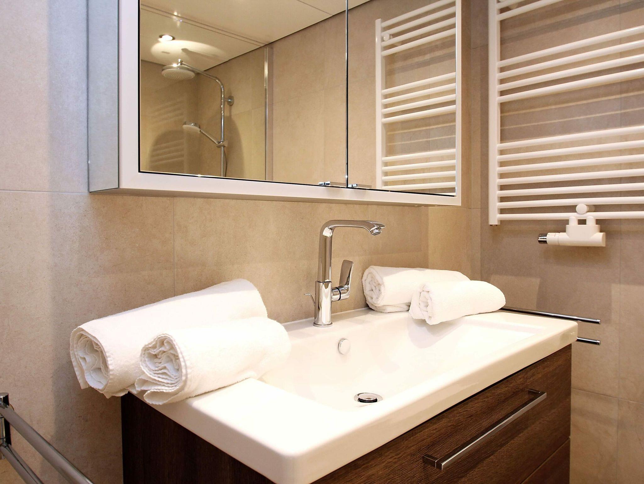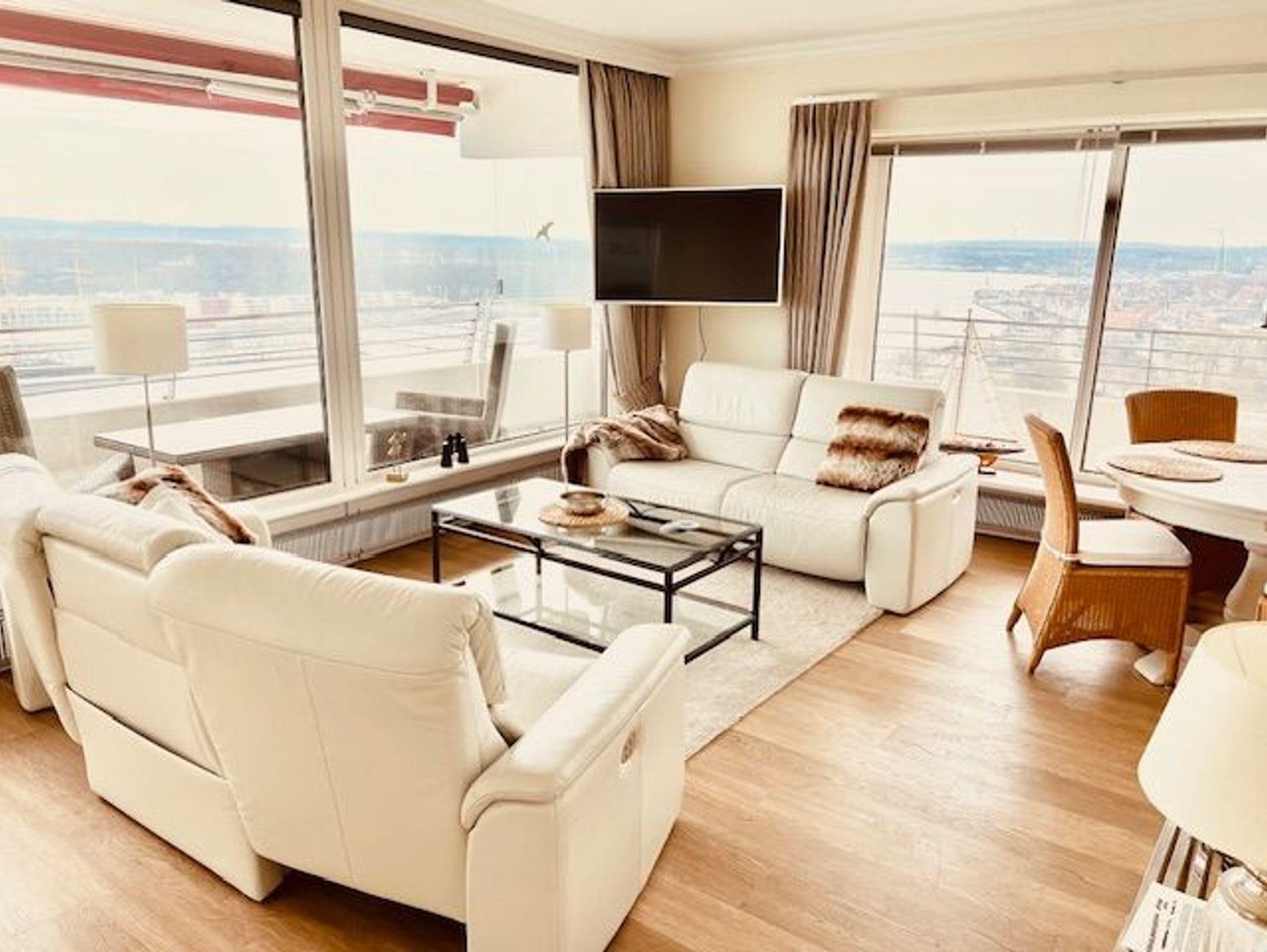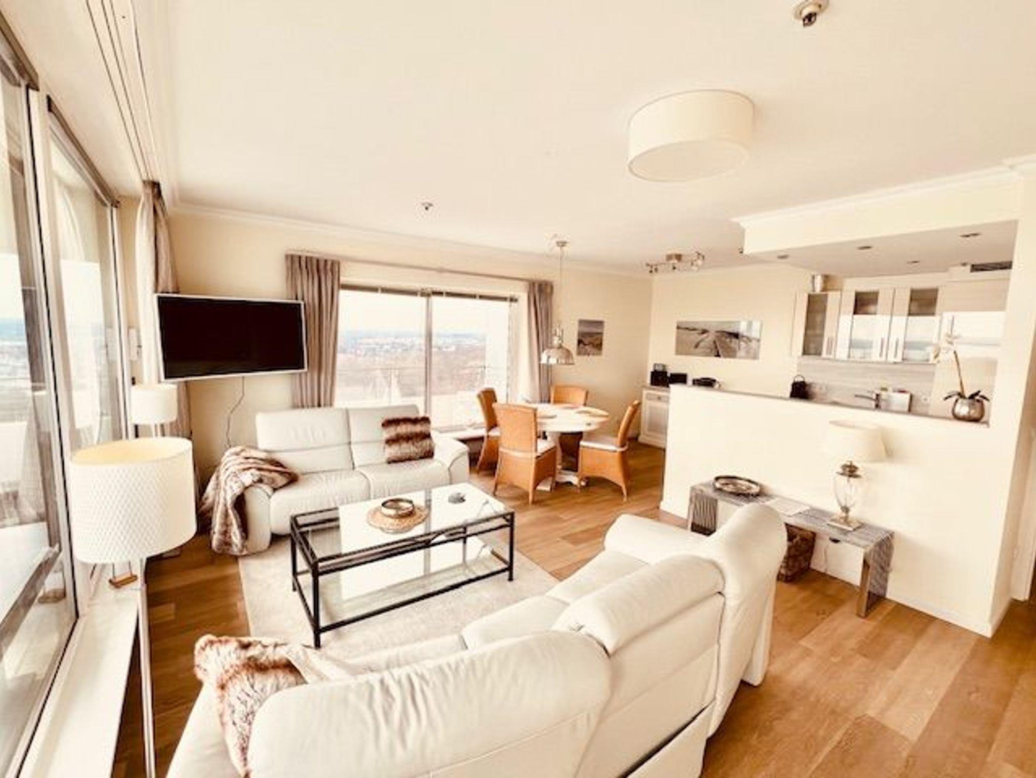 Umlaufende Loggia von ca. 21 m², elektr. Markisen, Küche, Geschirrspüler, Duschbad/WC, Fön, TV, Stereoanlage, kostenl. W-Lan, Aufzug, inkl. Tiefgaragenstellplatz (Einfahrtshöhe: 1,85 m).