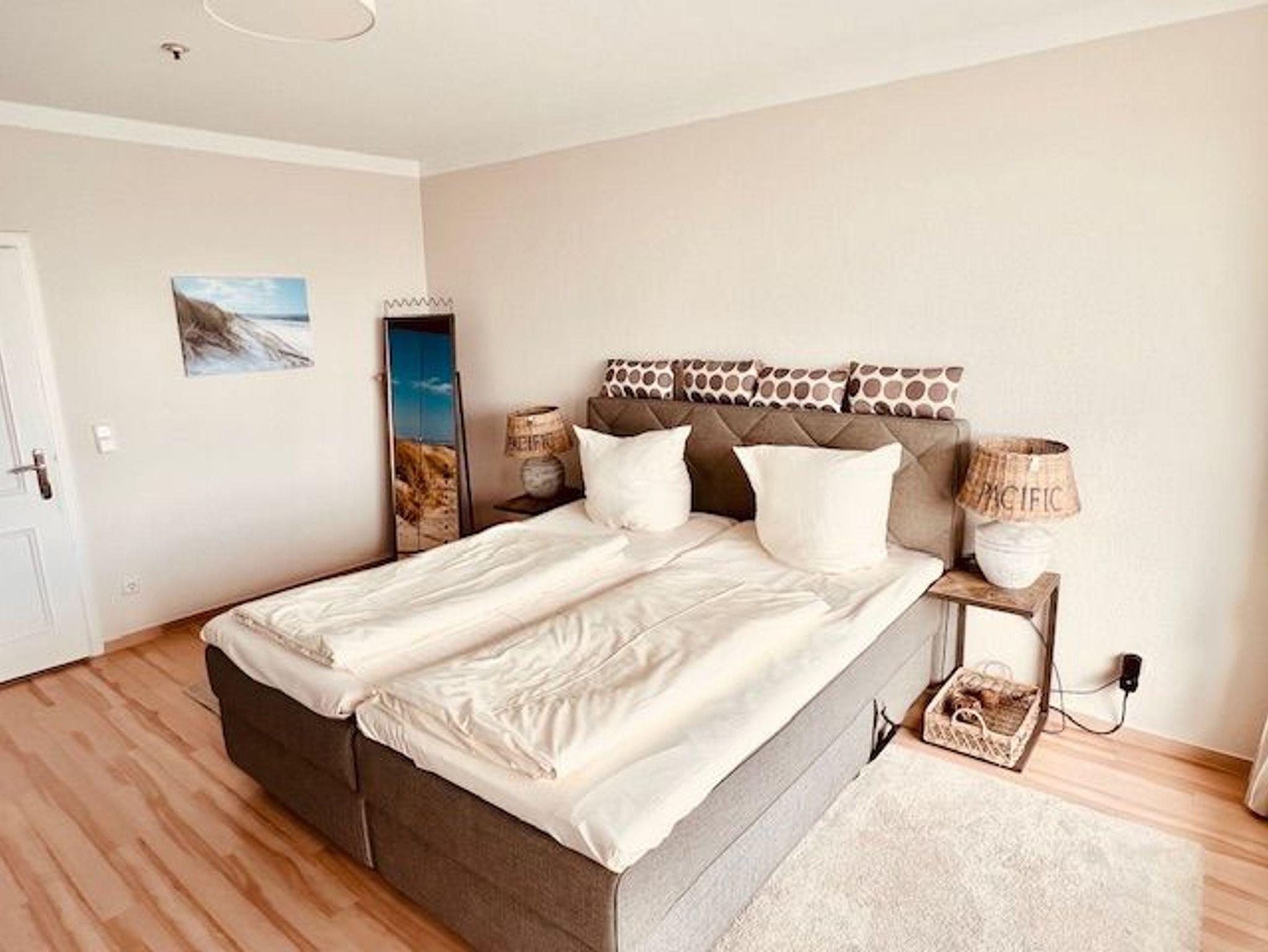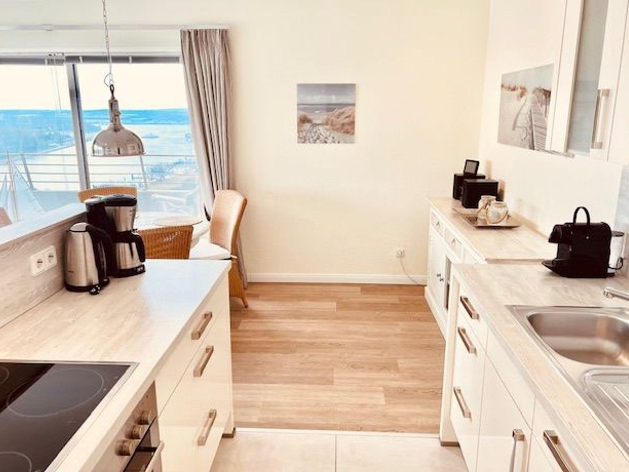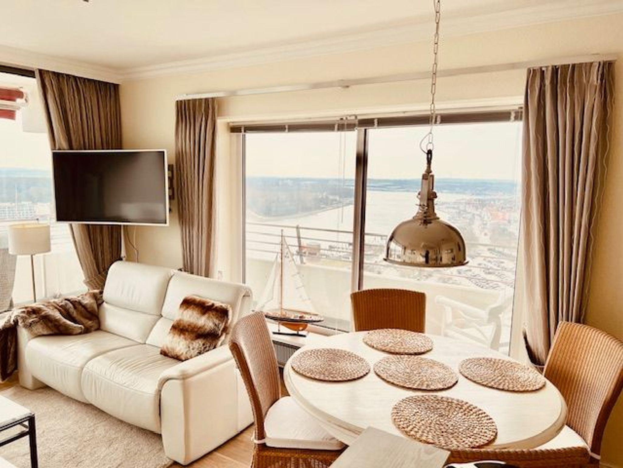 Dieses schöne Appartement in traumhafter Lage mit einer hochwertigen und stilvollen Inneneinrichtung ist einmalig. Hier verbringen Sie eine unvergessliche Zeit und können sich, fern vom stressigen Alltag, wunderbar entspannen. Der Wohnraum ist mit einer zweiteiligen Couchgarnitur, einem Couchtisch sowie einem Esstisch mit vier Stühlen ausgestattet. Gegenüber befindet sich die voll ausgestattete, offene Küche. Im Schlafzimmer befinden sich ein bequemes Boxspringbett (2x 100 cm x 200 cm) und eine großzügige Schrankwand mit spektakulärem Fotomotiv. Vom Flur abgehend gelangen Sie in das moderne Duschbad. Den sonnigen Balkon erreichen Sie vom Wohn- und Schlafzimmer. Hier genießen Sie den Ausblick zur Mecklenburger Bucht, zur Altstadt und zur Trave mit lebhaftem Schiffsverkehr.