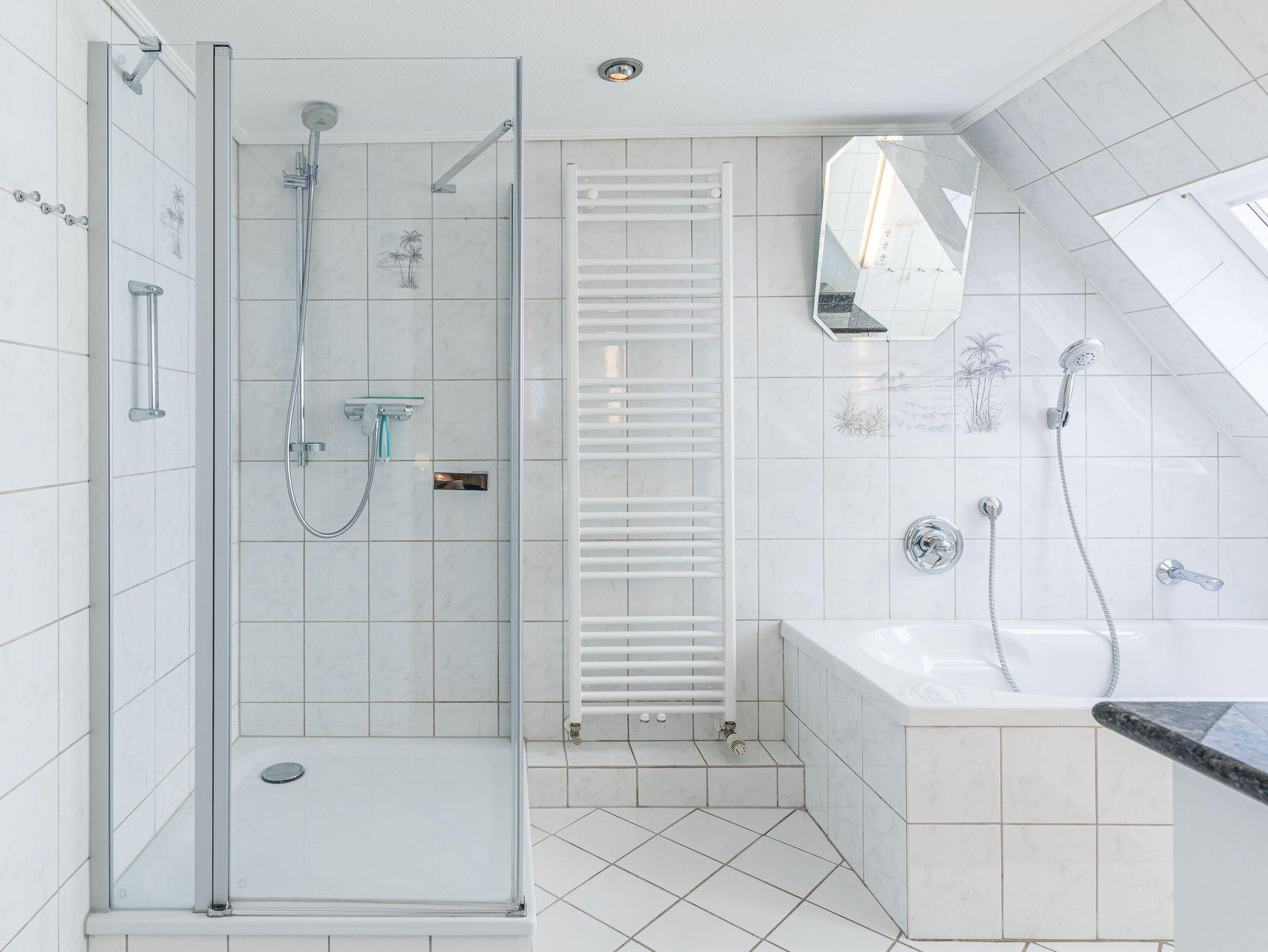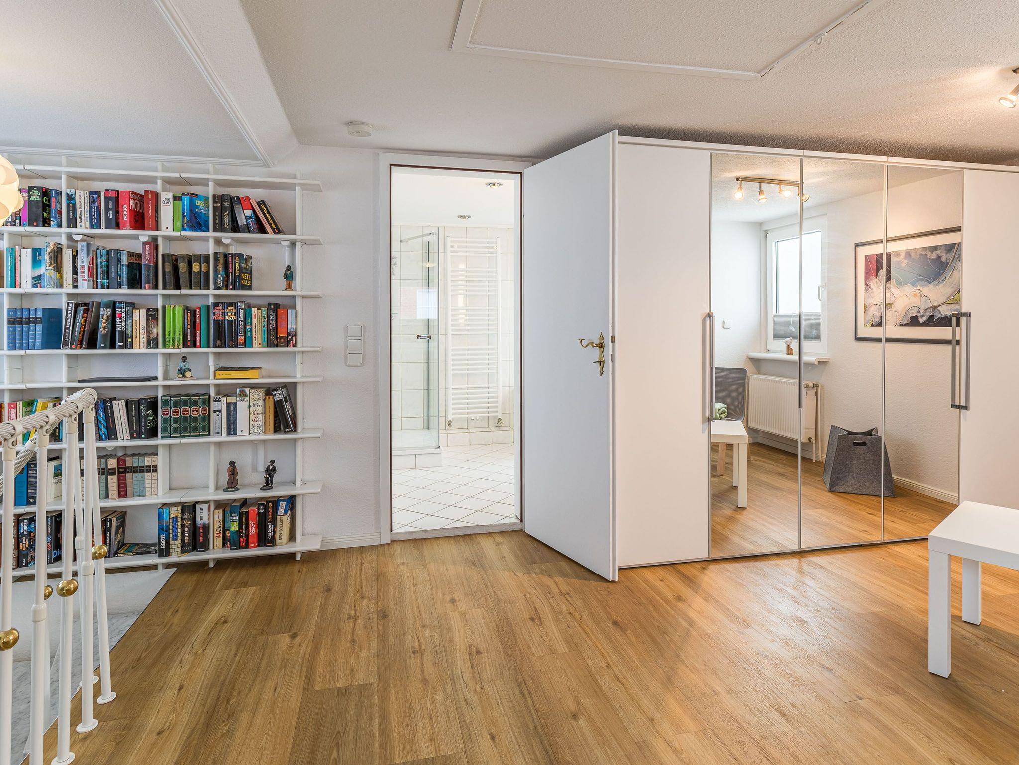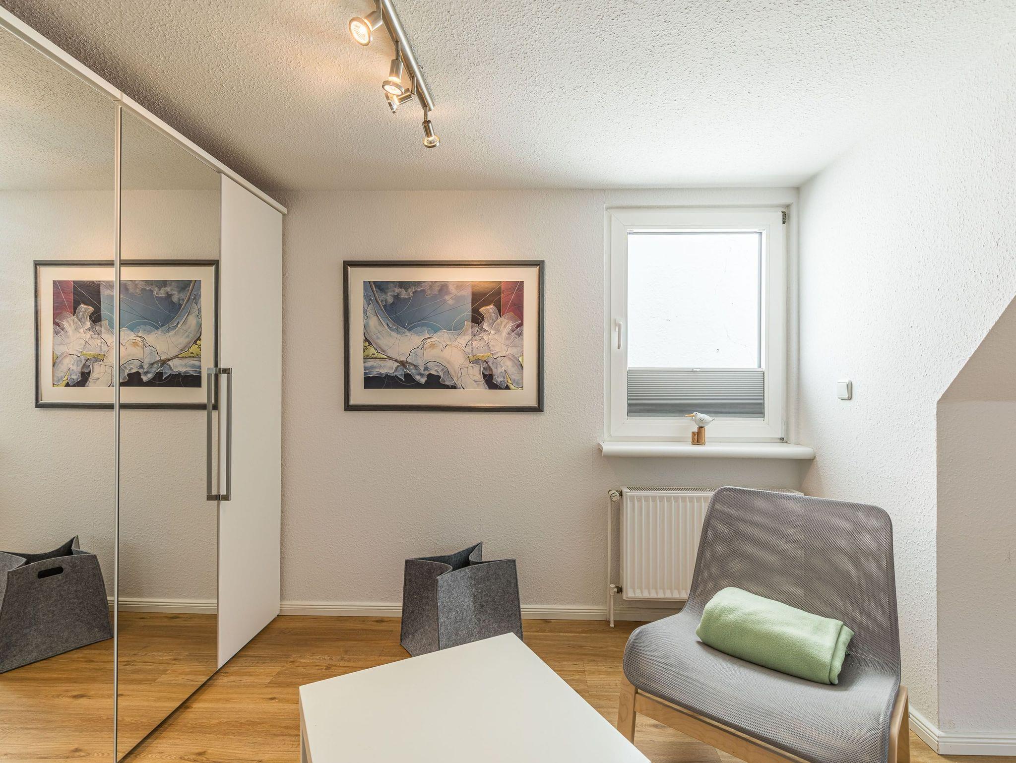 Das behagliche Wohnzimmer ist mit einer Couchgarnitur, einem Tisch und einer Anrichte ausgestattet und lädt zu gemütlichen Abenden ein. Die hochwertige Küche mit Geschirrspüler und Mikrowelle ist direkt vom geräumigen Flur aus erreichbar. Im Obergeschoss befinden sich das moderne Duschvollbad/WC sowie das schöne Schlafzimmer mit großem Kleiderschrank. Zusätzlich steht im Erdgeschoss ein Gäste-WC zur Verfügung.