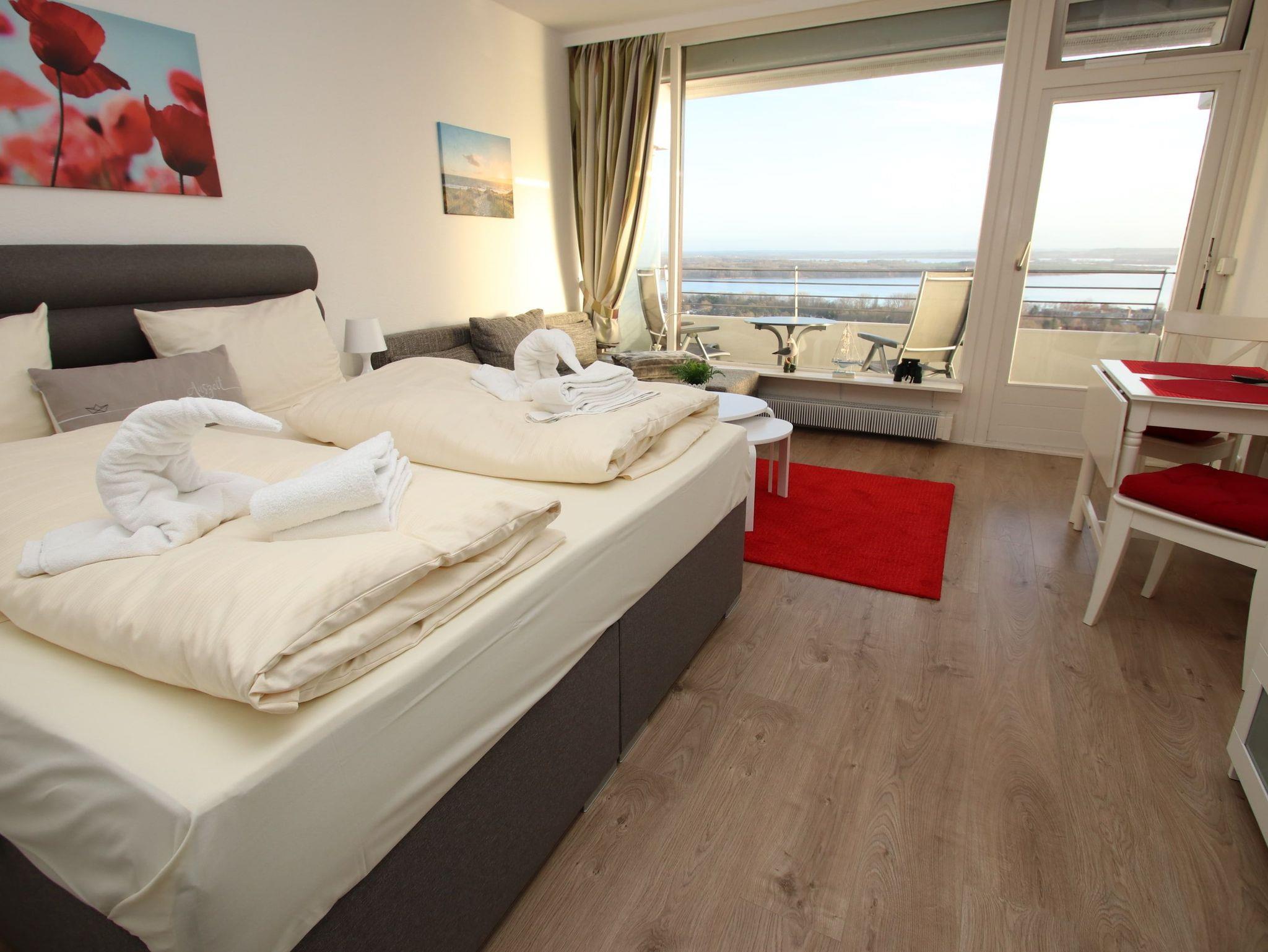 Dieses hochwertige Appartement entspricht allen Ansprüchen und lädt von Anfang an zum Wohlfühlen ein. Der helle Wohnraum besteht aus einem komfortablen Doppelbett (2 x 90 cm x 200 cm) und einer schönen Couch mit Tisch. Des Weiteren gehören zu der geschmackvollen Einrichtung eine Essecke mit Stühlen und ein Kleiderschrank. Der gesamte Wohnbereich ist mit einem Fußboden in Holzoptik ausgestattet. Die moderne Küche ist im Eingangsbereich integriert. Das luxuriöse Duschbad erreichen Sie vom Flur. Diese fantastische Wohnung bietet ideale Voraussetzungen für einen erholsamen Urlaub. Vom Balkon genießen Sie einen traumhaften Blick auf die Mecklenburger Bucht und auf die Trave mit ein- und ausfahrendem Schiffsverkehr.