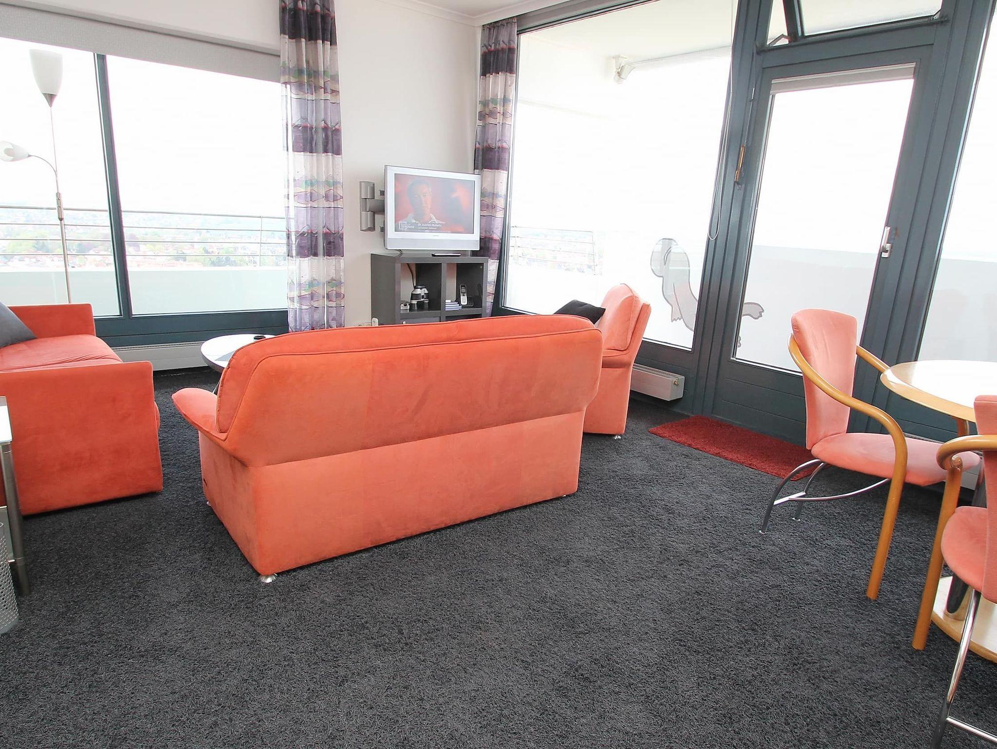 Umlaufende Loggia von ca. 21 m², Markise, Küche, Geschirrspüler, Mikrowelle, Duschvollbad/WC, Fön, 2x TV, Stereoanlage, Telefon, kostenl. W-Lan, Aufzug, inkl. Tiefgaragenstellplatz (Einfahrtshöhe: 1,85 m).