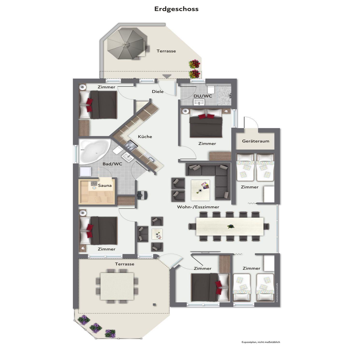 Das Ferienhaus bietet auf großzügigen 121 m² Platz für bis zu 12 Personen und eignet sich wunderbar für einen Familienurlaub oder Urlaub mit Freunden. Es verfügt über insgesamt 6 Schlafräume:
