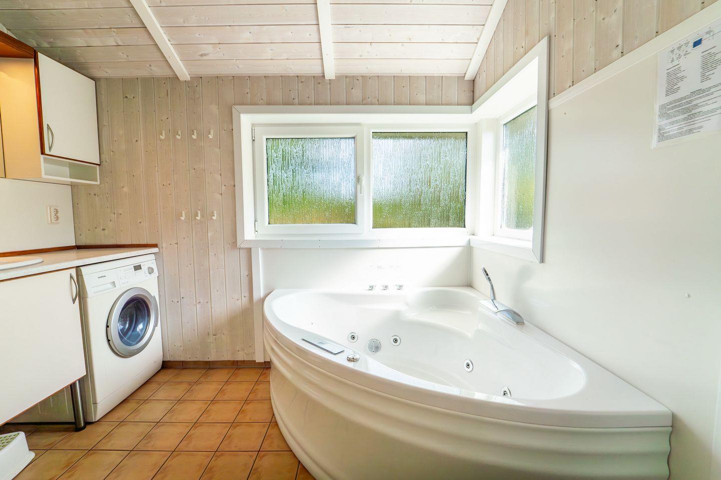 Das Badezimmer bietet eine Sauna, einen Whirlpool (für bis zu 2 Personen), eine bodengleiche Dusche, WC und ein Waschbecken. Die Fenster im Bad sind mit Fliegengittern ausgestattet.