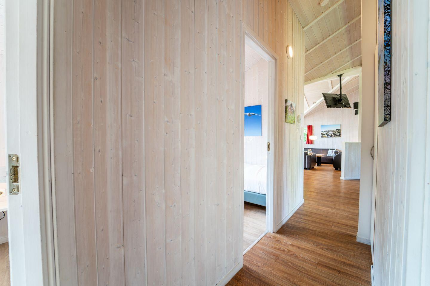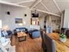 Gläsern, lichtgewaltig und freundlich: Die großartige Glasfront sorgt für eine besondere Atmosphäre im Ferienhaus. Ein weiterer Hingucker ist der Internet-Flachbildfernseher, der gut ersichtlich oben an der Decke angebracht ist.