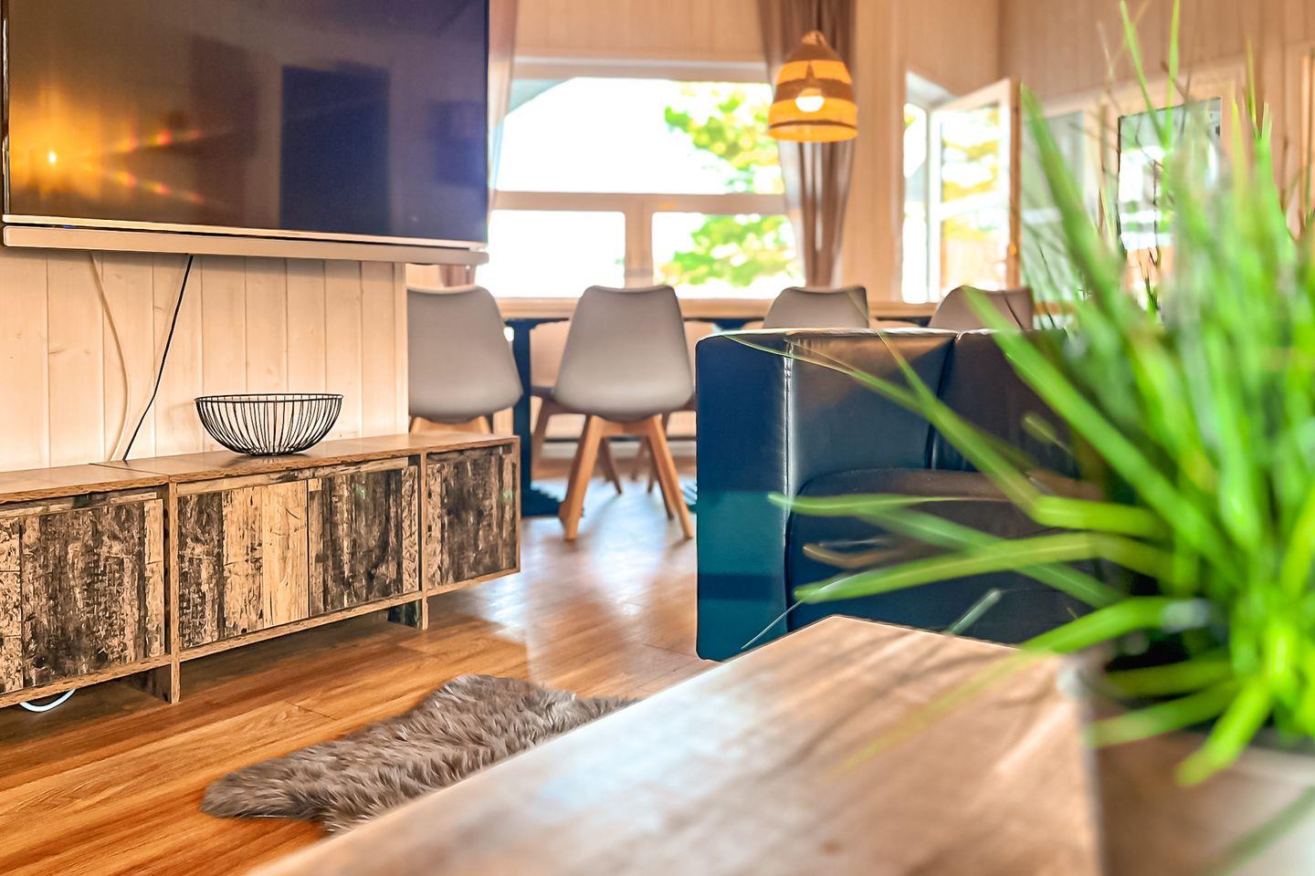 Der offene Wohn- und Essbereich ist der perfekte Ort, um zusammenzukommen. Zwei Sofaecken und ein einladender Essbereich schaffen eine gemütliche Atmosphäre. Der Kaminofen sorgt für wohlige Wärme, während der Flachbild-TV, das Radio mit CD-Spieler und der DVD-Player für Unterhaltung sorgen. Große Fenster mit Vorhängen garantieren eine angenehme Privatsphäre.