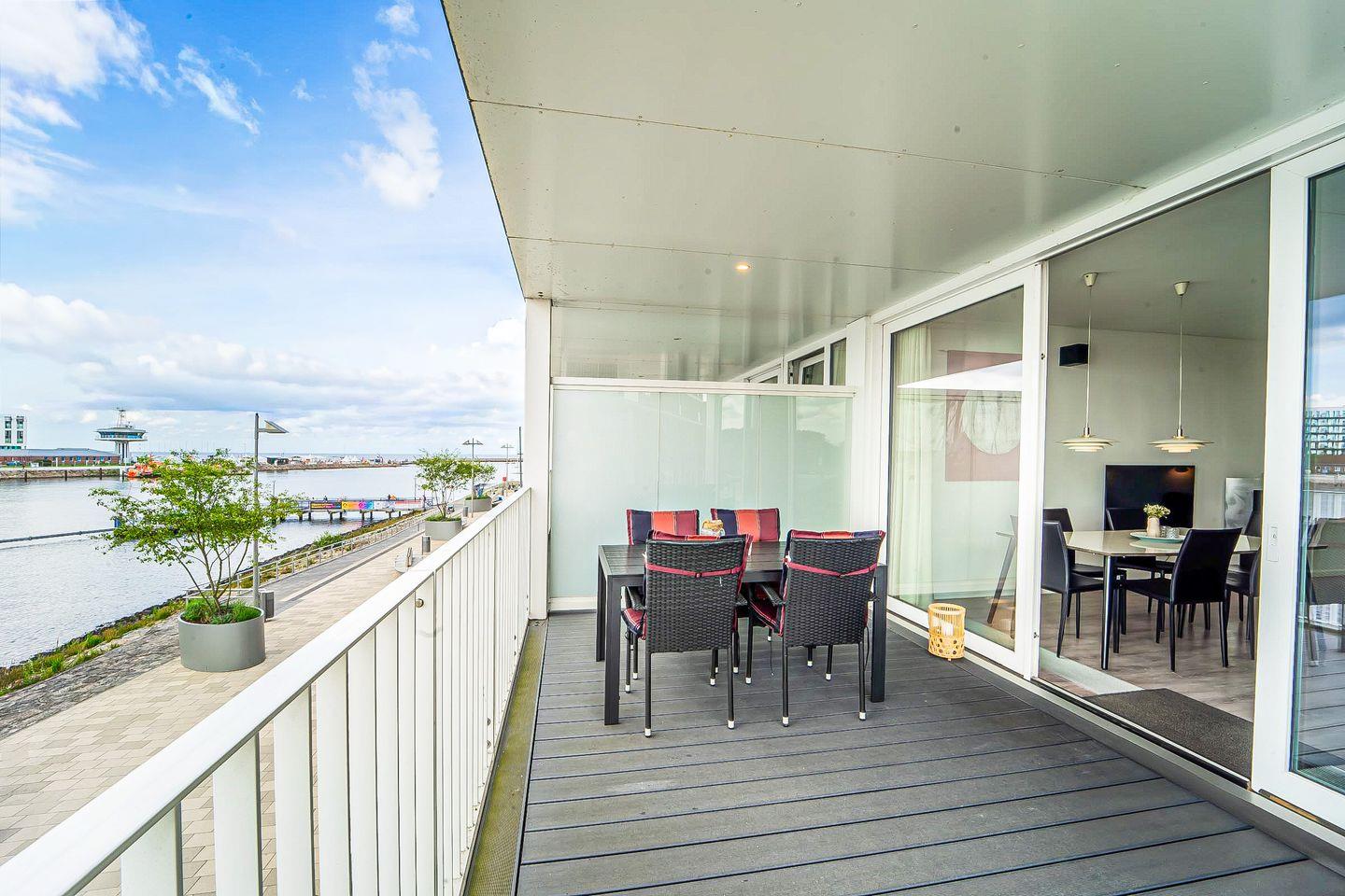 Der lichtdurchflutete Wohnbereich ist mit Sofa, Sesseln, HiFi-Anlage, zwei Flachbild-TVs und einem Schreibtisch ausgestattet. Für gemütliche Stunden sorgt der Bioethanolkamin, der eine besonders behagliche Atmosphäre schafft. Durch die großen Panoramafenster genießt Du von hier aus den eindrucksvollen Ausblick auf den Segelhafen, die Travemündung, das Museumsschiff „Passat“ und die vorbeiziehenden Skandinavienfähren.