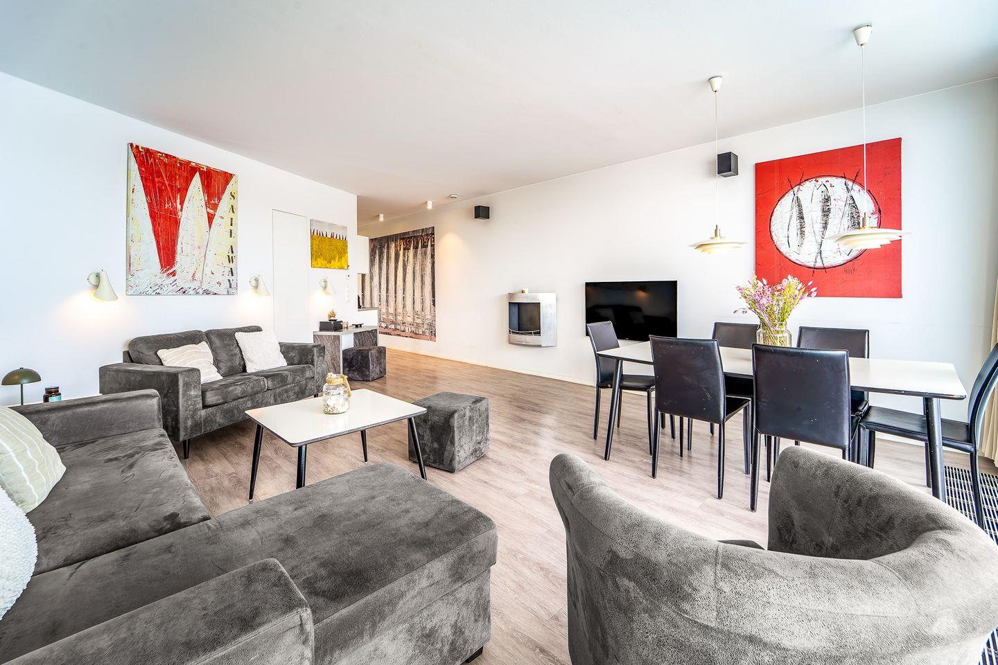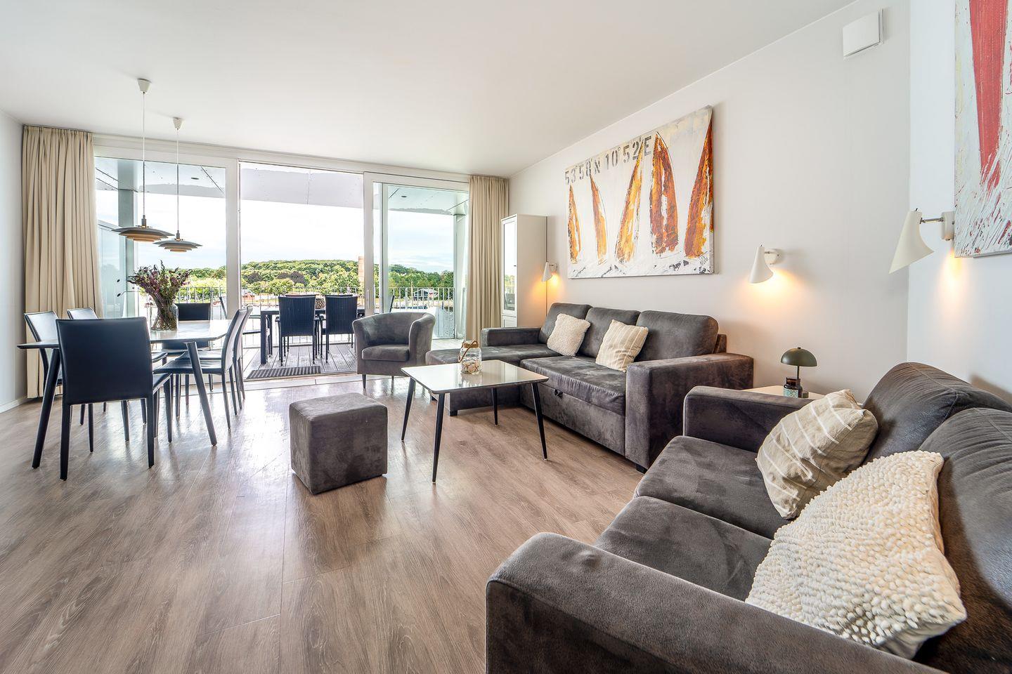 Der Wohnbereich ist hochwertig ausgestattet mit Sofa, Sesseln, HiFi-Anlage, Blu-ray-Player und einem Flachbild-TV. Für stimmungsvolle Abende sorgt der Bioethanolkamin, der den Raum in gemütliches Licht taucht. Durch die Panoramafenster und vom Sofa aus hast Du einen beeindruckenden Blick auf den Segelhafen, die Travemündung, das Museumsschiff „Passat“ und die vorbeiziehenden Skandinavienfähren.