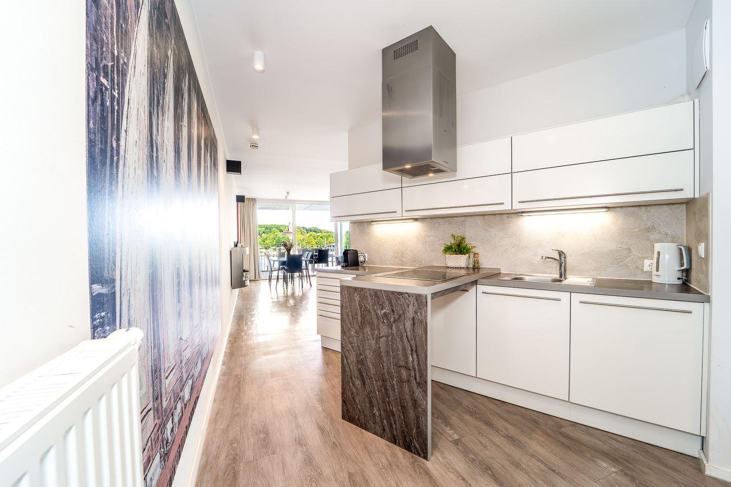 Die offene Küche ist bestens ausgestattet mit 4-Platten-Herd, zusätzlichem Wok-Kochfeld, Backofen, Kühlschrank mit Gefrierfach, Geschirrspüler, Mikrowelle, Toaster, Wasserkocher, Kaffeemaschine und Nespresso-Maschine. Geschirr, Besteck und Kochutensilien sind selbstverständlich vorhanden.