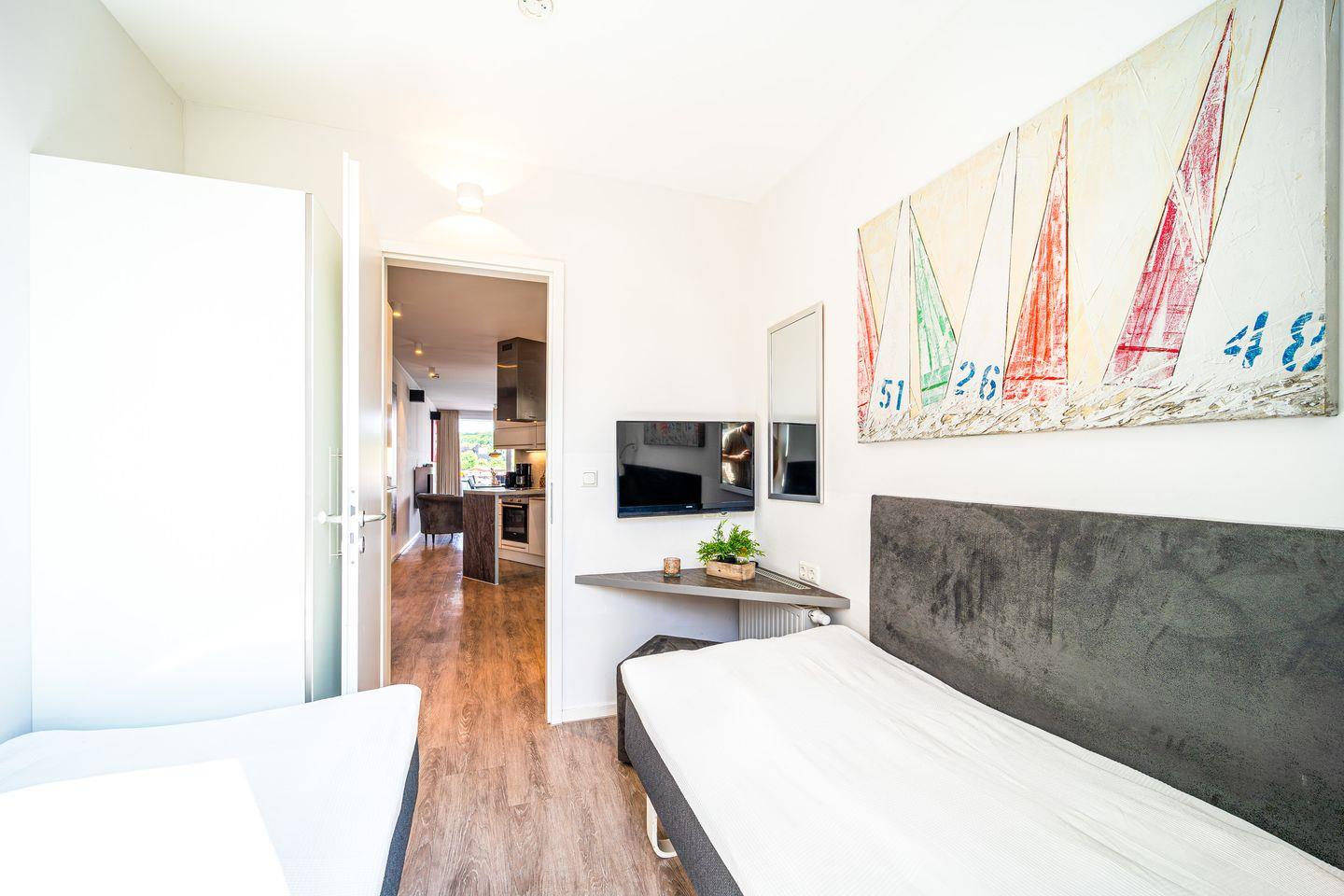 In den beiden separaten Schlafzimmern findest Du komfortable Betten, ausreichend Stauraum und je einen eigenen Fernseher – perfekt für entspannte Stunden im privaten Rückzugsbereich.