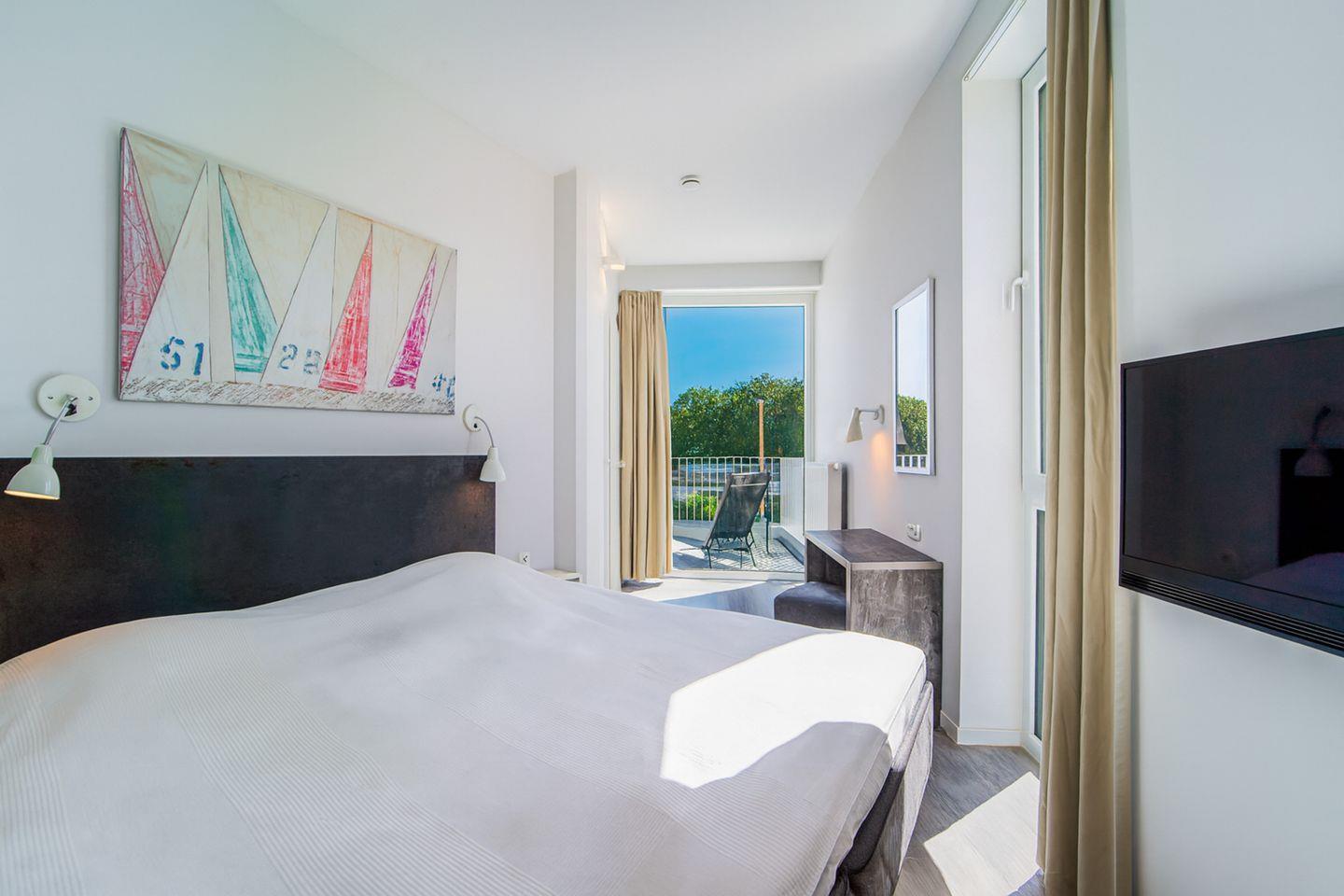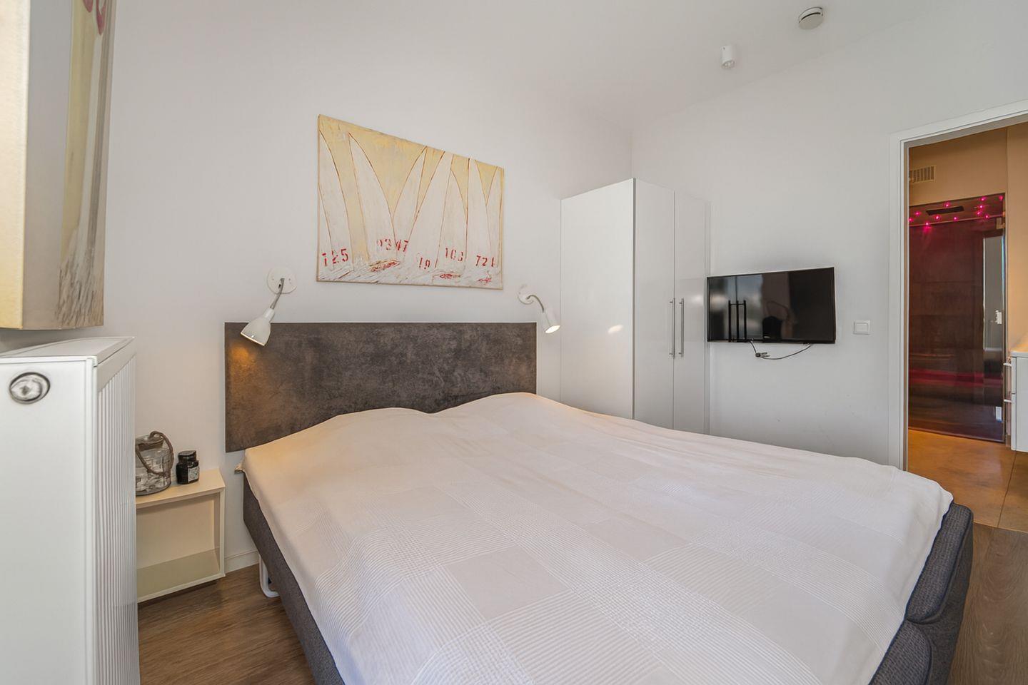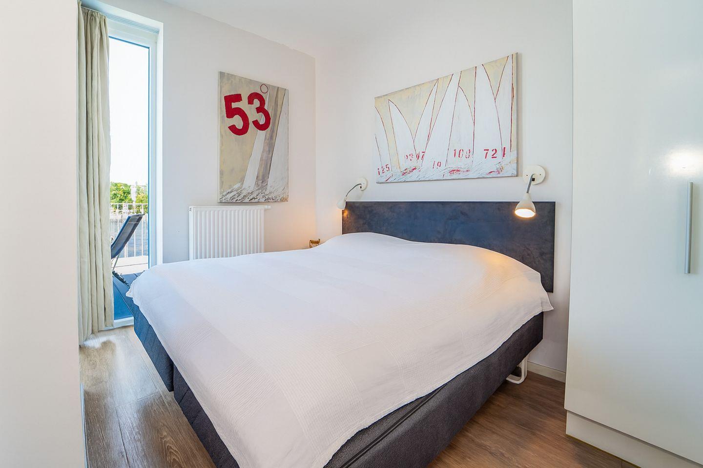 Die Penthousewohnung verfügt über zwei separate Schlafzimmer mit komfortablen Betten und viel Stauraum. Eines der Schlafzimmer hat eine direkte Terrassentür, sodass Du gleich am Morgen frische Seeluft genießen kannst. Von hier aus gelangst Du auch direkt in ein luxuriöses Badezimmer.