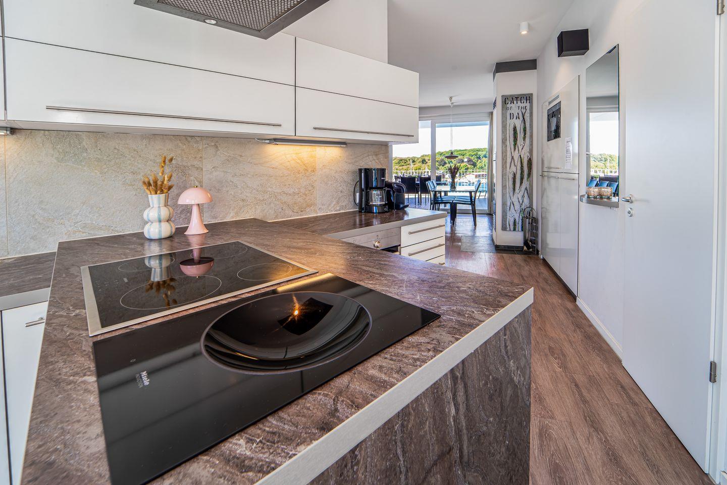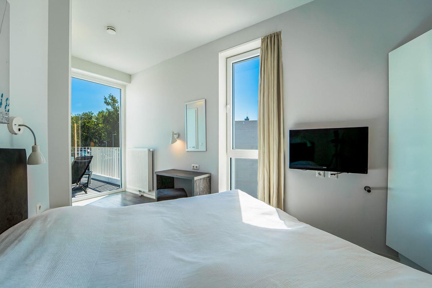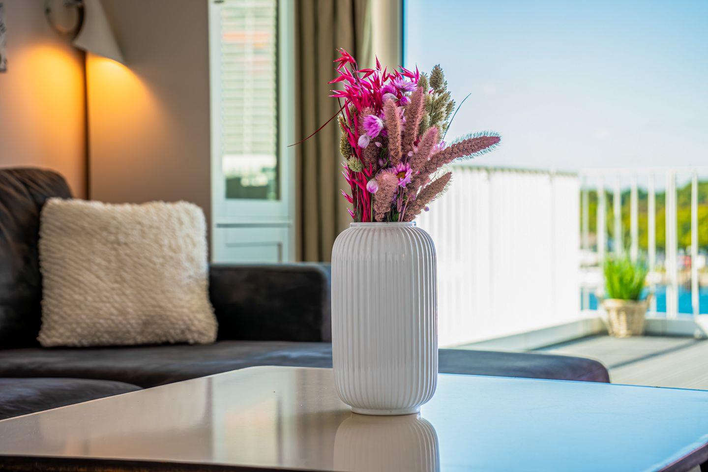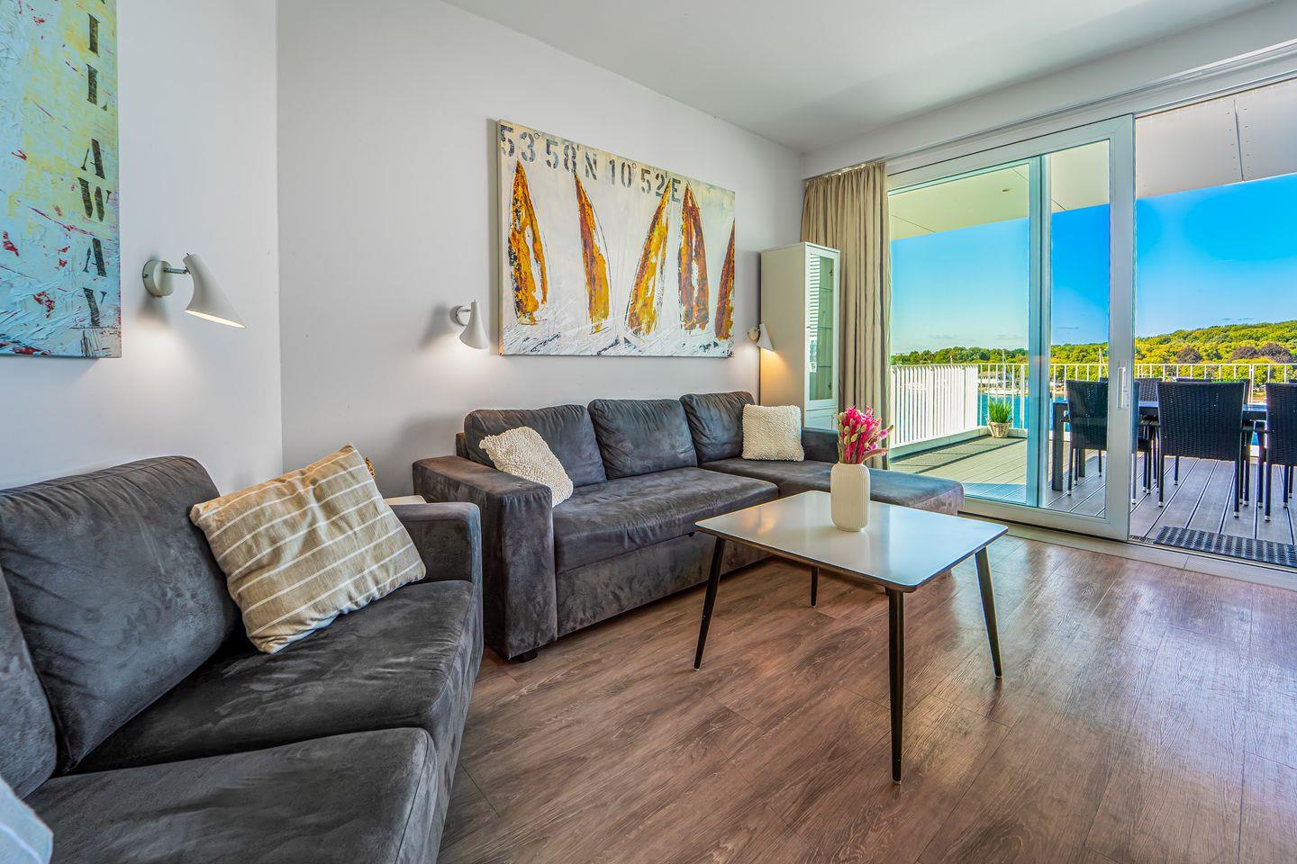Die Penthousewohnung verfügt über zwei separate Schlafzimmer mit komfortablen Betten und viel Stauraum. Eines der Schlafzimmer hat eine direkte Terrassentür, sodass Du gleich am Morgen frische Seeluft genießen kannst. Von hier aus gelangst Du auch direkt in ein luxuriöses Badezimmer.