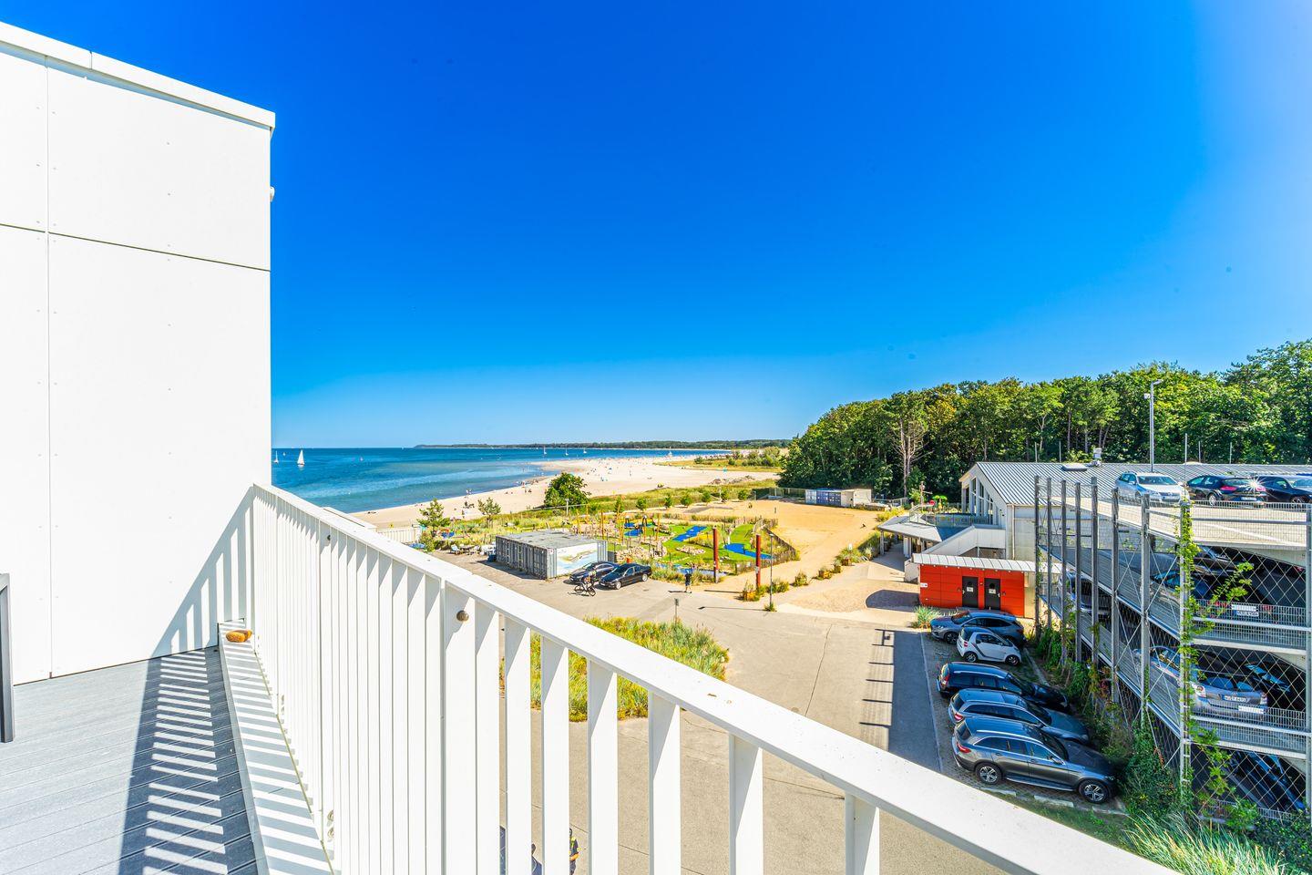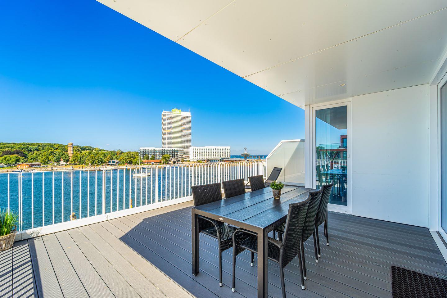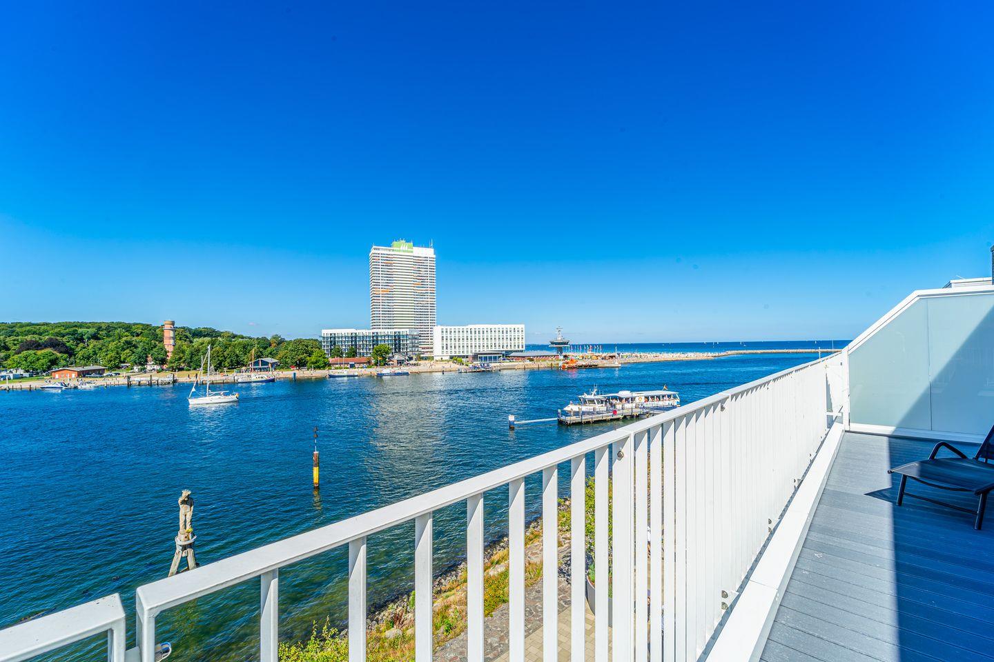 Die Dachterrassen bieten Dir einen einzigartigen Rundumblick: Auf der einen Seite schaust Du weit über den feinsandigen Strand und die Ostsee, auf der anderen Seite über den Segelhafen, die Travemündung, das Museumsschiff „Passat“ sowie die vorbeiziehenden Skandinavienfähren – ein Panorama, das seinesgleichen sucht. Mit Gartenmöbeln und Sonnenliegen ausgestattet, sind sie der perfekte Ort, um die frische Seeluft zu genießen, Sonne zu tanken und den unvergleichlichen Weitblick auszukosten.